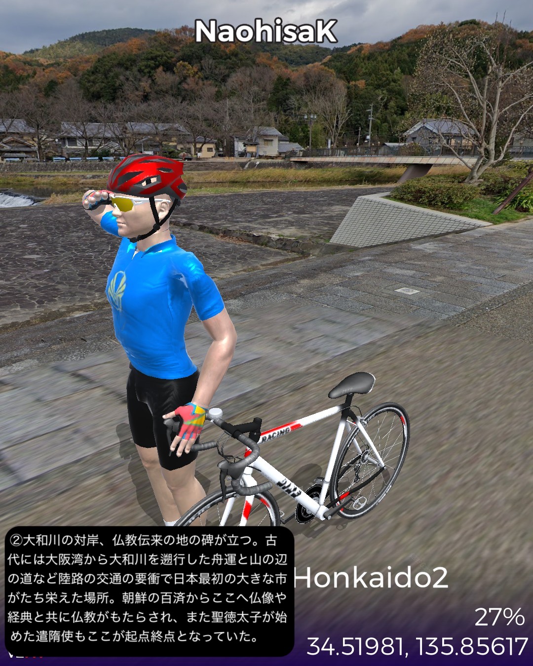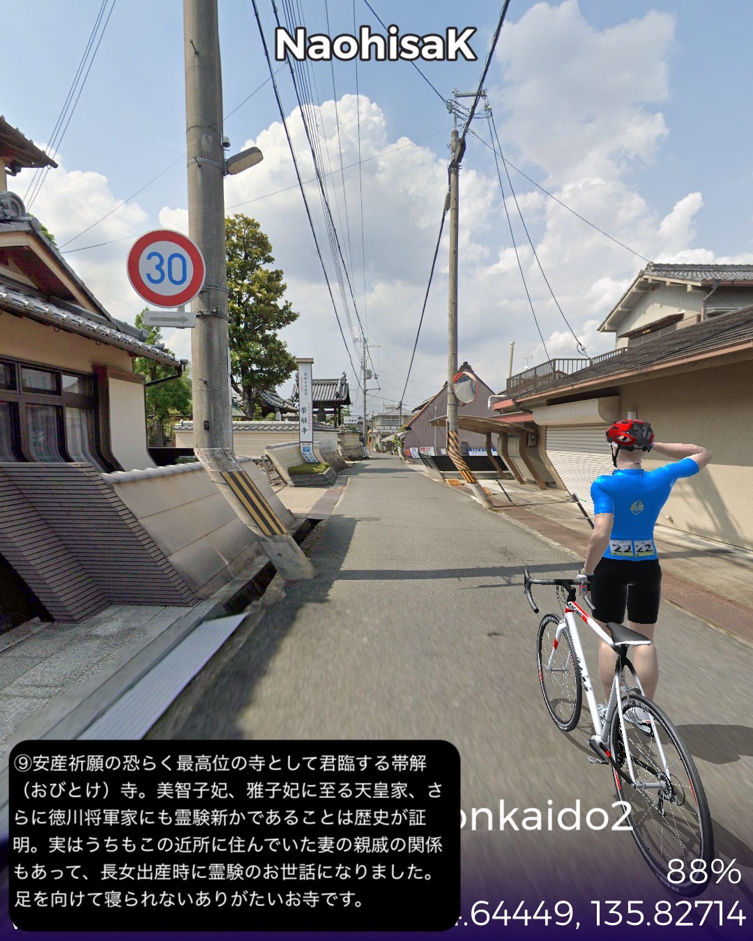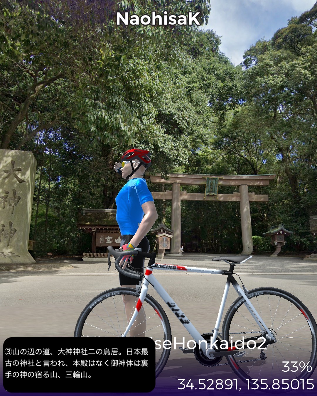 VRサイクリング 伊勢本街道2日目。と言いつつ今回も脱線寄り道大会。橿原神宮を出発し、平城京遷都前の都があった藤原宮跡を経て桜井市街を抜け、三輪山の麓の山の縁を北上する古道、山の辺の道を進み、日本最大の宗教都市天理からようやく本来の街道、伊勢本街道を進み奈良の猿沢池をゴールとする36kmの行程。中々贅沢な行程であった。まずは明日香にほど近い場所、飛鳥時代から奈良時代へのステップと位置付けられる初めての中国式の都、藤原宮跡でその前の飛鳥宮と一線を画す壮大さを実感する。古い街並みの桜井市街を通り抜け、古代の道、山の辺の道に入る。基本的にハイキングコースなのでストリートビューを完備したルートとして設定しきれないがそれでも結構かなりの部分をルートとして収録できた。リアルに訪れたことはないが、歴史ある寺社が散りばめられ、きつい山道はなく長閑な麓と田園の田舎道はほっこりする道筋だ。山の辺の道を外れ天理市街に入ると、天理教本部の壮大な伽藍とだだっ広い広場にびっくり。北京とかモスクワに来たみたい。天理市内には信者用と思われる天理教仕様の屋根庇付きのアパート・マンションがあちこちに建っていてココは何処?感が半端ない。天理からは今回初めて伊勢本街道に戻り奈良を目指すが、天理・奈良の10km弱の街道筋は周囲が田園が広がっているのに古い家並がびっちり建ち並び街道筋がいかに栄えていたかよくわかる。特にゴール直前、奈良の旧市街、ならまちの伝統的な町屋の街並みが素晴らしい。今回は名所てんこ盛りで入れきれなくて残念な場所も多かった。次回は奈良街道で再度京都を目指す。