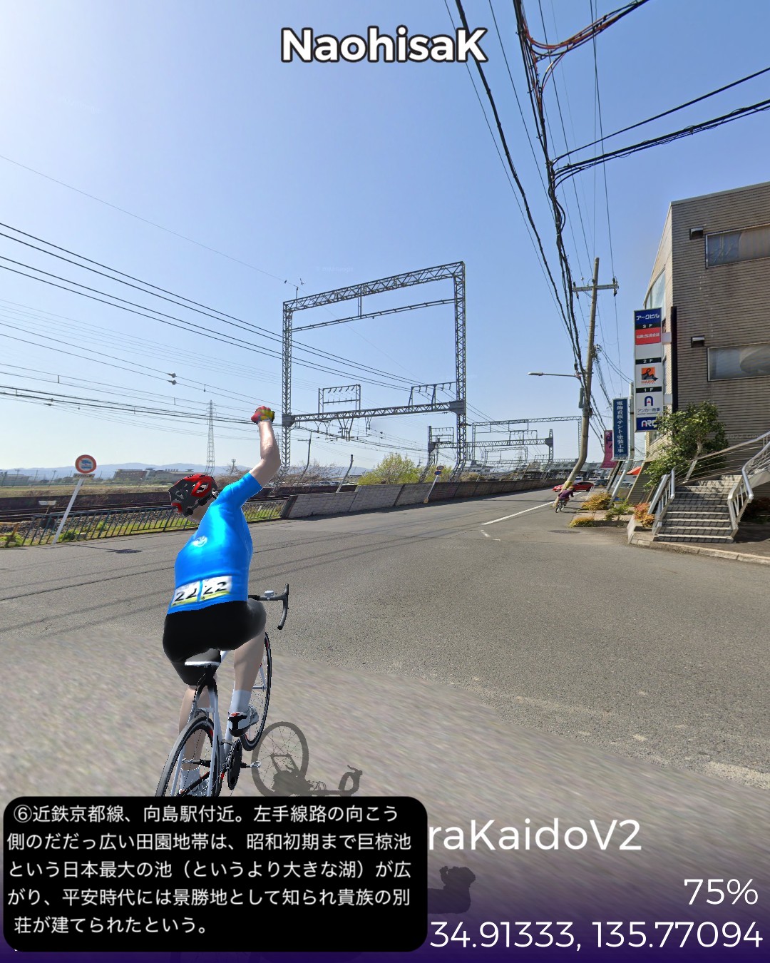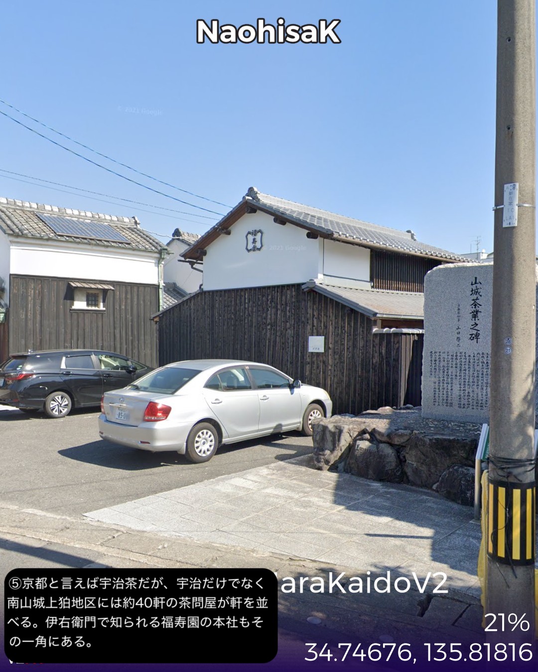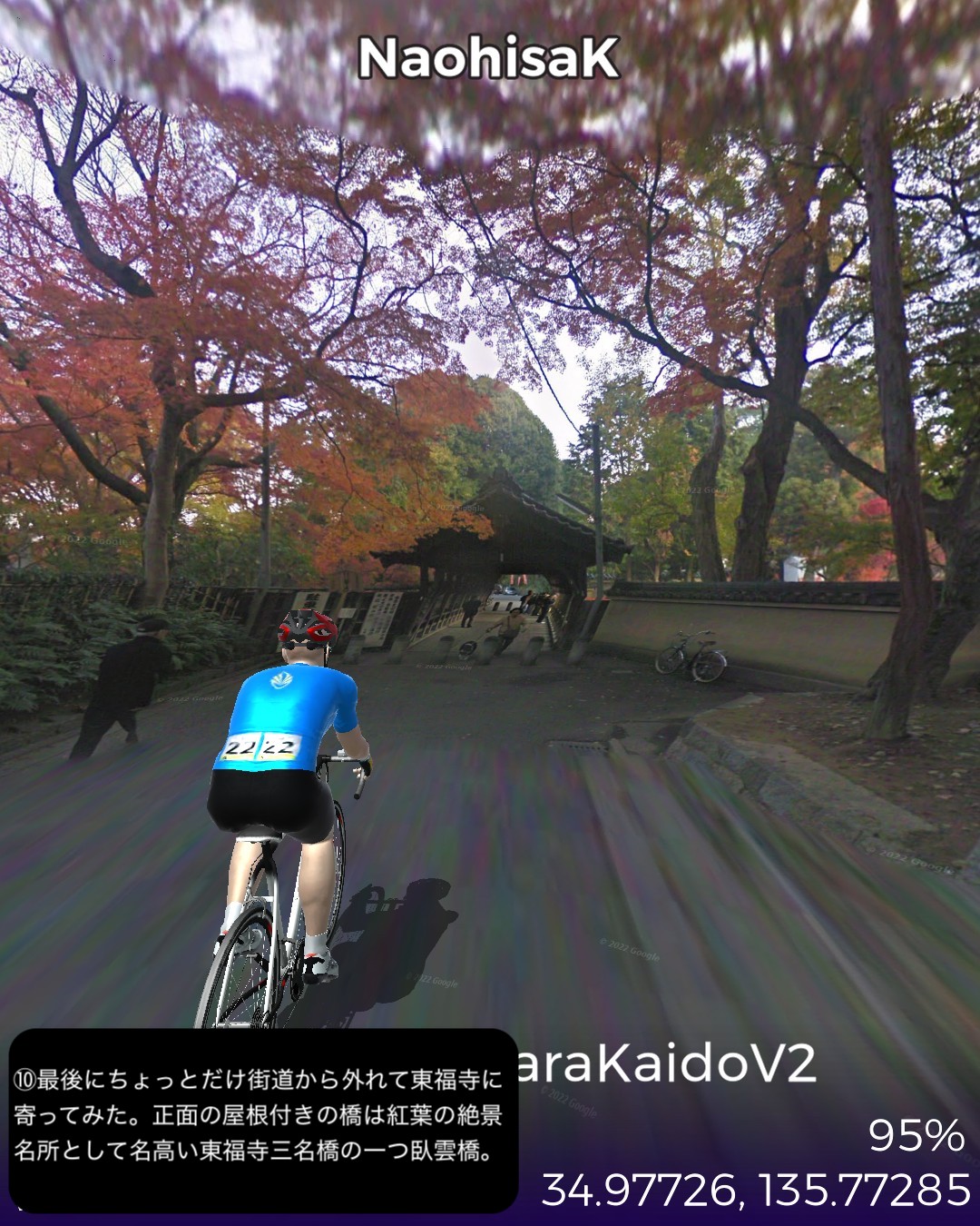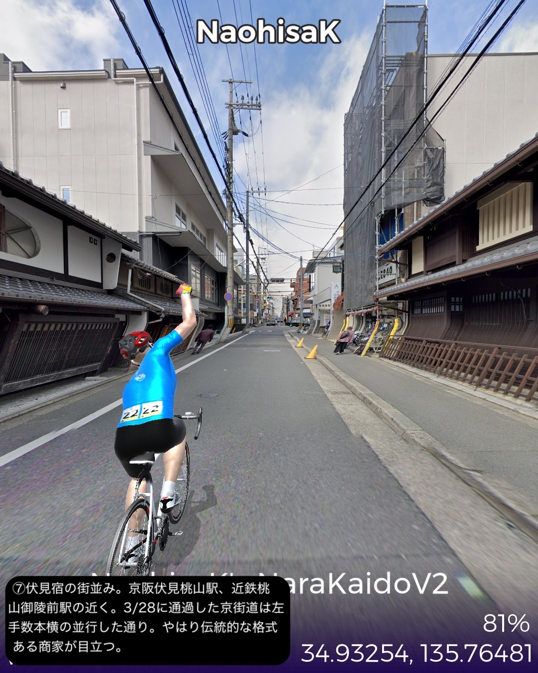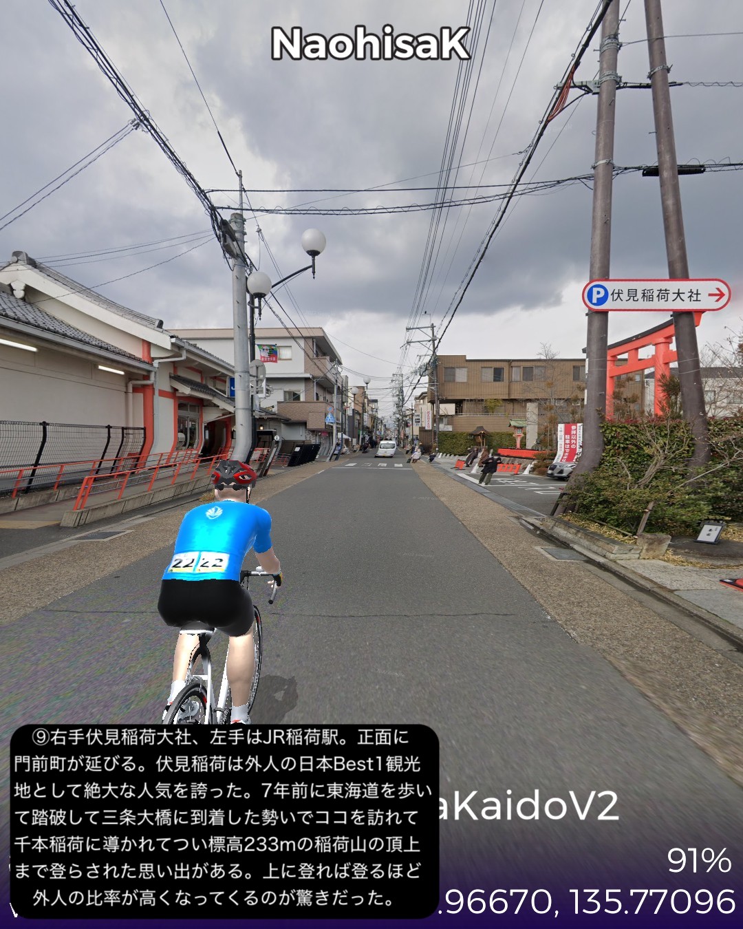 VRサイクリング 奈良街道。奈良は猿沢池をスタートし、東大寺と般若寺の脇を通り北上し一気に京都まで上る。奈良と京都の間は特にめぼしい史跡はなく地味に古い街並みと田園風景が交互に続く。宇治川を越え伏見の町に入ると京都の市街地。京阪線に沿って伏見稲荷大社と最後にちょっと東福寺に寄り道してゴールは京都駅八条口とした41kmの行程。奈良県から京都府に入ると宇治市にかけて街道沿いに製茶所や茶問屋を多く見かける。京都のお茶というと抹茶の宇治茶が思い浮かべるが、宇治だけでなく京都府の南部、南山城と呼ばれる地域全体が茶どころで、抹茶だけでなく煎茶やほうじ茶を生み出してきた地域のようだ。伊右衛門ブランドで知られる福寿園の本社も南山城地域の街道付近にあった。伏見宿は街道が錯綜していて3/28に通過した京街道も数本横の並行した通りであった。伏見稲荷大社は7年前に訪れて、稲荷山頂上まで千本稲荷に導かれて登らされてしまったが、上に登れば登るほど外人比率が高くなるのが面白かった。外人のJapan Best1観光地として絶大な人気を誇っていたんだけど今は様変わりしただろうな。京都へ戻ったところで次回以降どこへ進むか乞うご期待。
