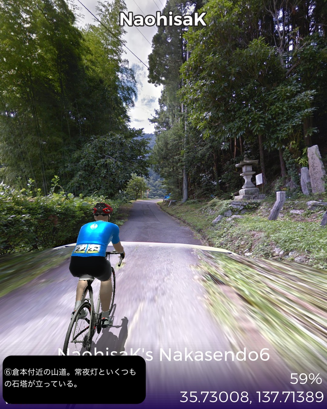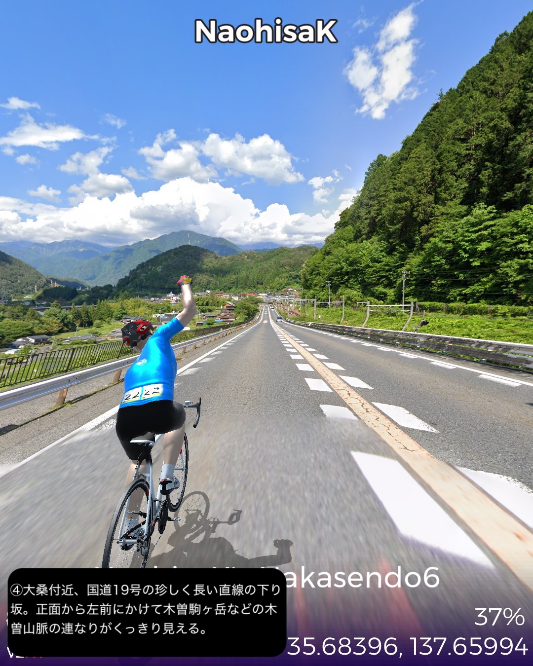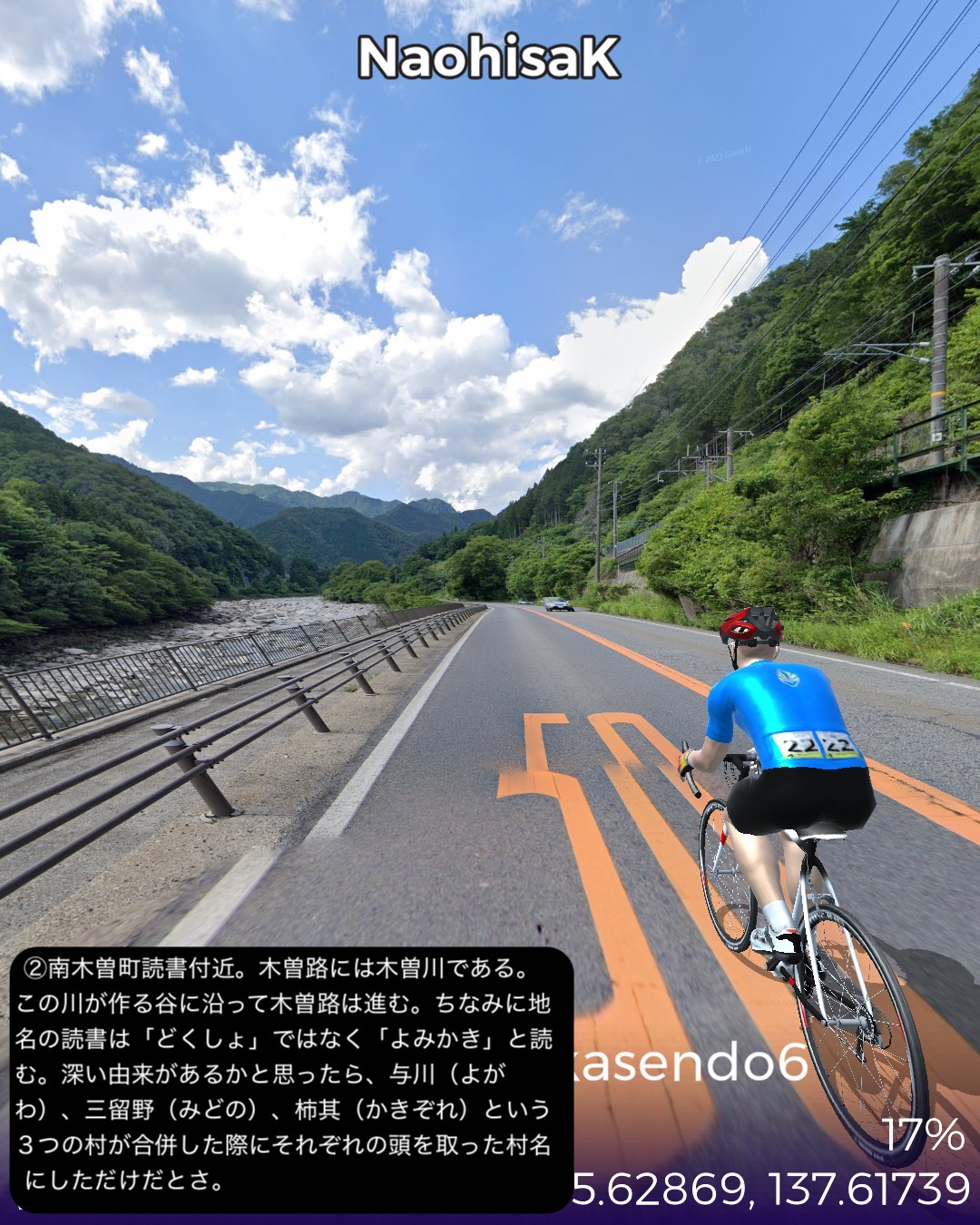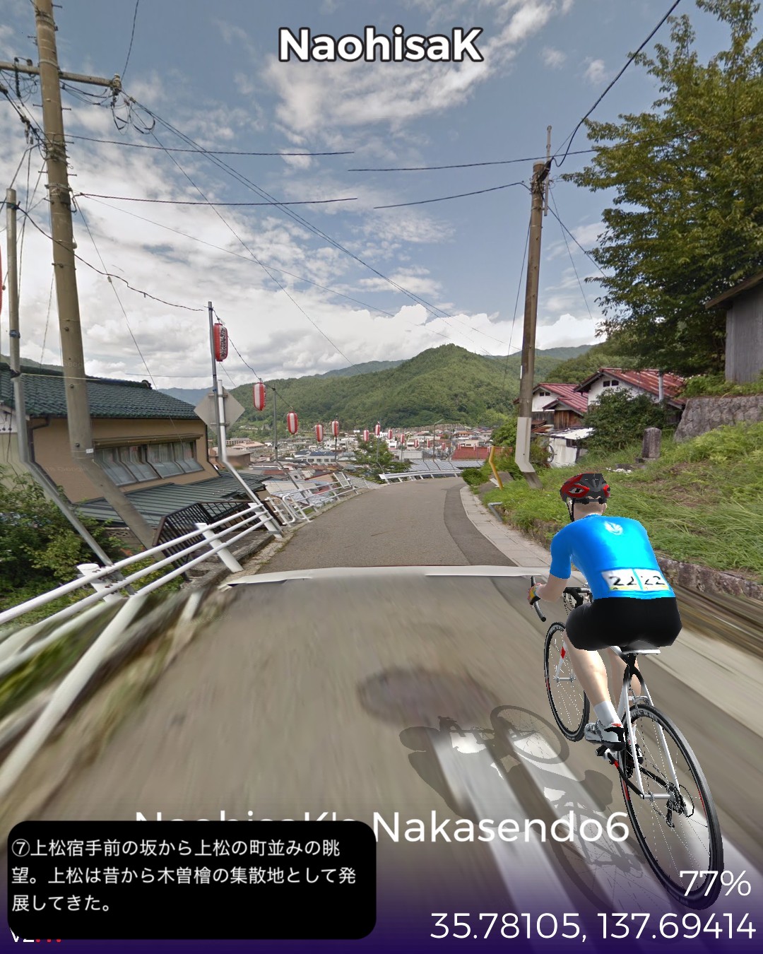 VRサイクリング、中山道6日目 木曽路をとにかく進んでゆくの巻。日本一の「映える」宿場町妻籠宿をでるとまもなく木曽谷。木曽川に沿ってひたすら山を切り進んで、三留野宿、野尻宿、須原宿と進み、日本五大名峡の1つ寝覚の床の横を通るも峡谷は観られないまま上松宿を経過し、ゴールの木曽の中心の町、福島宿へ辿り着く42kmの行程。前回までのドラマチックな展開はなくひたすら谷間の風景、たまに街道の古い家屋が並ぶ宿場町という変化のないルートではある。しかも狭い谷なので道のバリエーションがとれないせいか国道19号を走ることが多い。そういう意味では今までの中山道に比べると若干面白みに欠けるルートであったが最後に見るべき町があった。ゴールの木曽福島は木曽川とその支流の八沢川の間の狭い河岸段丘に発達した宿場町で地形的にも町の造り的にもユニークでしかも伝統的文化に彩られた雰囲気にあふれて面白い。実は木曽福島はつい5ヶ月前にリアルに訪れたばかりであった。中山道は6年ほど前に東京日本橋を出て少しずつ進んできて木曽福島に到達したばかりなのだ。よって中山道の西ルートで進んできたVRサイクリングと東ルートで進んできたリアル街道歩きが今日木曽福島にてぶつかったというわけだ。これからの中山道はリアルに歩いてきた道を逆に走ってゆくことになる。まだまだ木曽路は続く。リアルの記憶もあって木曽路はちょっと飽きてきたなあ。