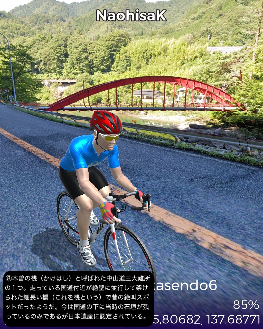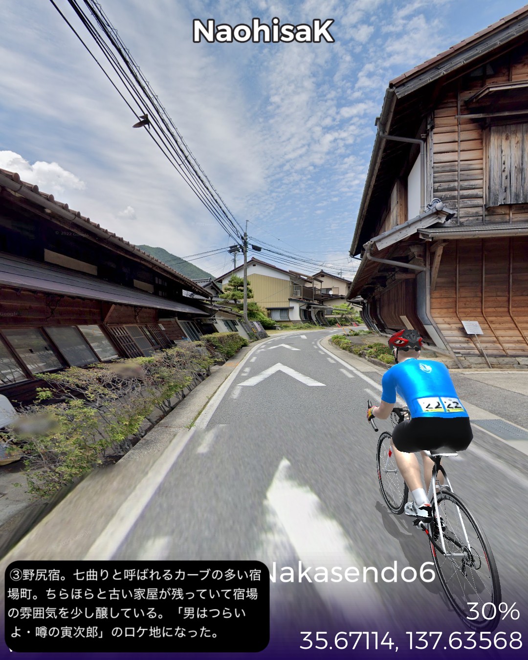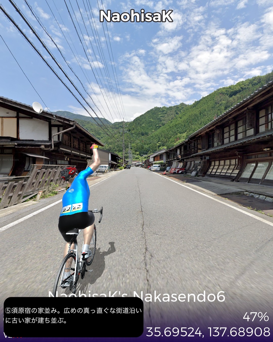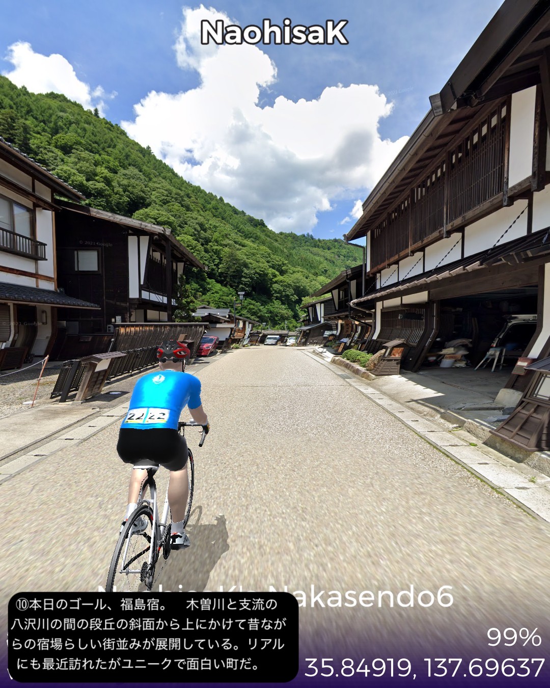 VRサイクリング、中山道6日目 木曽路をとにかく進んでゆくの巻。日本一の「映える」宿場町妻籠宿をでるとまもなく木曽谷。木曽川に沿ってひたすら山を切り進んで、三留野宿、野尻宿、須原宿と進み、日本五大名峡の1つ寝覚の床の横を通るも峡谷は観られないまま上松宿を経過し、ゴールの木曽の中心の町、福島宿へ辿り着く42kmの行程。前回までのドラマチックな展開はなくひたすら谷間の風景、たまに街道の古い家屋が並ぶ宿場町という変化のないルートではある。しかも狭い谷なので道のバリエーションがとれないせいか国道19号を走ることが多い。そういう意味では今までの中山道に比べると若干面白みに欠けるルートであったが最後に見るべき町があった。ゴールの木曽福島は木曽川とその支流の八沢川の間の狭い河岸段丘に発達した宿場町で地形的にも町の造り的にもユニークでしかも伝統的文化に彩られた雰囲気にあふれて面白い。実は木曽福島はつい5ヶ月前にリアルに訪れたばかりであった。中山道は6年ほど前に東京日本橋を出て少しずつ進んできて木曽福島に到達したばかりなのだ。よって中山道の西ルートで進んできたVRサイクリングと東ルートで進んできたリアル街道歩きが今日木曽福島にてぶつかったというわけだ。これからの中山道はリアルに歩いてきた道を逆に走ってゆくことになる。まだまだ木曽路は続く。リアルの記憶もあって木曽路はちょっと飽きてきたなあ。