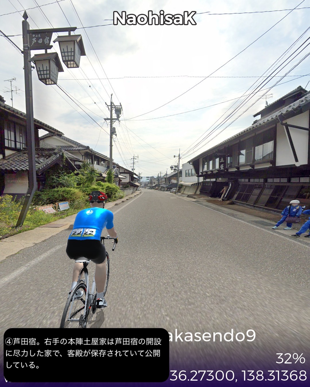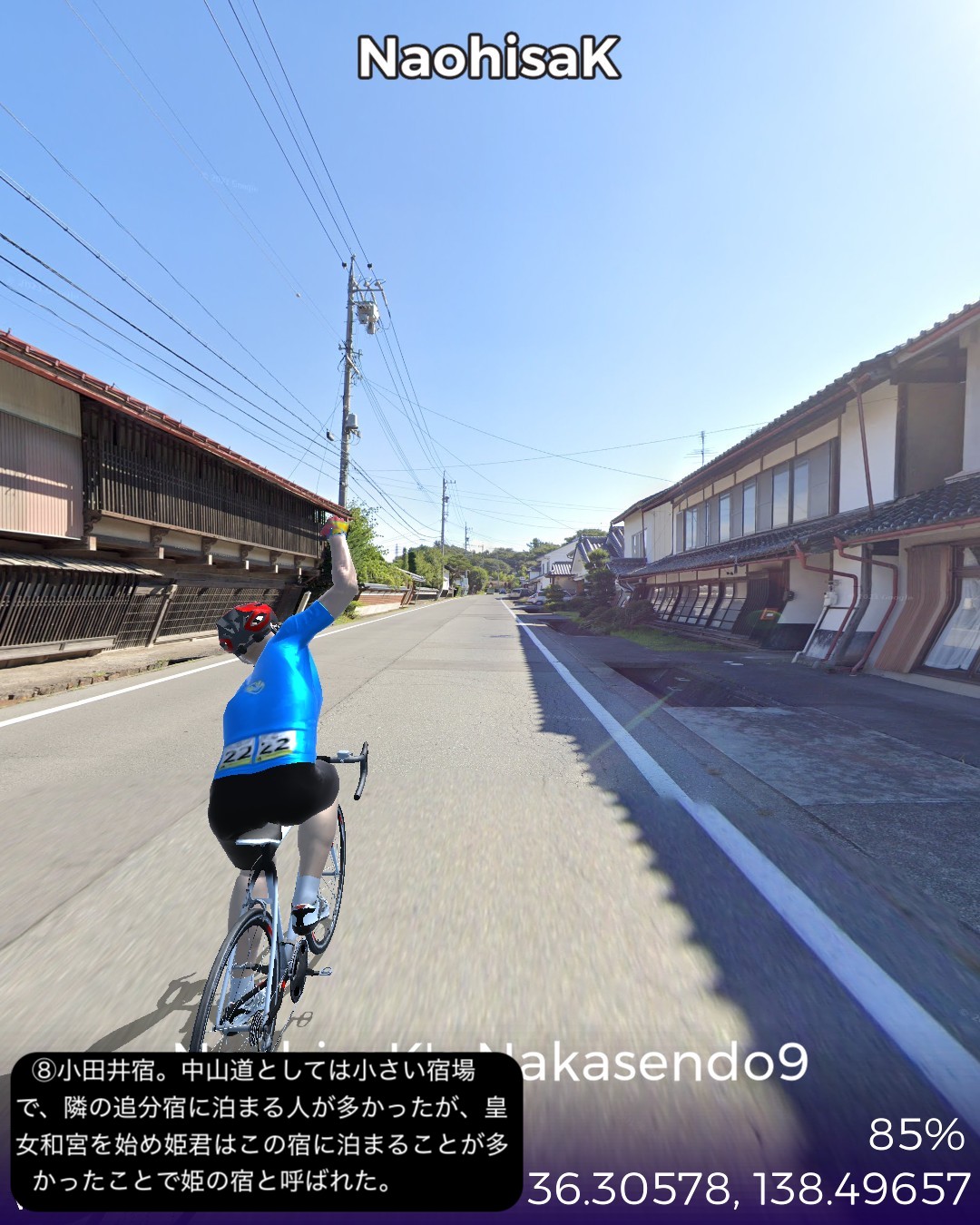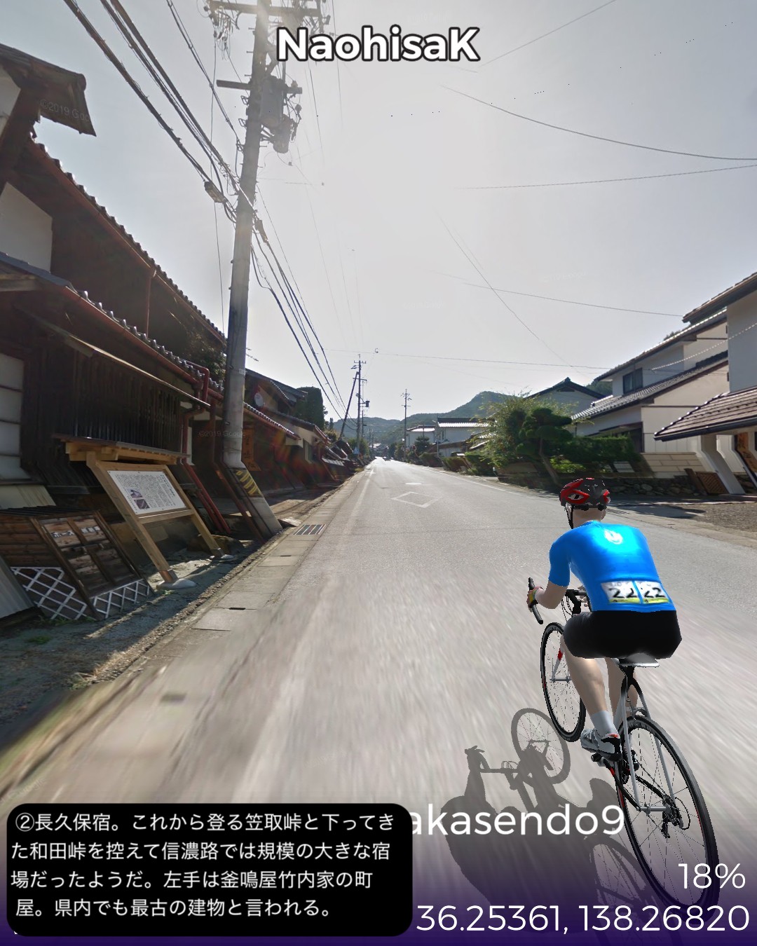 VRサイクリング 中山道9日目。これぞ中山道信濃路の巻。入れ替わり立ち替わりの宿場町。和田宿から長久保宿、笠取峠を越えて芦田宿、そこからは茂田井間宿、望月宿、八幡宿、塩名田宿、岩村田宿、小田井宿、と次々と通り過ぎる怒涛の宿場絵巻。ゴールは軽井沢間近のリゾートムードの追分宿という42kmの行程。どの宿場も街並みの保存を競って行っていて独自の雰囲気で中山道の街道ロマンを高めていて興味深い。その中でも間宿ながら起伏のある田舎の狭い道筋に白壁の土蔵や土塀の家が連なり独特の街道情緒が感じられて好きだ。実はリアル中山道歩きでここを通って魅了されていたのだ。その他、千曲川沿いに川魚料理の料亭が並ぶ塩名田宿も捨てがたい。軽井沢に八ヶ岳や霧ヶ峰、美ヶ原、小諸、上田などの著名な観光地に囲まれていながらこの中山道沿いのエリアは、エアポケットのように一般に知られていない地域であるが、逆に観光地でない分、昔ながらの日本の原風景、街道風景が保持されているのかもしれない。次回は軽井沢から碓氷峠を越えて上州路に下ってゆく。