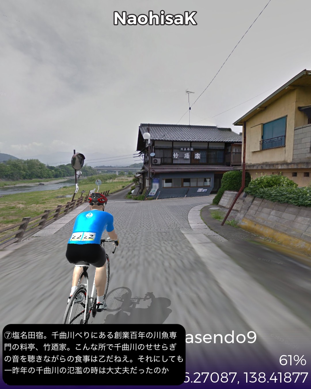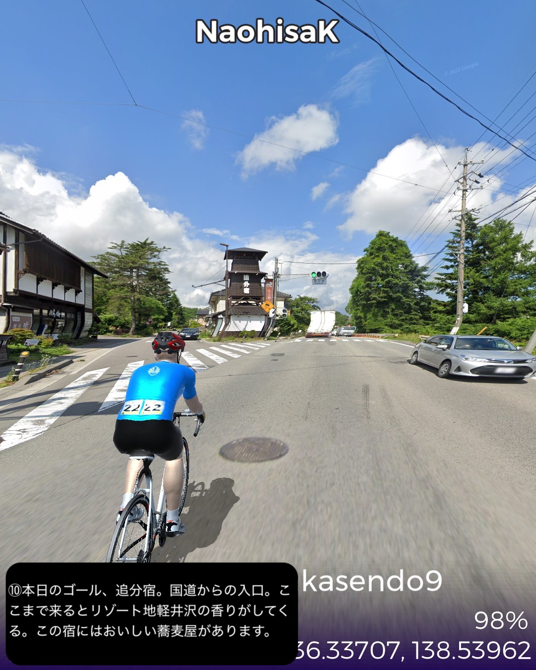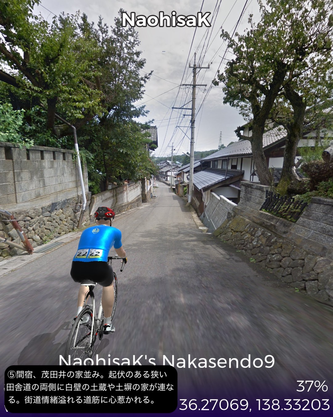 VRサイクリング 中山道9日目。これぞ中山道信濃路の巻。入れ替わり立ち替わりの宿場町。和田宿から長久保宿、笠取峠を越えて芦田宿、そこからは茂田井間宿、望月宿、八幡宿、塩名田宿、岩村田宿、小田井宿、と次々と通り過ぎる怒涛の宿場絵巻。ゴールは軽井沢間近のリゾートムードの追分宿という42kmの行程。どの宿場も街並みの保存を競って行っていて独自の雰囲気で中山道の街道ロマンを高めていて興味深い。その中でも間宿ながら起伏のある田舎の狭い道筋に白壁の土蔵や土塀の家が連なり独特の街道情緒が感じられて好きだ。実はリアル中山道歩きでここを通って魅了されていたのだ。その他、千曲川沿いに川魚料理の料亭が並ぶ塩名田宿も捨てがたい。軽井沢に八ヶ岳や霧ヶ峰、美ヶ原、小諸、上田などの著名な観光地に囲まれていながらこの中山道沿いのエリアは、エアポケットのように一般に知られていない地域であるが、逆に観光地でない分、昔ながらの日本の原風景、街道風景が保持されているのかもしれない。次回は軽井沢から碓氷峠を越えて上州路に下ってゆく。