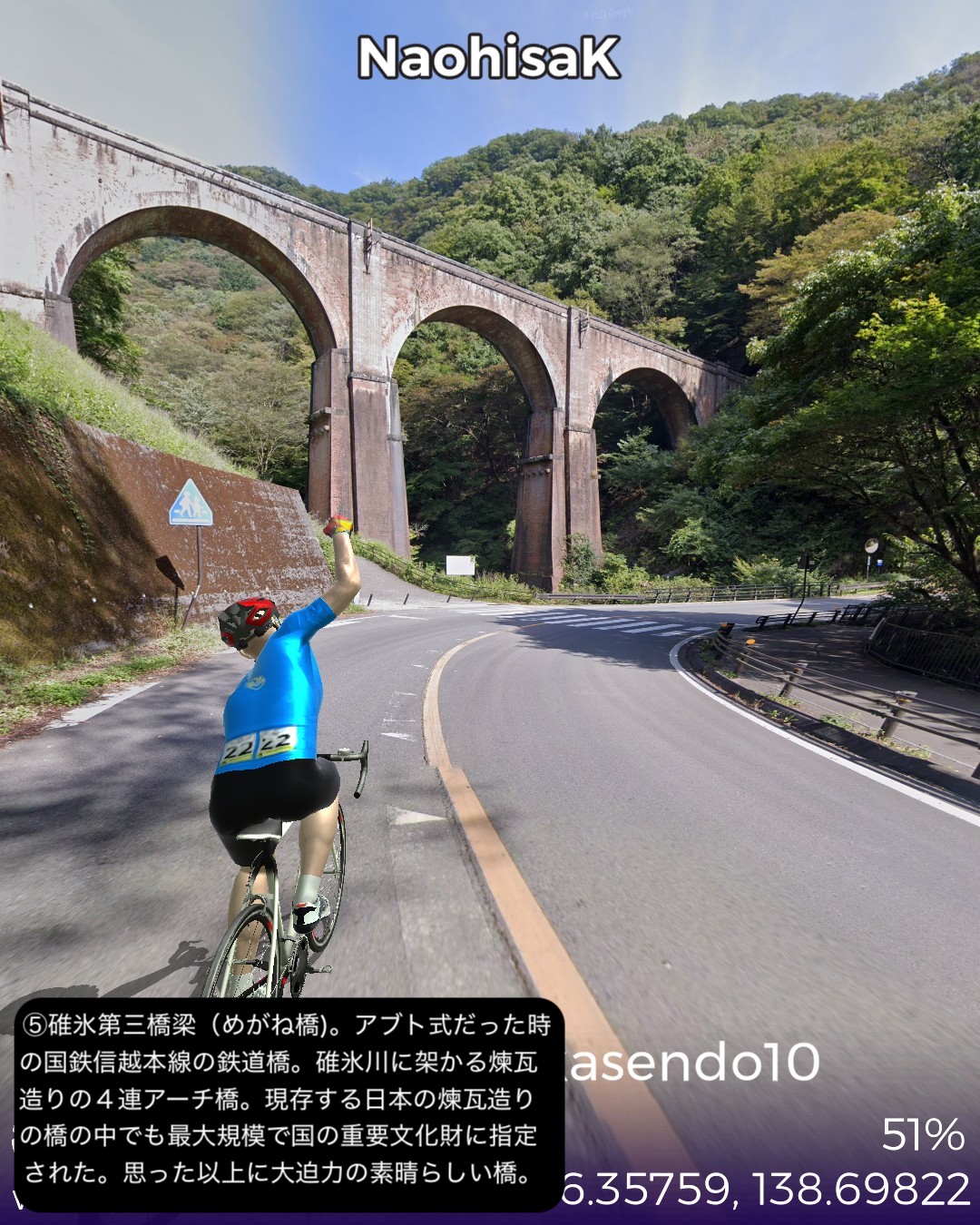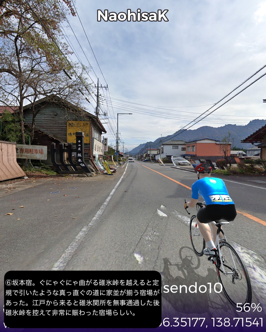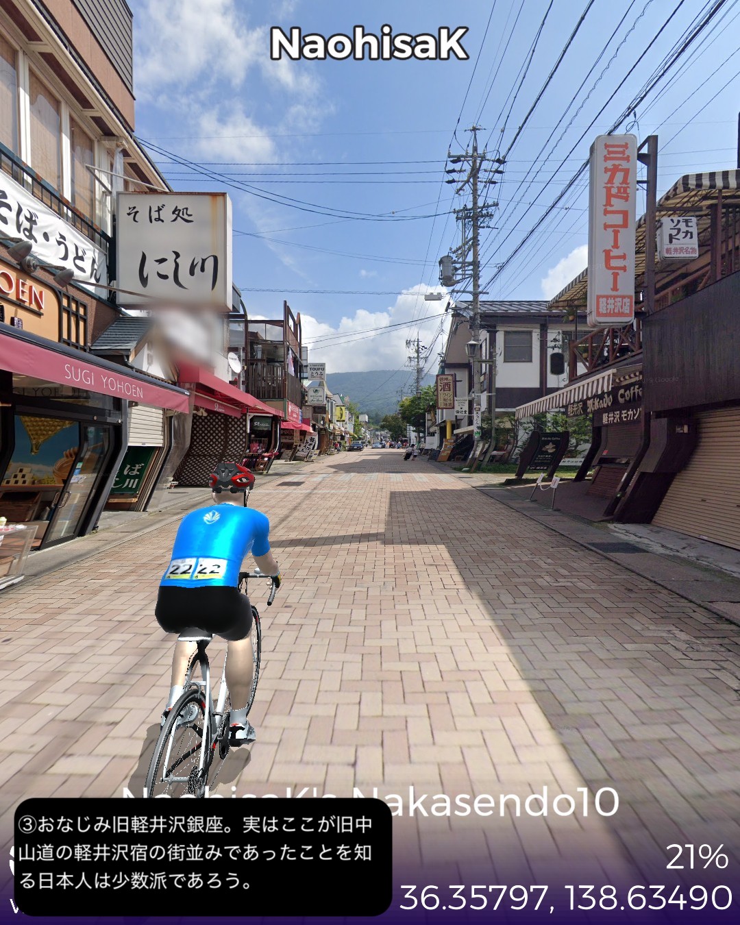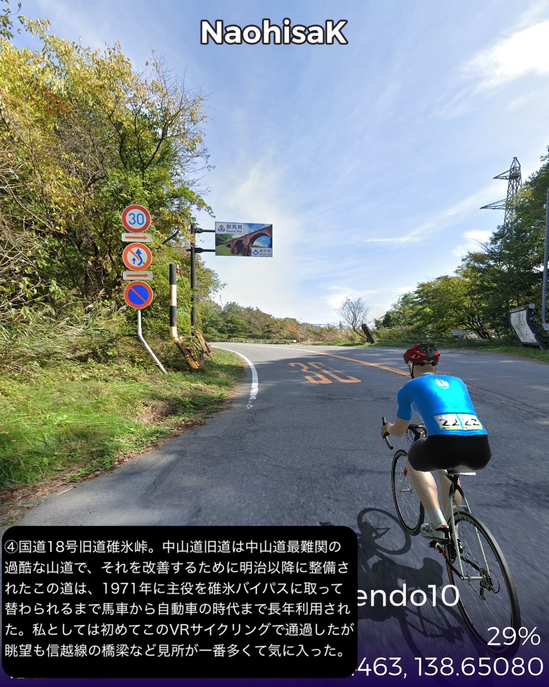 VRサイクリング 中山道10日目。追分宿を出発し、リゾート地軽井沢エリアの沓掛宿、軽井沢宿を通り、碓氷峠を越えて上州路へ下り、坂本宿、松井田宿を経由して城下町安中宿へ至る44kmの行程。軽井沢エリアはやはり街道情緒というよりリゾートムードだね。旧軽井沢銀座が実は宿場町だったというのは知らない人の方が多いのではないだろうか。その先碓氷峠を越えると群馬県、上州路に入る。碓氷峠の中山道旧道は街道随一の難所の山道で以前リアル街道歩きで通った時はその洗礼を受けたが、今回はルート設定ができないので国道18号旧道で下った。車でも碓氷バイパスか上信越道経由しか記憶がないので多分(VRではあるが)初めて利用することになったが、周囲の山や麓の眺めもさることながら、昔のアブト式鉄道の橋梁やトンネルが垣間見えたり、184ものカーブのダウンヒルも気分が良く飽きさせない。特に素晴らしかったのは碓氷第三橋梁。そびえ立つ四連アーチ式の煉瓦造りの鉄道橋の眺めは圧巻。紅葉の頃はさらに素晴らしいであろう。碓氷峠を下った後には右手に見える妙義山の異様とも言える山容を望みながら走る田舎道が、コロラドあたりの谷に迷い込んだかのような不思議な風景で飽きない。信濃路も良かったが上州路もなかなかのものだ。
