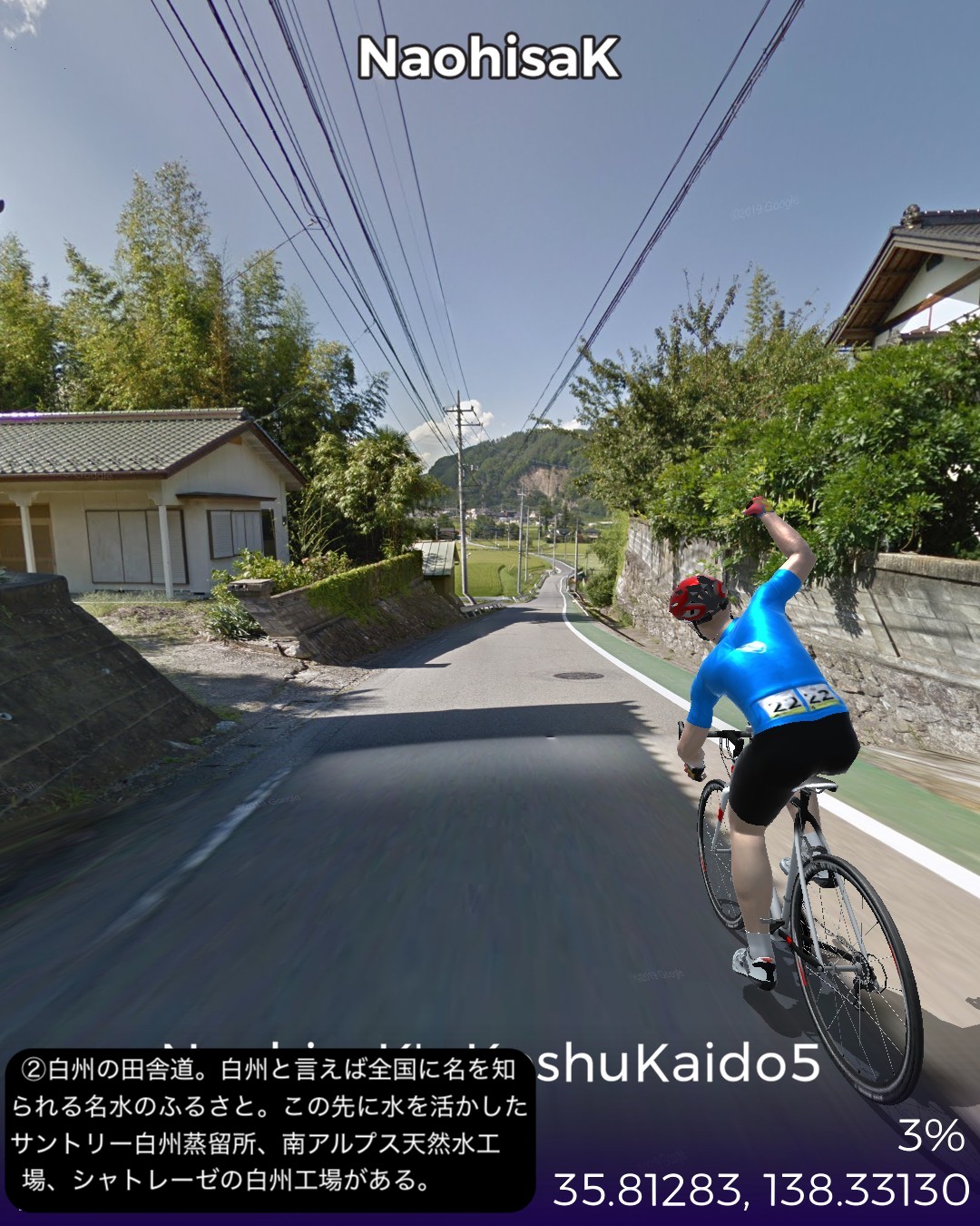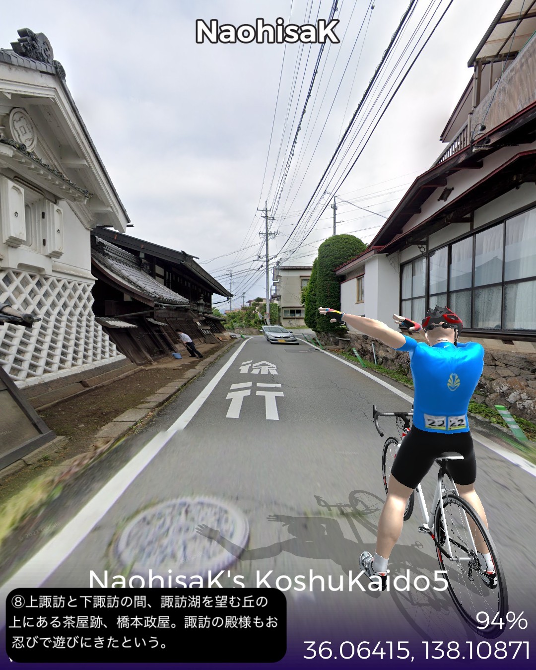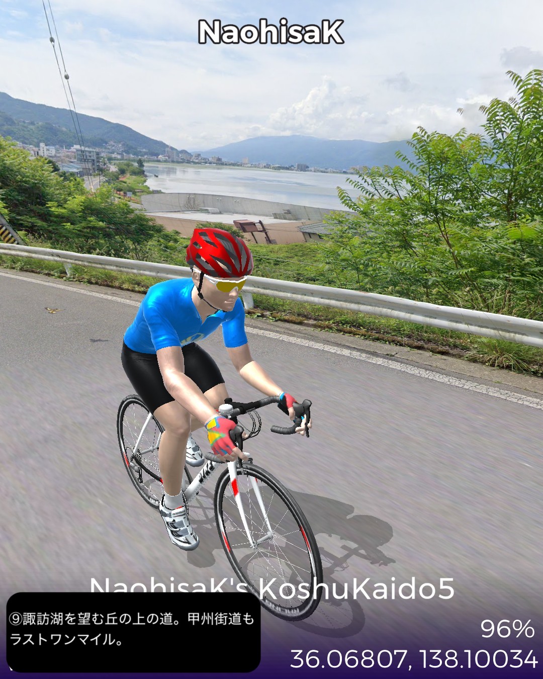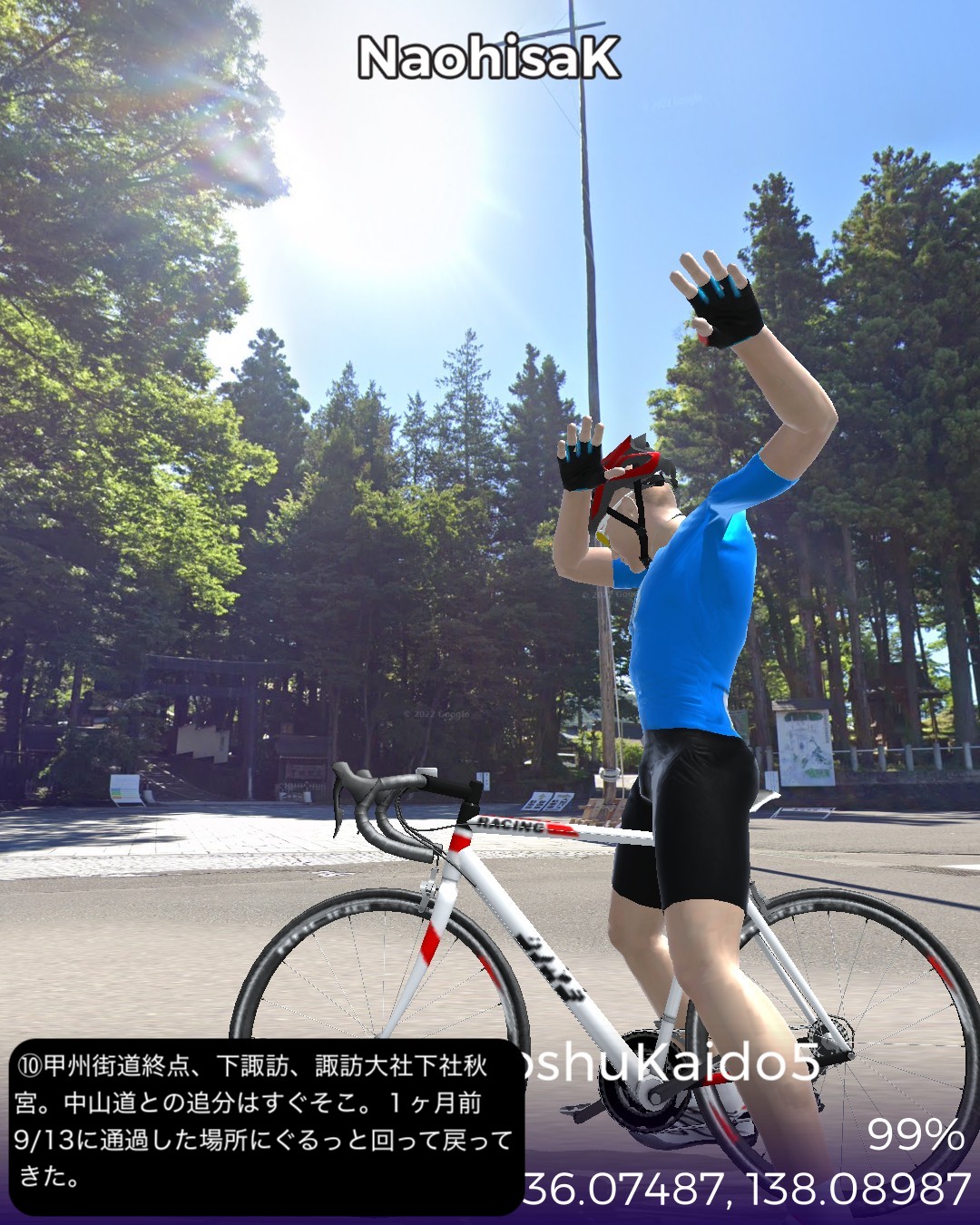 VRサイクリング。甲州街道5日目 いよいよ最終日。辺鄙な宿場町にして七賢と金精軒という名店が並ぶ台ヶ原宿を出発。名水の故郷白州を過ぎ、信州に入ると釜無川の谷間から富士見高原に登りさらに諏訪盆地に下って諏訪湖畔を回り、甲州街道の終点、1ヶ月前中山道で通過した下諏訪宿に至る41kmの行程。白州は南アルプスも北の端でダイナミックなアルプスの眺めはないが、谷間の長閑な田舎風景に癒される。ここら辺にはシャトレーゼの主力工場、サントリーのウィスキー蒸留所、南アルプス天然水の工場など全国有数の名水を活かした生産施設が集まっている。上諏訪宿から下諏訪宿にかけては諏訪湖を望む丘の上の風光明媚なコースで甲州街道最終ラウンドを飾り、諏訪大社下社秋宮前で中山道につながり、中山道・甲州街道で楕円コースをこの1ヶ月で周回したことになる。さて次からはどこへ進むか、かなりトリッキーなルートを辿ることになりそうとだけ申し上げておこう。