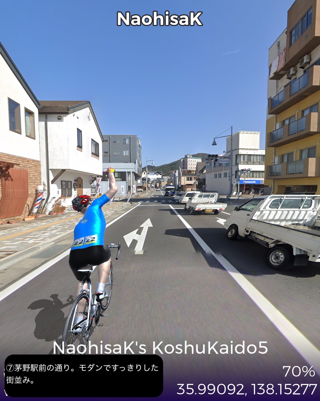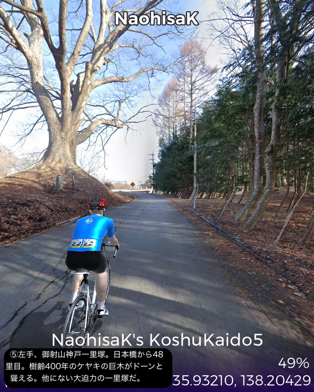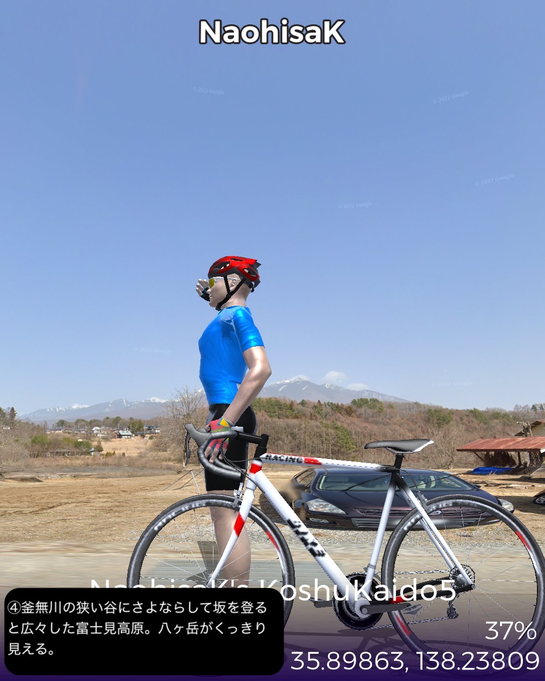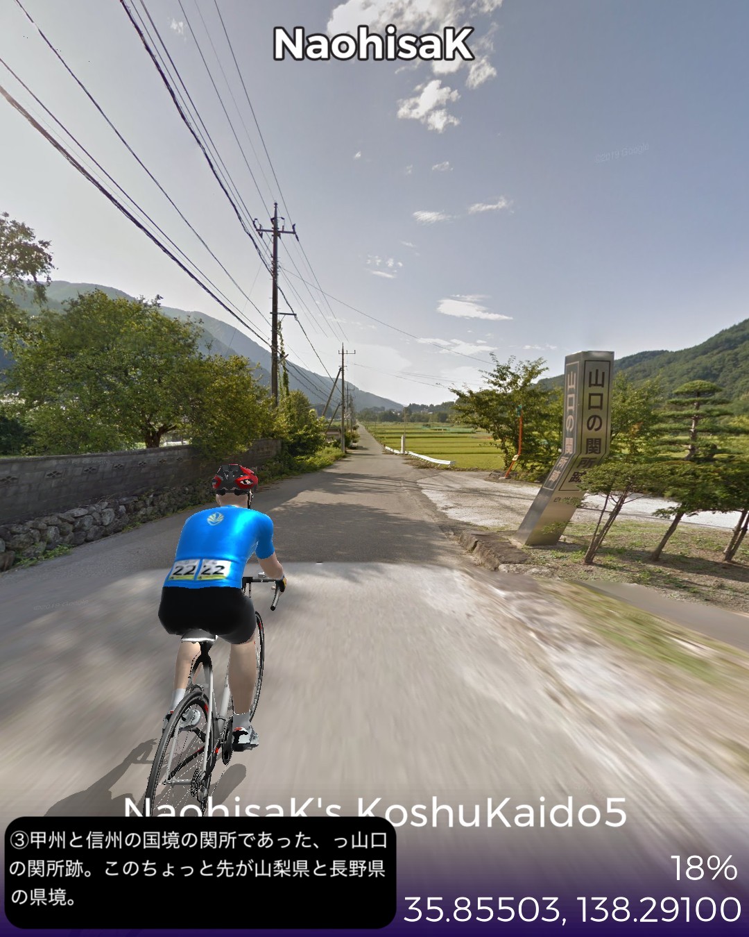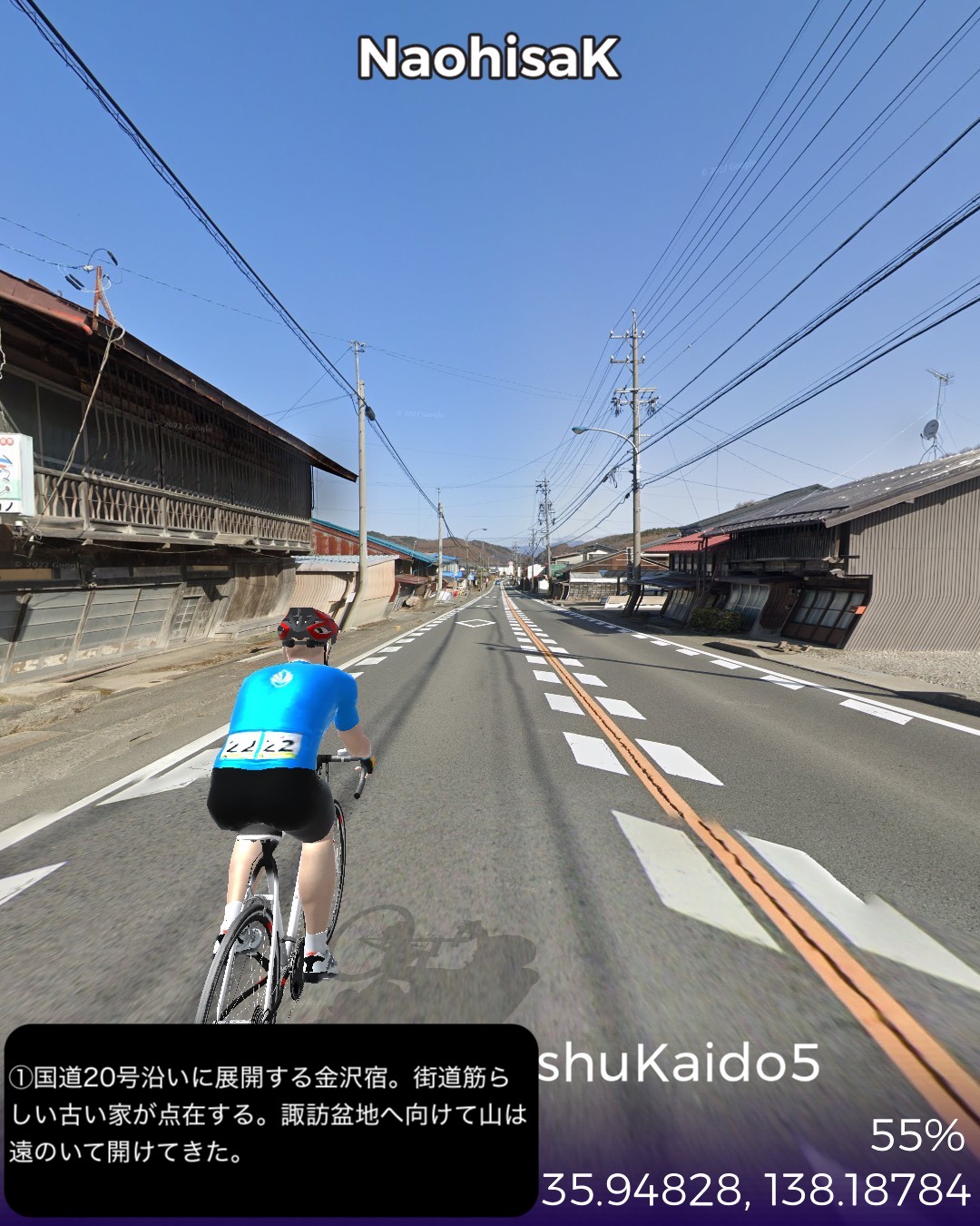 VRサイクリング。甲州街道5日目 いよいよ最終日。辺鄙な宿場町にして七賢と金精軒という名店が並ぶ台ヶ原宿を出発。名水の故郷白州を過ぎ、信州に入ると釜無川の谷間から富士見高原に登りさらに諏訪盆地に下って諏訪湖畔を回り、甲州街道の終点、1ヶ月前中山道で通過した下諏訪宿に至る41kmの行程。白州は南アルプスも北の端でダイナミックなアルプスの眺めはないが、谷間の長閑な田舎風景に癒される。ここら辺にはシャトレーゼの主力工場、サントリーのウィスキー蒸留所、南アルプス天然水の工場など全国有数の名水を活かした生産施設が集まっている。上諏訪宿から下諏訪宿にかけては諏訪湖を望む丘の上の風光明媚なコースで甲州街道最終ラウンドを飾り、諏訪大社下社秋宮前で中山道につながり、中山道・甲州街道で楕円コースをこの1ヶ月で周回したことになる。さて次からはどこへ進むか、かなりトリッキーなルートを辿ることになりそうとだけ申し上げておこう。