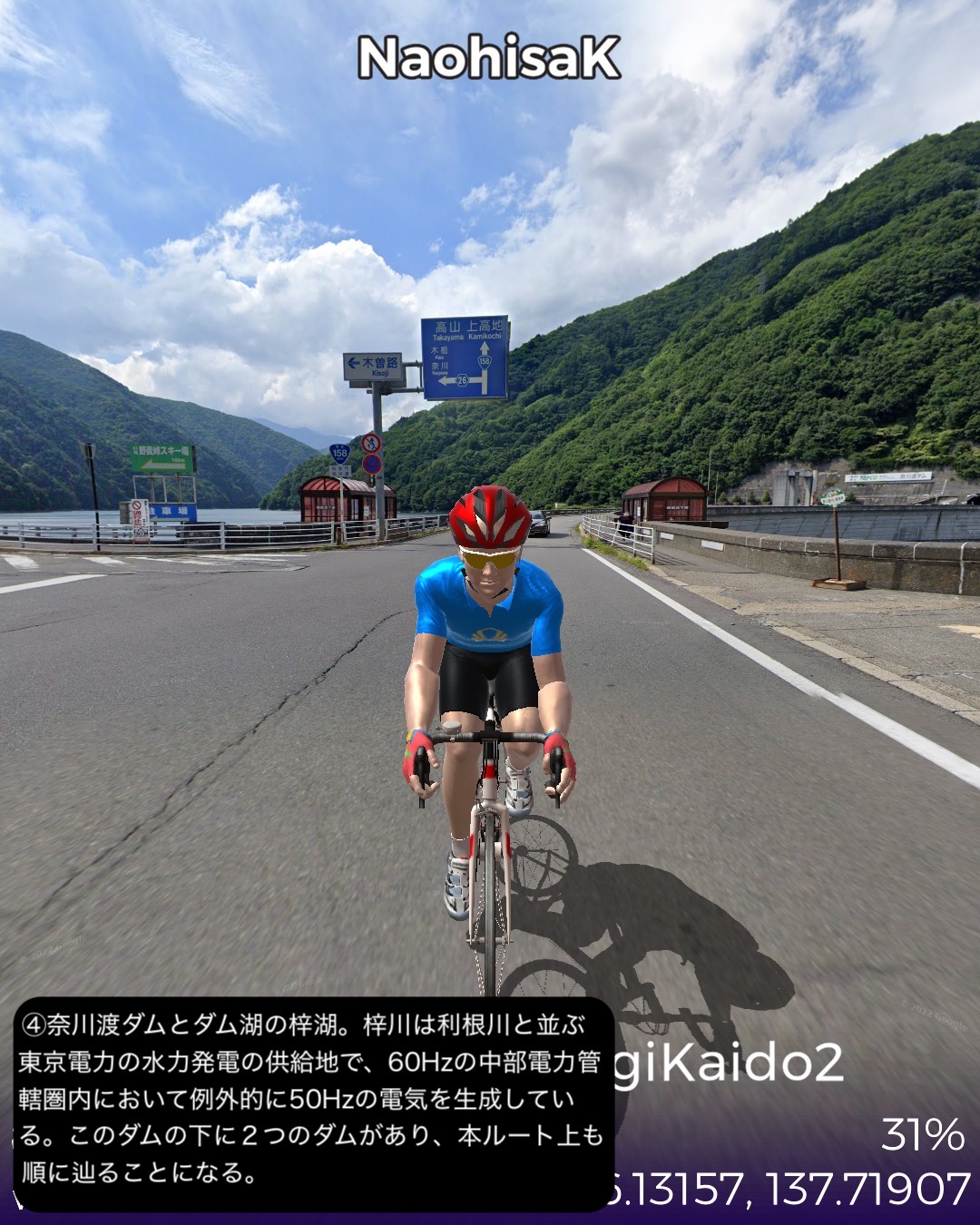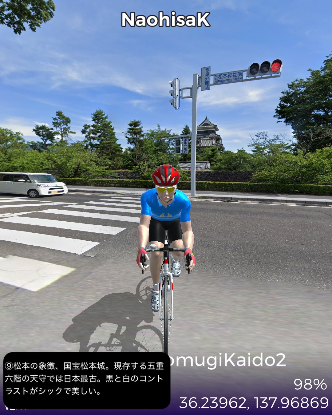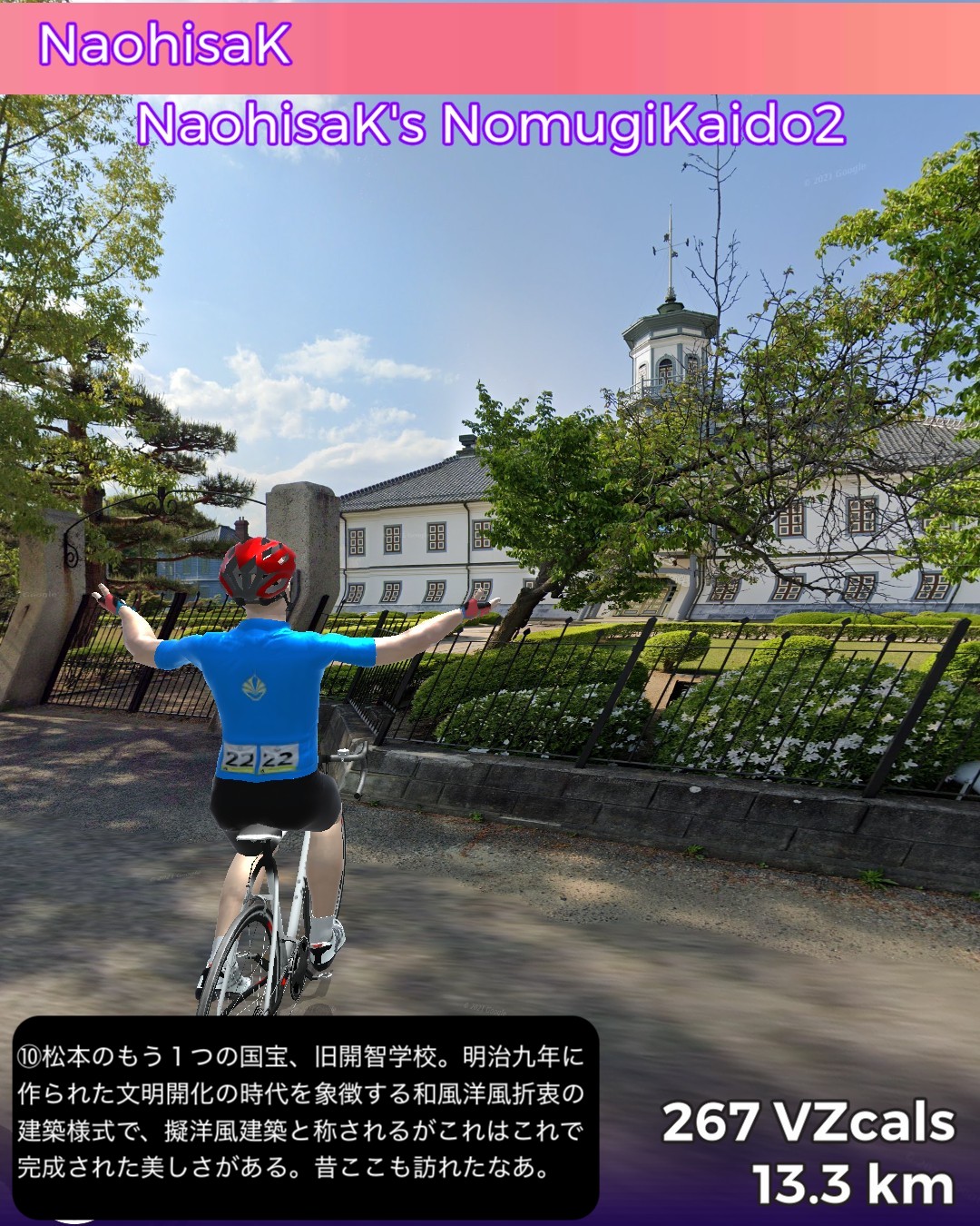 VRサイクリング、野麦街道。紅葉の美しい乗鞍高原から山をひたすら下り長野県中信地方の中核都市松本市街に至る43kmの行程。前回のゴールデンルートに対して今回はゴールの松本以外には特に名所もなく地味なルート。前半はトンネルとダムとダム湖が連続する深い山の道。後半は山からいきなり広がった松本盆地の平原を背後に北アルプスを望みつつ進む。乗鞍高原から梓湖に至るまでは旧街道ではなく乗鞍エコーラインという観光道路。梓湖の奈川渡ダムから野麦街道に入って松本市街に至る。野麦街道は梓湖の先、女工哀史で知られる野麦峠を越えた先の高根ダムから前々回走ったルートとなって飛騨高山に至り、古来松本と飛騨高山を結ぶ街道であった。ここ数回深い山を通るルート中心で特にダムやダム湖が続く風景は結構食傷気味であるが、今回の梓川流域の奈川渡ダムとその下流の3つのダムによる発電所は、60Hzベースの中部電力管轄地域にあって東京電力管轄で50Hzの電気を生成する特異点となっていて、実は利根川と並ぶ首都圏へ供給する水力発電の中核を担っているらしい。松本は数回訪れた町であるが、松本城と旧開智学校という2つの国宝建築物を有する美しい町だ。次回は長野方面へ向かう。
