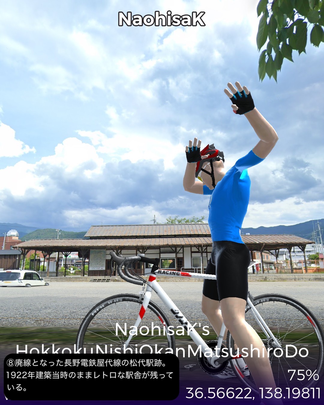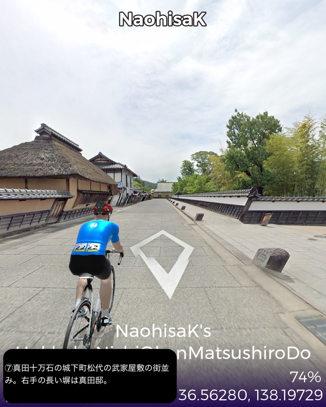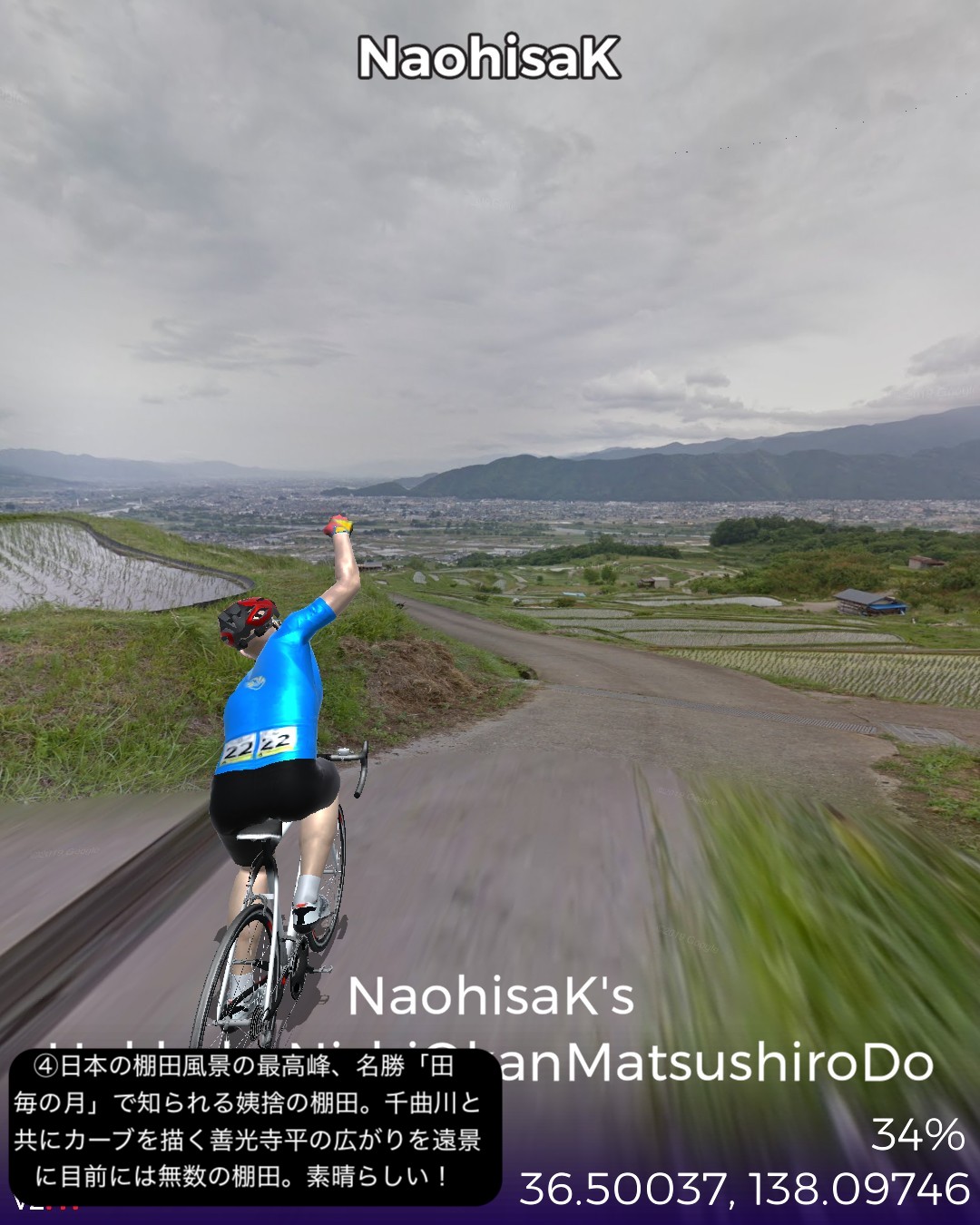 VRサイクリング、北国西脇往還2日目として麻績宿をスタートし聖高原へ登り、下ったところで姨捨の棚田見学にちょっと寄り道。街道へ戻り古きよき宿場稲荷山宿を経て北国街道との分岐点篠ノ井追分まで進む。その後名もなき道を介して千曲川東岸へ渡ったところで松代道に入りその1日目として、城下町松代宿をじっくり観てから次の宿場川田宿をゴールとするトータル42kmの行程。今回の最大の見所は街道を大きく外れて寄り道した姨捨の棚田。日本に山ほど棚田あるが間違いなくその最高峰。千曲川が広大な盆地と共に東西から南北に大きくカーブするスペクタクルを遠景に無数の開いた引き出しのような棚田が近景に展開する唯一無二の素晴らしい眺め。その棚田の間を下ってゆく爽快さ。名勝「田毎の月」と呼ばれる月夜はさらに素晴らしい眺めであろう。ここは是非リアルに訪れてみたいこれまでのBest1だ。今回はそれ以外にも真田十万石の城下町松代や、昔の街道筋の宿場町の街並みが見事に保存されている稲荷山宿、スタート地点の麻積宿から聖高原に至る山里風景など多彩な展開があり楽しめた。次回は北信濃から越後方面を目指してゆく。
