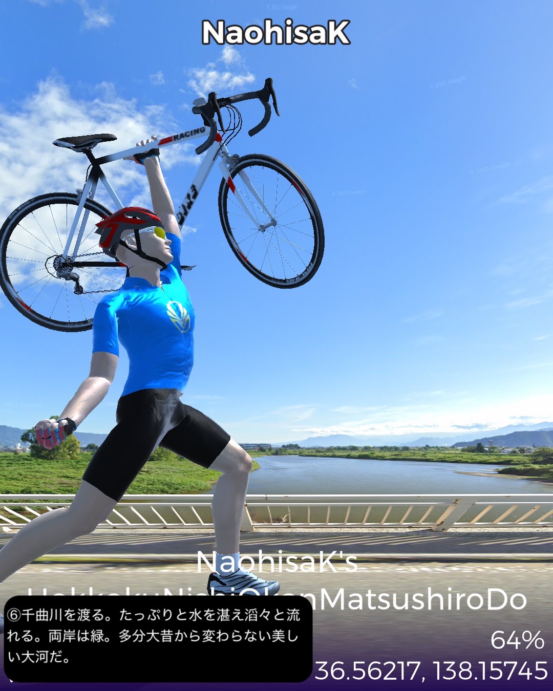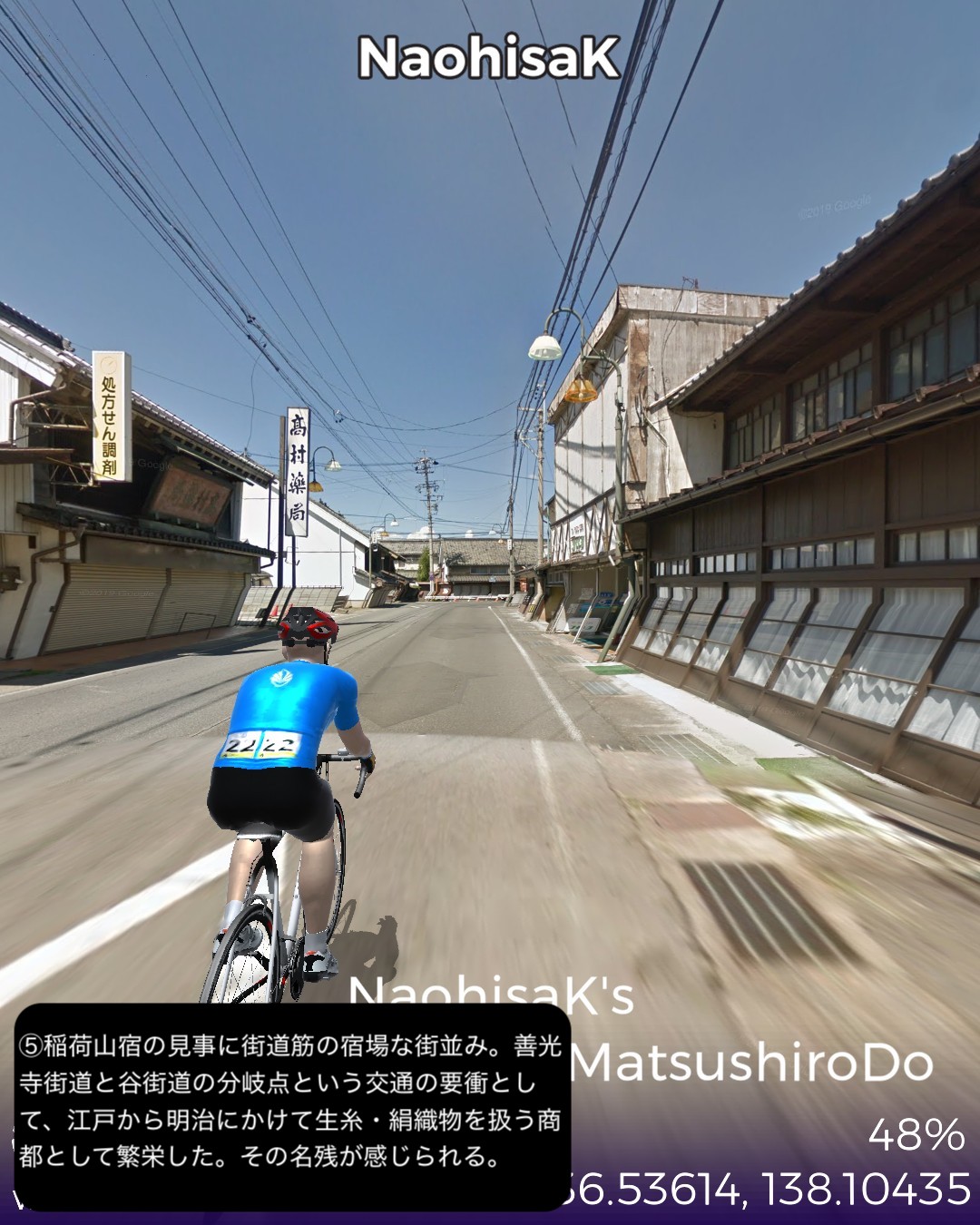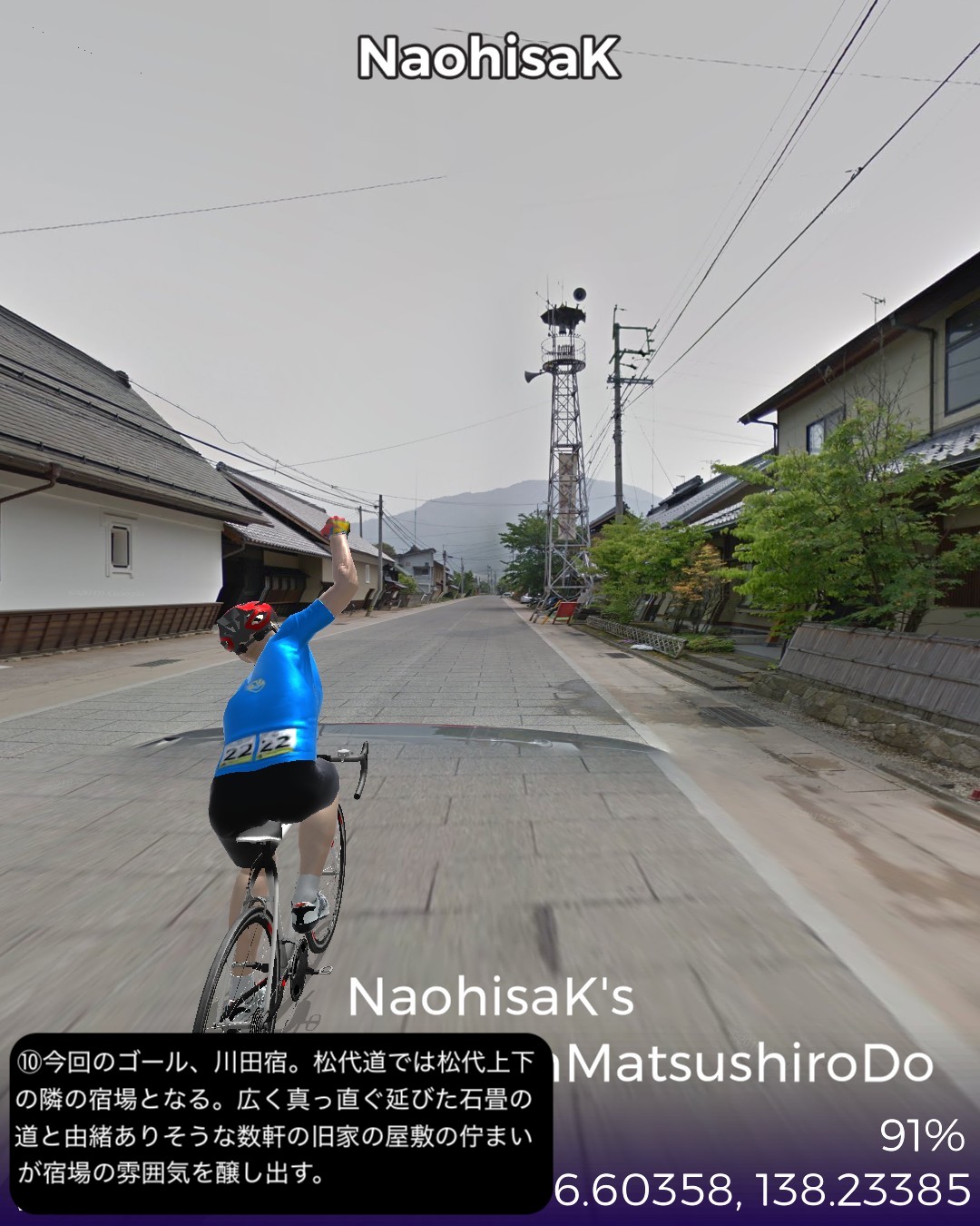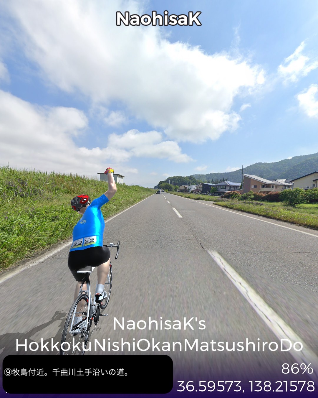 VRサイクリング、北国西脇往還2日目として麻績宿をスタートし聖高原へ登り、下ったところで姨捨の棚田見学にちょっと寄り道。街道へ戻り古きよき宿場稲荷山宿を経て北国街道との分岐点篠ノ井追分まで進む。その後名もなき道を介して千曲川東岸へ渡ったところで松代道に入りその1日目として、城下町松代宿をじっくり観てから次の宿場川田宿をゴールとするトータル42kmの行程。今回の最大の見所は街道を大きく外れて寄り道した姨捨の棚田。日本に山ほど棚田あるが間違いなくその最高峰。千曲川が広大な盆地と共に東西から南北に大きくカーブするスペクタクルを遠景に無数の開いた引き出しのような棚田が近景に展開する唯一無二の素晴らしい眺め。その棚田の間を下ってゆく爽快さ。名勝「田毎の月」と呼ばれる月夜はさらに素晴らしい眺めであろう。ここは是非リアルに訪れてみたいこれまでのBest1だ。今回はそれ以外にも真田十万石の城下町松代や、昔の街道筋の宿場町の街並みが見事に保存されている稲荷山宿、スタート地点の麻積宿から聖高原に至る山里風景など多彩な展開があり楽しめた。次回は北信濃から越後方面を目指してゆく。