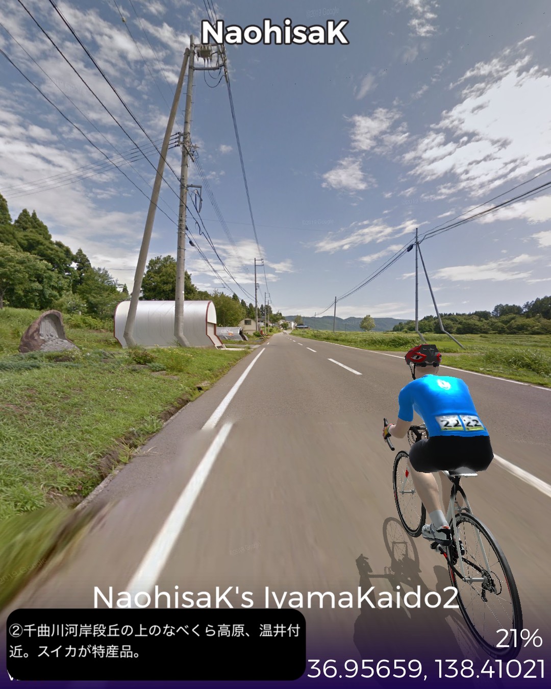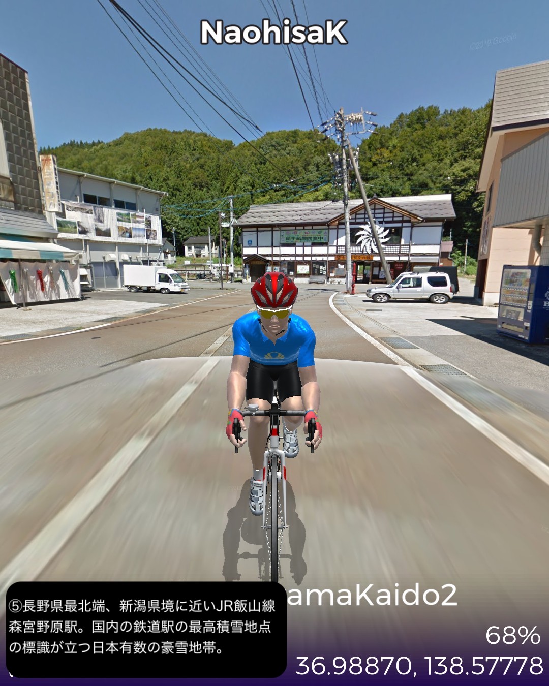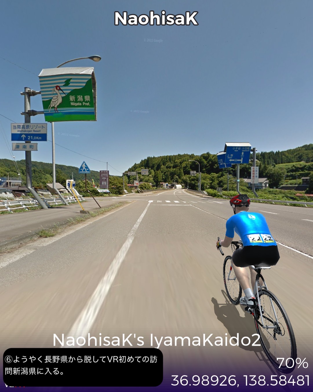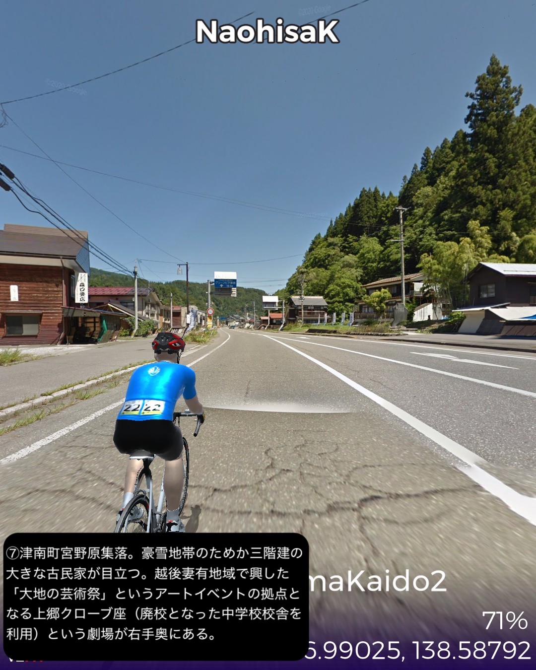 VRサイクリング 信濃国から越後国へさらに千曲川から信濃川と共に下ってゆく。飯山街道2日目として前回野沢温泉へ街道から外れた飯山市街北の常盤付近をスタートし野沢温泉の向かい側のスキー場戸狩温泉から千曲川の河岸段丘上のなべくら高原へ登り、また千曲川左岸を飯山線に沿って長野県最北部の栄村森集落まで進む。ここで新潟県(あるいは越後国)へ越境すると共に街道としては越後善光寺街道に入り1日目として魚沼産コシヒカリの一大産地津南町を進み卯ノ木集落をゴールとする39kmの行程。スタート地点ゴール地点とも大きな町でも宿場町でもない曖昧な場所となってしまったが、ルート全体もこれと言って名所史跡ビューポイント・ランドマークのないジミーな行程であった。前回から引き続き千曲川の流れに沿って進んでゆくのだが、下流にいくに従ってまるで上流に遡ってゆくかのごとく山地が深くなり流れが急になってゆくのが不思議であった。それからこの地帯では豪雪と千曲川・信濃川の氾濫に備えて3階建など高い家屋が多いのは興味深かった。さて次回からはリアルでもほとんど不案内な越後の国、新潟県を進んでゆく。