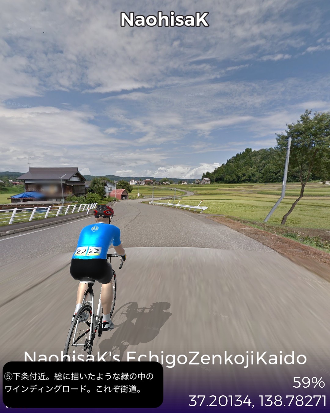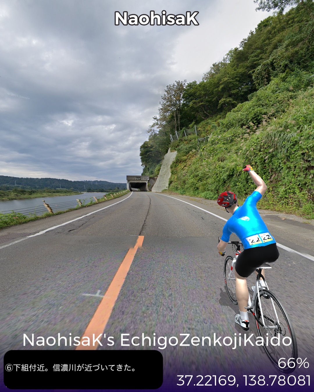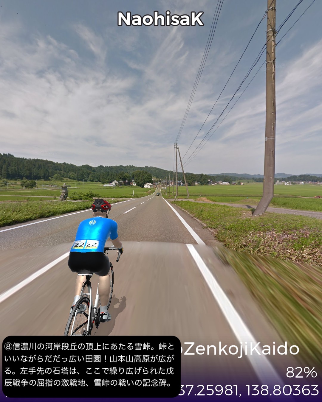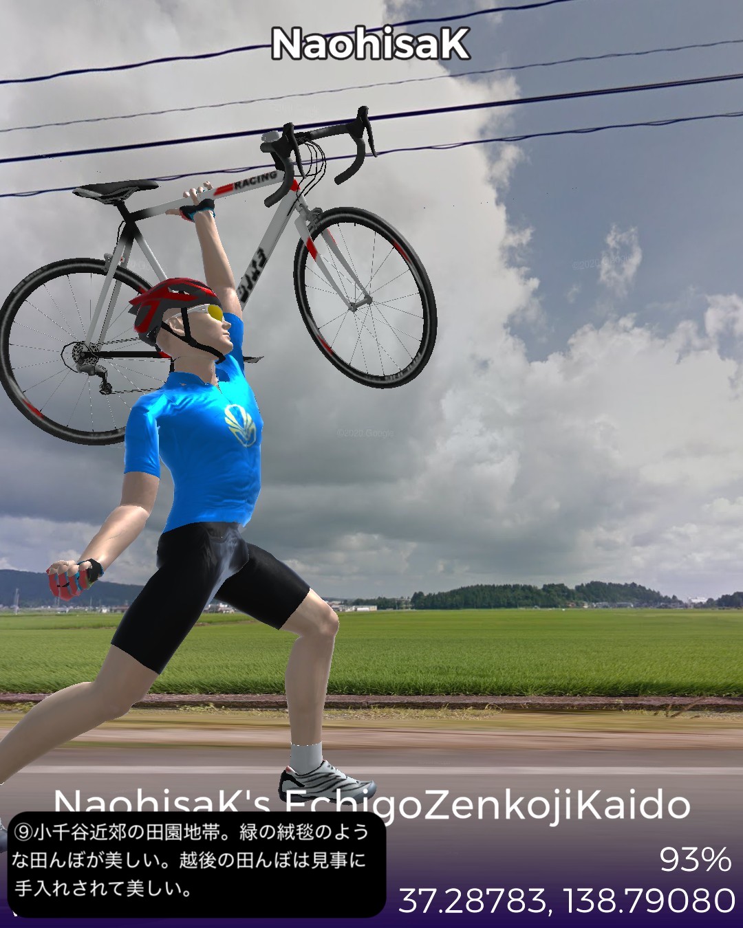 VRサイクリング 越後善光寺街道2日目。信濃川をさらに下り、田園地帯を越後の中央部まで進んでゆく。津南町の外れ卯ノ木を出発し、延々と続く歩道アーケードの町十日町宿を抜け街道の終点、錦鯉の里小千谷宿まで41kmの行程。前回同様取り立てて名所旧跡はないが、信濃川が形成する波打つ丘陵地に目の覚めるような緑の絨毯のように広がる田園風景を背景にワインディングした旧街道をうねうね走るのは爽快感がある。とにかく越後の田んぼは広大で美しいの一言。ブランド米のプレミアムな先入観もあるかもしれないが、他の地域に比べて田んぼの手入れが行き届き、稲穂はキレイに揃って伸びている気がする。