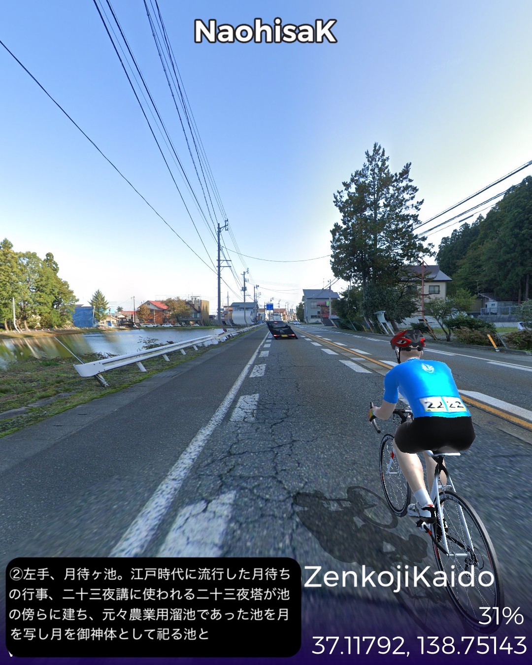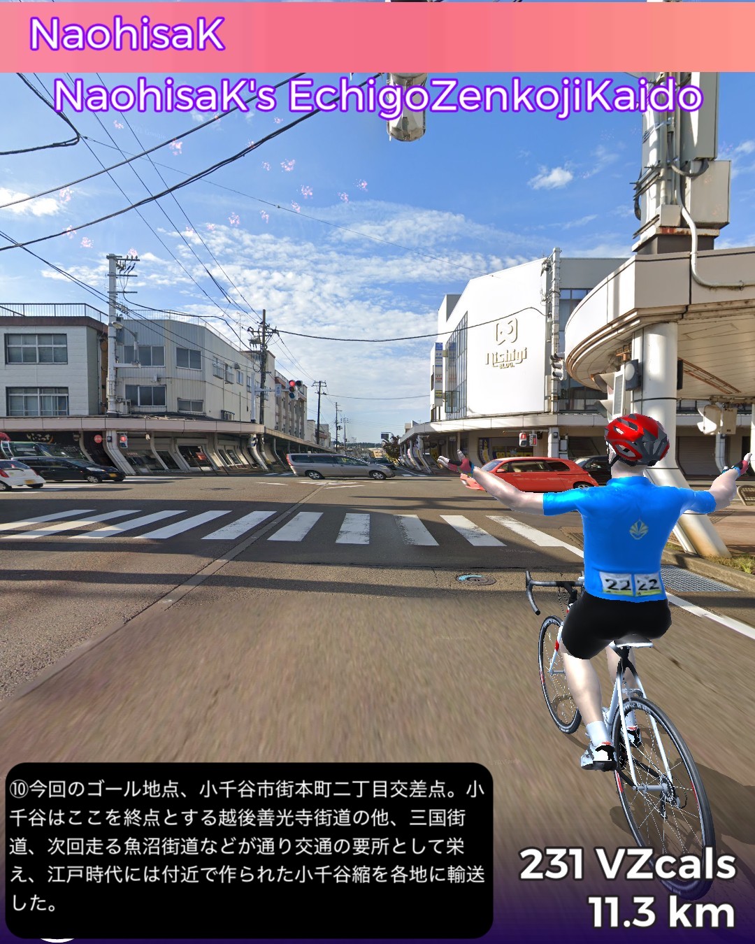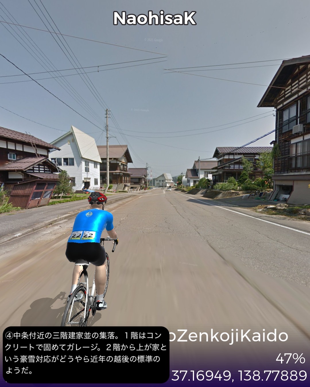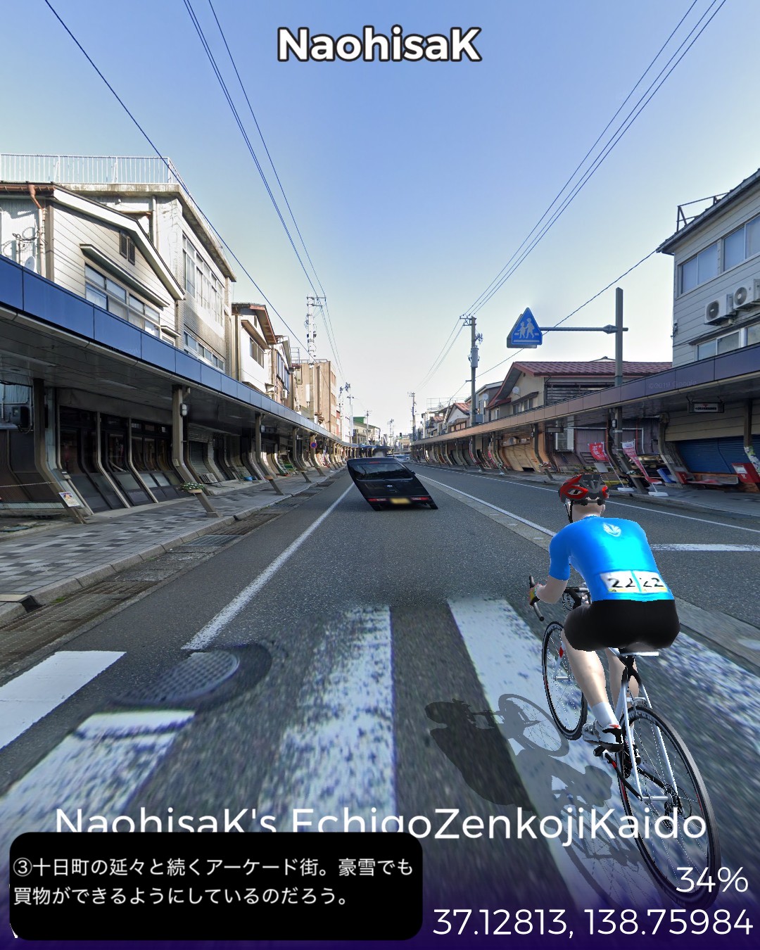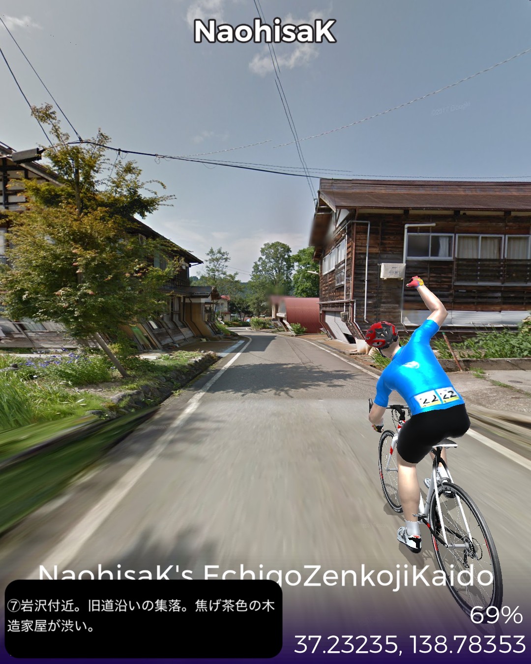 VRサイクリング 越後善光寺街道2日目。信濃川をさらに下り、田園地帯を越後の中央部まで進んでゆく。津南町の外れ卯ノ木を出発し、延々と続く歩道アーケードの町十日町宿を抜け街道の終点、錦鯉の里小千谷宿まで41kmの行程。前回同様取り立てて名所旧跡はないが、信濃川が形成する波打つ丘陵地に目の覚めるような緑の絨毯のように広がる田園風景を背景にワインディングした旧街道をうねうね走るのは爽快感がある。とにかく越後の田んぼは広大で美しいの一言。ブランド米のプレミアムな先入観もあるかもしれないが、他の地域に比べて田んぼの手入れが行き届き、稲穂はキレイに揃って伸びている気がする。