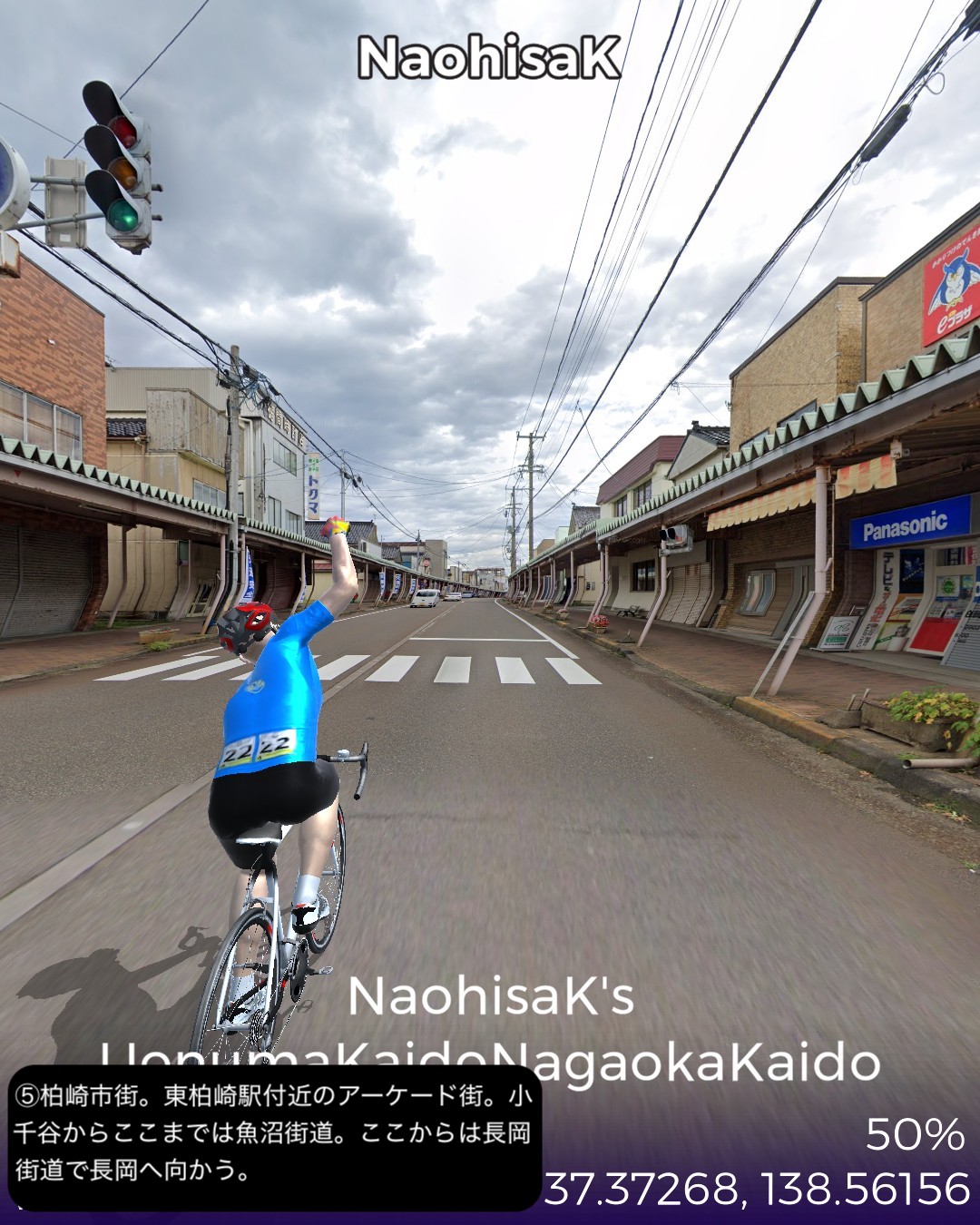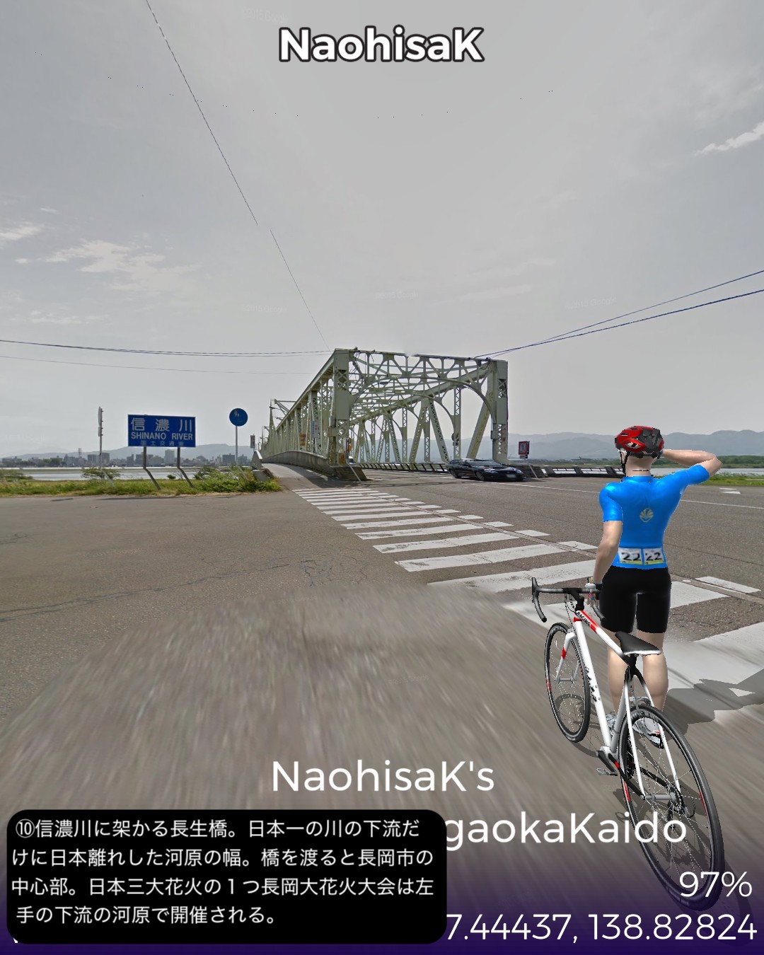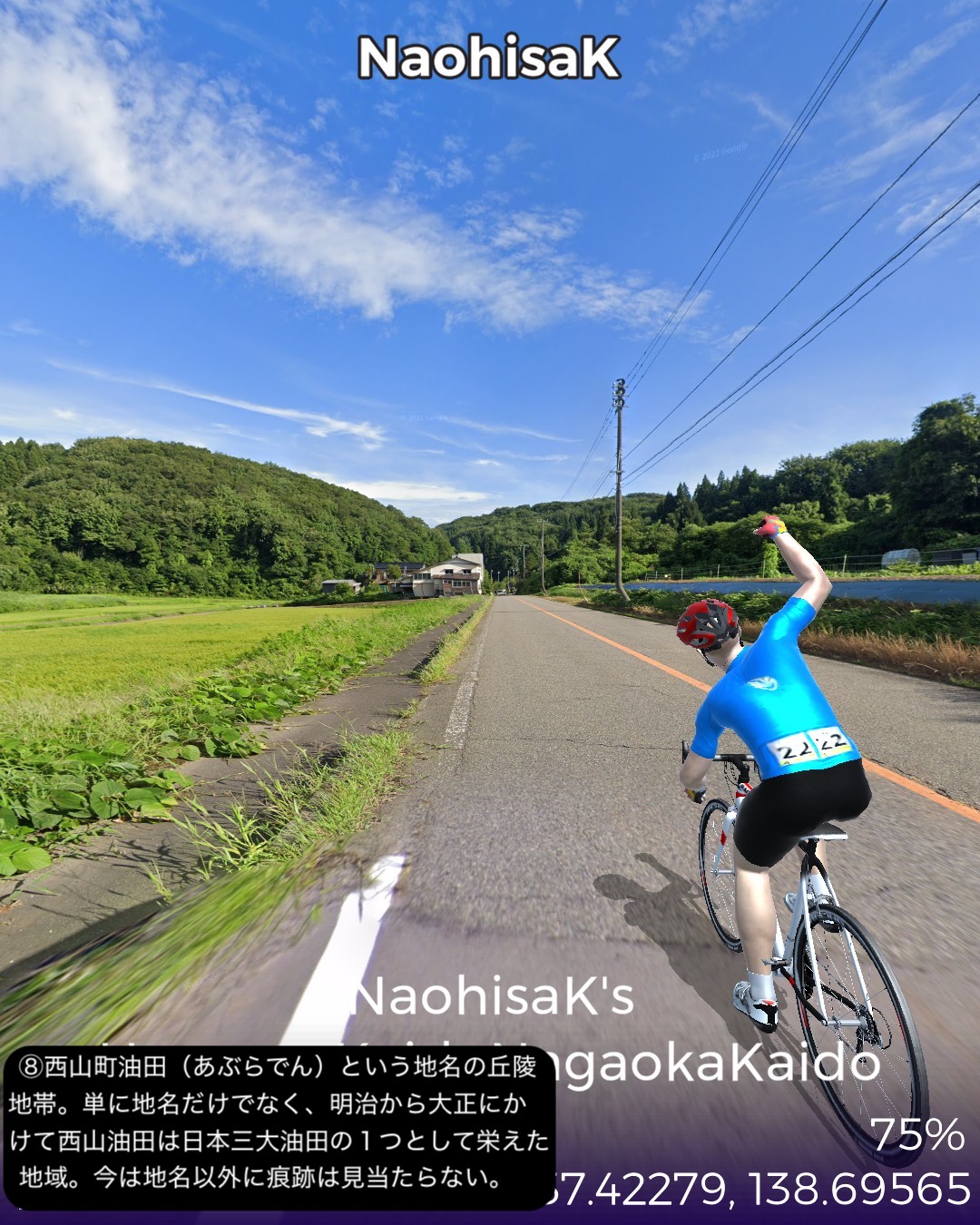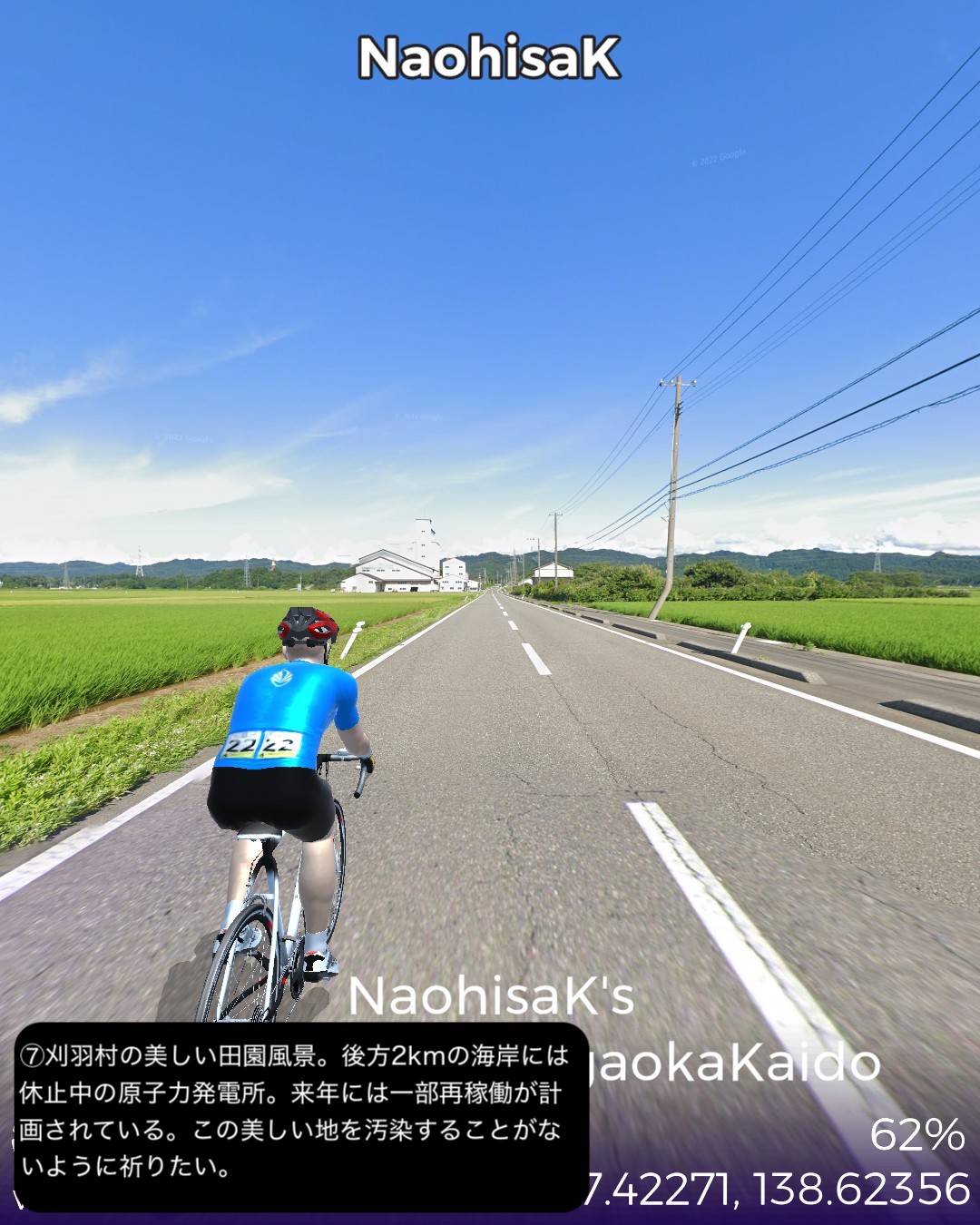 VRサイクリング 今回は越後の大きな町を2つの街道でリンクしてゆく。魚沼街道で錦鯉と織物の街小千谷を出発し西へ向かい海辺の町柏崎まで行き、そこから長岡街道でまた内陸の交通の要衝で新潟県第二の都市長岡へ至る71kmの長丁場。ルートとした内陸の小千谷・長岡と海辺の柏崎の間には深い山地はなくなだらかな丘陵と平野である。よって米どころ越後だけにルート全体に田園風景が広がっているが、マイナーな街道で旧道が定かでないこともありまたしても街道筋らしい名所・史跡には乏しかった。長岡街道沿いの柏崎の北東部、刈羽、西山地区も田園と丘陵しかないある意味殺風景な地域であったが、刈羽には海岸沿いに現在停止中の日本最大の原子力発電所がある。近々一部が再稼働するようだが今後の利用シナリオは日本のエネルギー供給において重要なキーファクタとなるかもしれない。その隣の西山地区には油田(あぶらでん)という地名がありもしやと思って調べてみると明治大正期には日本三大油田の1つ西山油田があった地域のようだ。今は地名以外に痕跡も見当たらなかった。古今のエネルギー供給地となっていることが興味深い。ちなみに西山地区はかの田中角栄氏の生家があって田中角栄記念館というのが建っている。長岡は郊外が広い都市で市街地から遠いところから家並が続いており、また通り沿いの郊外店舗が他の地域に比べて妙に大きいのが印象的だった。そして有名な長岡花火大会が開催される信濃川の河原は対岸が霞むほど広い。さすが日本一の川の下流。さて次回はさらに新潟へ向かって進んでゆく。