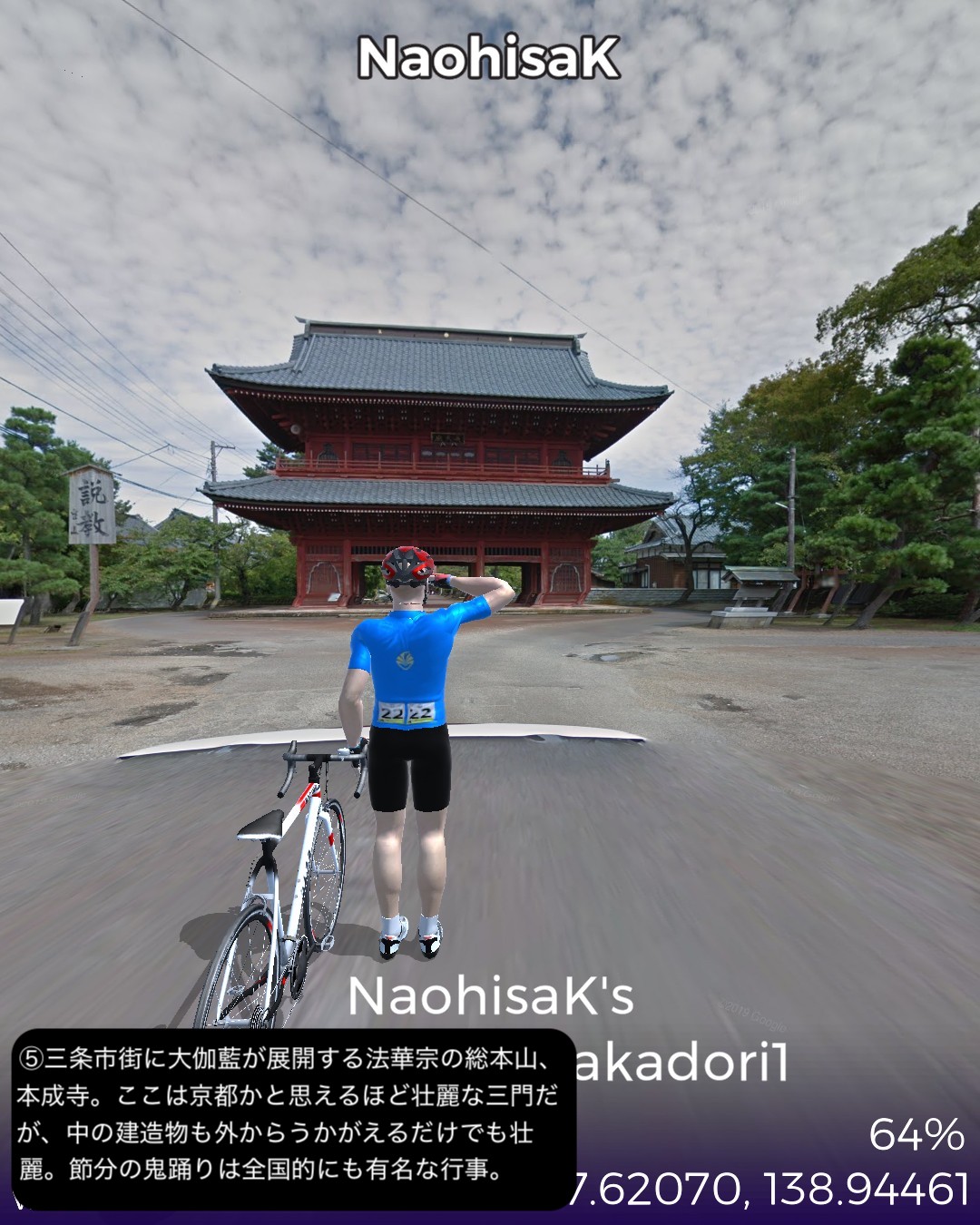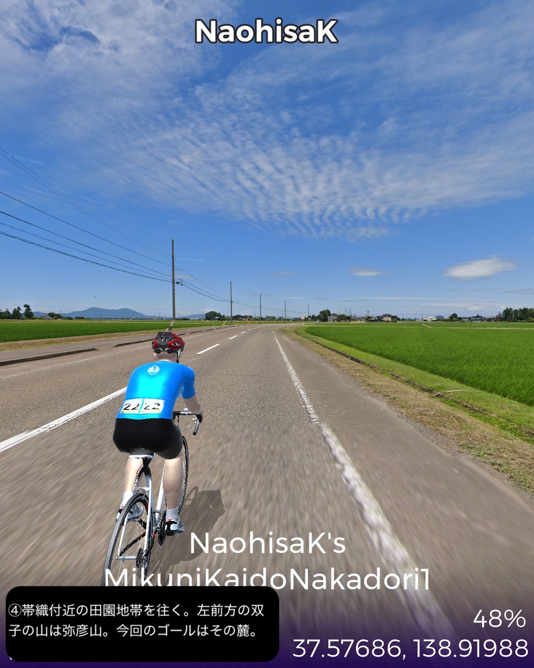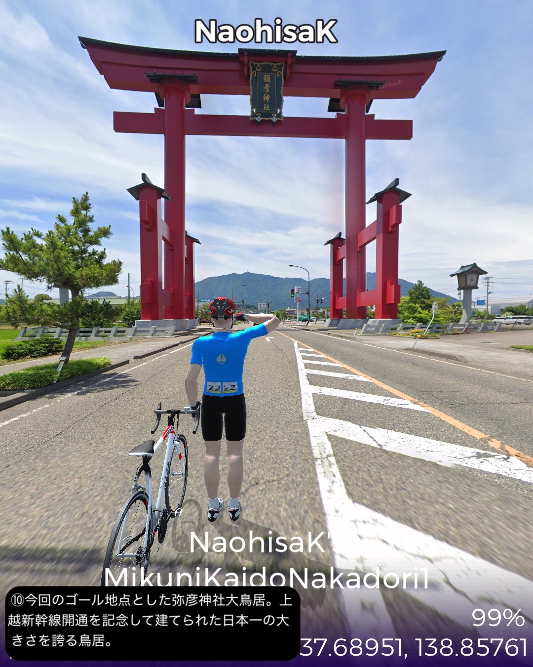 VRサイクリング、三国街道中通り1日目。三国街道は上州(群馬県)から寺泊に至るルートであるが、三国街道中通りは三国街道途中の長岡から越後の北に位置する新発田藩や村上藩に至る道として利用されていた三国街道とは異なる街道である。その三国街道中通りにより長岡をスタートしてどこまでも続く田園を抜けて職人の町三条市街へ、そこから街道を外れて寄り道コース、信濃川を渡って川向こうの同様の職人の町燕市街を抜けて、弥彦山麓の矢作にある弥彦神社の日本一の大鳥居をゴールとする40kmの行程。ルートを通じて見えていたのはゴールに近い弥彦山の双コブの山容。遠くに見えていたのがだんだん近く大きくなる行程であった。興味深かったのは信濃川を隔てて右岸と左岸に展開する三条と燕の市街。どちらも同じぐらいの街の大きさで金属加工を中心としたモノ作りの町、職人の町という同じ特殊な属性を持つ二重惑星のような双子の町が信濃川を挟んで隣り合っているのだ。そしてさらに面白いのはどちらの街も中心部は、至ってレトロで古い商店街とくすんだ色の家並が続くが、2つの市街地の間の信濃川に近い地区には上越新幹線の燕三条駅があり高速のICがありその周りに大きな郊外店舗が建ち並ぶ。こんな場所は他にないよね。さて次回は当面の目的地新潟市街に到達予定。
