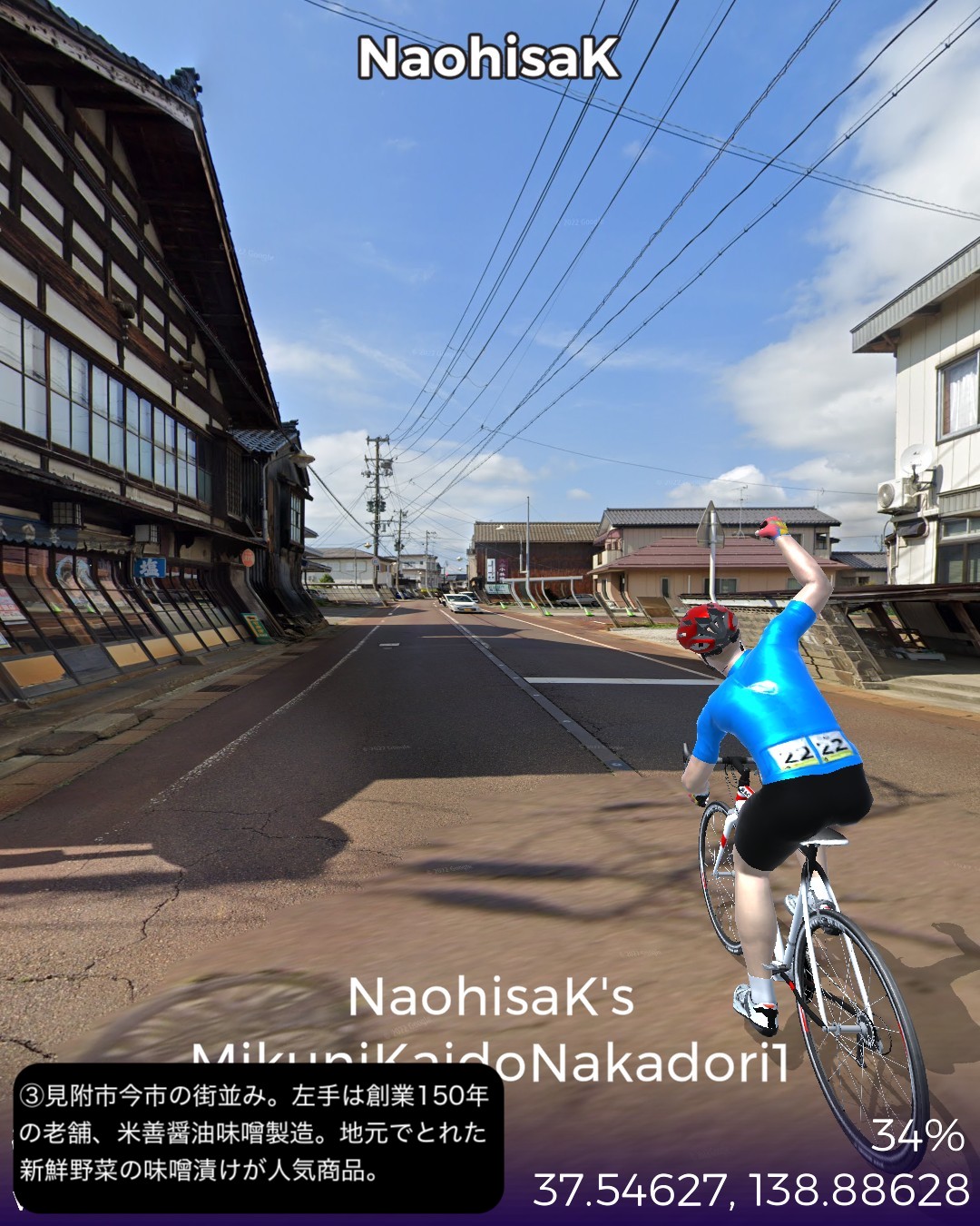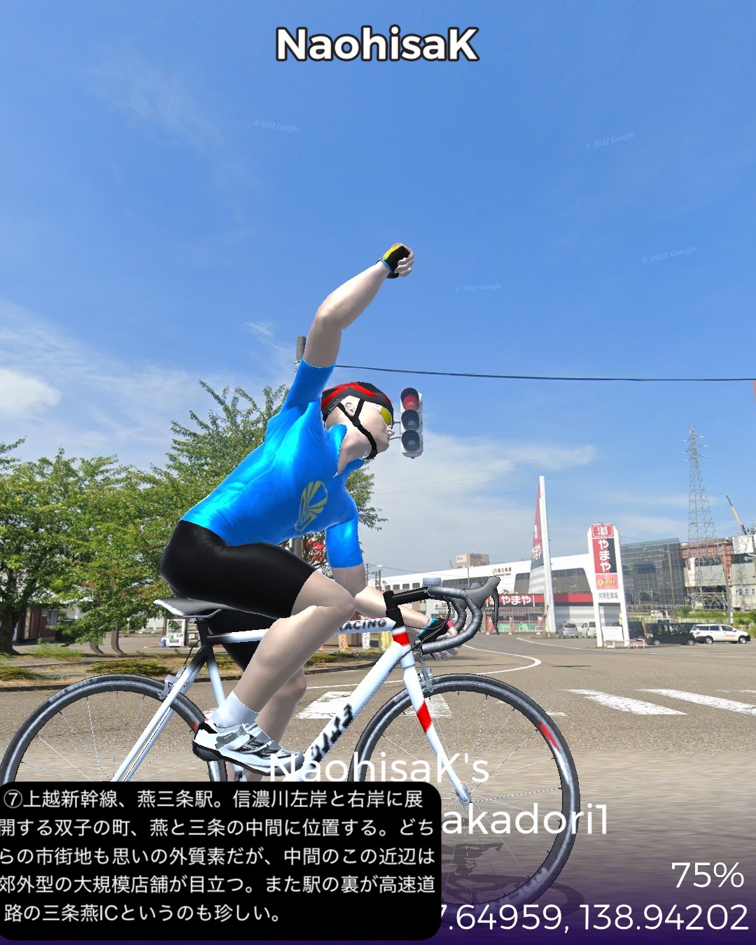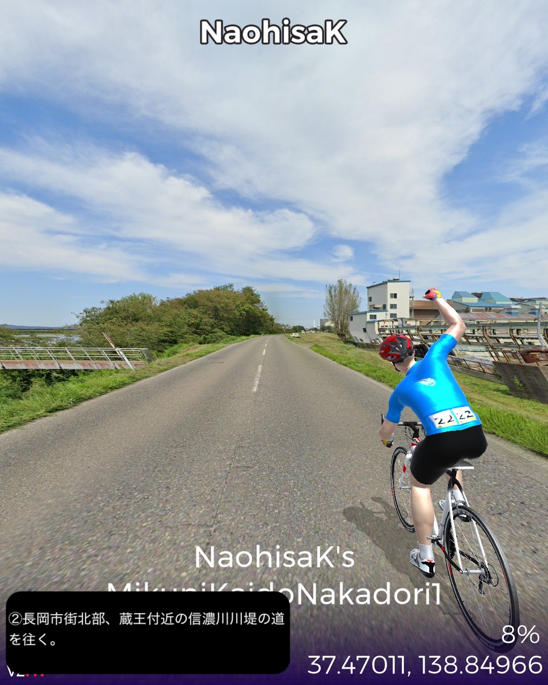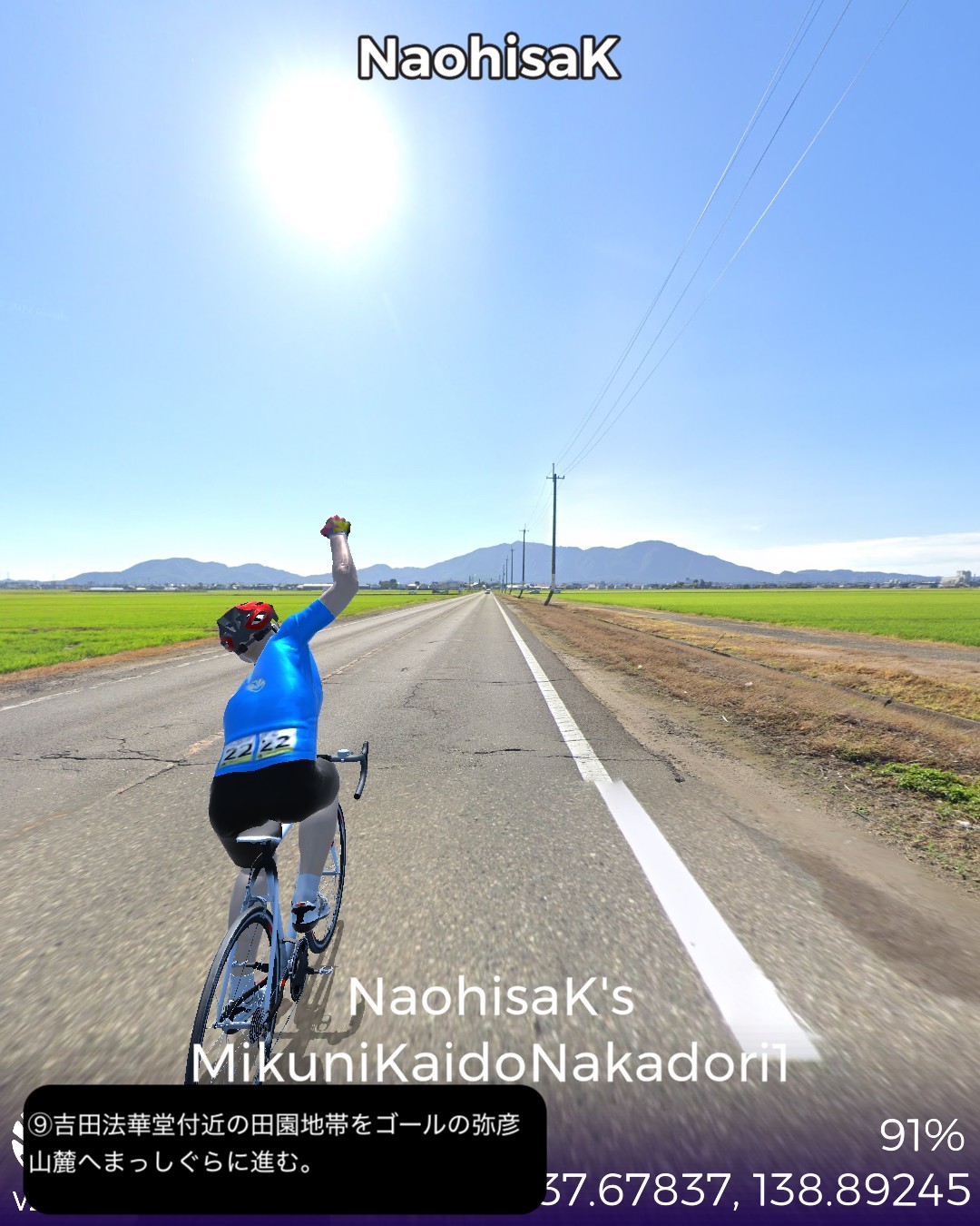 VRサイクリング、三国街道中通り1日目。三国街道は上州(群馬県)から寺泊に至るルートであるが、三国街道中通りは三国街道途中の長岡から越後の北に位置する新発田藩や村上藩に至る道として利用されていた三国街道とは異なる街道である。その三国街道中通りにより長岡をスタートしてどこまでも続く田園を抜けて職人の町三条市街へ、そこから街道を外れて寄り道コース、信濃川を渡って川向こうの同様の職人の町燕市街を抜けて、弥彦山麓の矢作にある弥彦神社の日本一の大鳥居をゴールとする40kmの行程。ルートを通じて見えていたのはゴールに近い弥彦山の双コブの山容。遠くに見えていたのがだんだん近く大きくなる行程であった。興味深かったのは信濃川を隔てて右岸と左岸に展開する三条と燕の市街。どちらも同じぐらいの街の大きさで金属加工を中心としたモノ作りの町、職人の町という同じ特殊な属性を持つ二重惑星のような双子の町が信濃川を挟んで隣り合っているのだ。そしてさらに面白いのはどちらの街も中心部は、至ってレトロで古い商店街とくすんだ色の家並が続くが、2つの市街地の間の信濃川に近い地区には上越新幹線の燕三条駅があり高速のICがありその周りに大きな郊外店舗が建ち並ぶ。こんな場所は他にないよね。さて次回は当面の目的地新潟市街に到達予定。