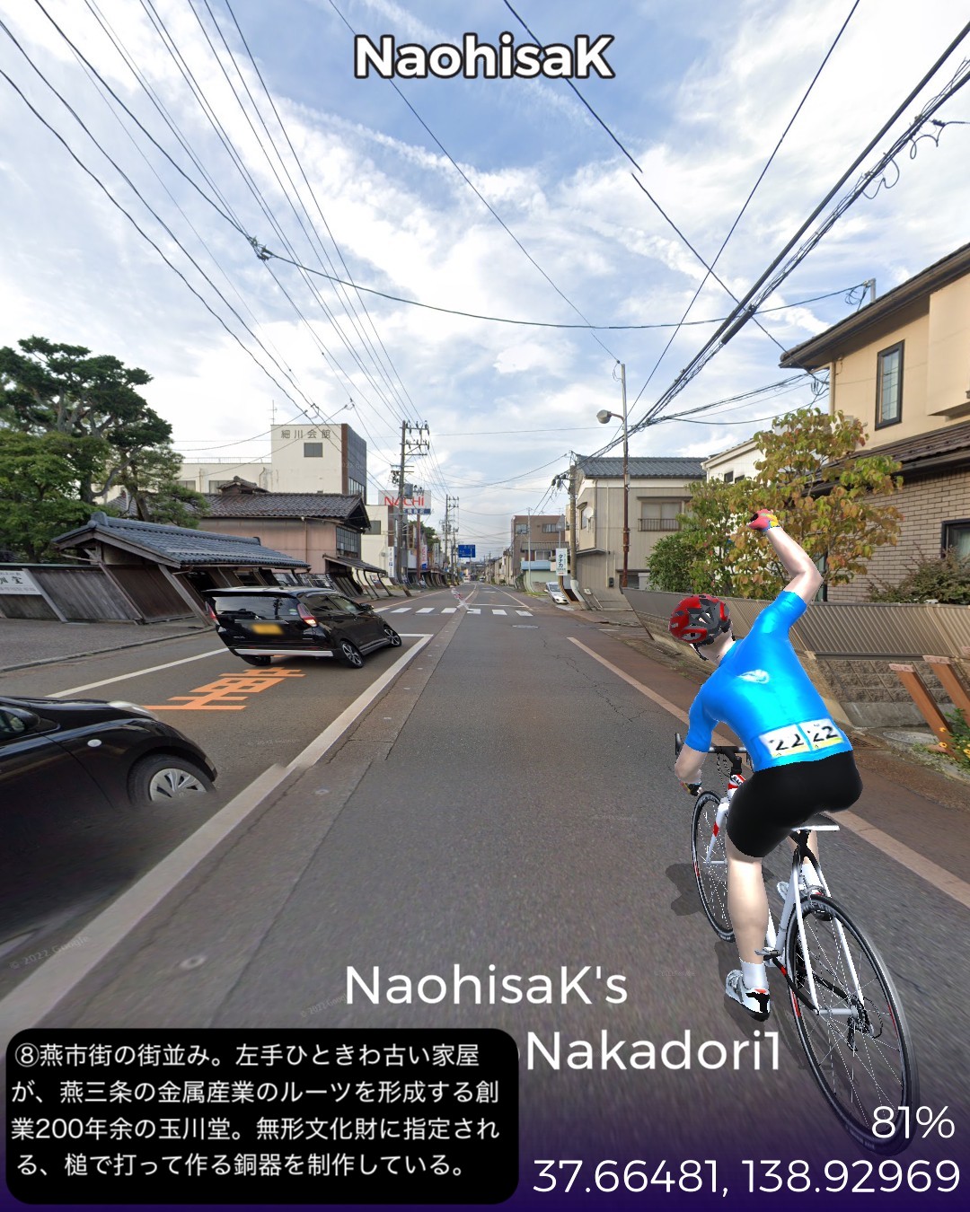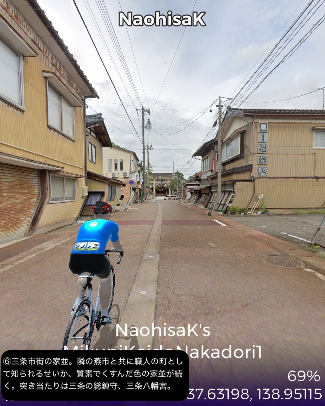 VRサイクリング、三国街道中通り1日目。三国街道は上州(群馬県)から寺泊に至るルートであるが、三国街道中通りは三国街道途中の長岡から越後の北に位置する新発田藩や村上藩に至る道として利用されていた三国街道とは異なる街道である。その三国街道中通りにより長岡をスタートしてどこまでも続く田園を抜けて職人の町三条市街へ、そこから街道を外れて寄り道コース、信濃川を渡って川向こうの同様の職人の町燕市街を抜けて、弥彦山麓の矢作にある弥彦神社の日本一の大鳥居をゴールとする40kmの行程。ルートを通じて見えていたのはゴールに近い弥彦山の双コブの山容。遠くに見えていたのがだんだん近く大きくなる行程であった。興味深かったのは信濃川を隔てて右岸と左岸に展開する三条と燕の市街。どちらも同じぐらいの街の大きさで金属加工を中心としたモノ作りの町、職人の町という同じ特殊な属性を持つ二重惑星のような双子の町が信濃川を挟んで隣り合っているのだ。そしてさらに面白いのはどちらの街も中心部は、至ってレトロで古い商店街とくすんだ色の家並が続くが、2つの市街地の間の信濃川に近い地区には上越新幹線の燕三条駅があり高速のICがありその周りに大きな郊外店舗が建ち並ぶ。こんな場所は他にないよね。さて次回は当面の目的地新潟市街に到達予定。