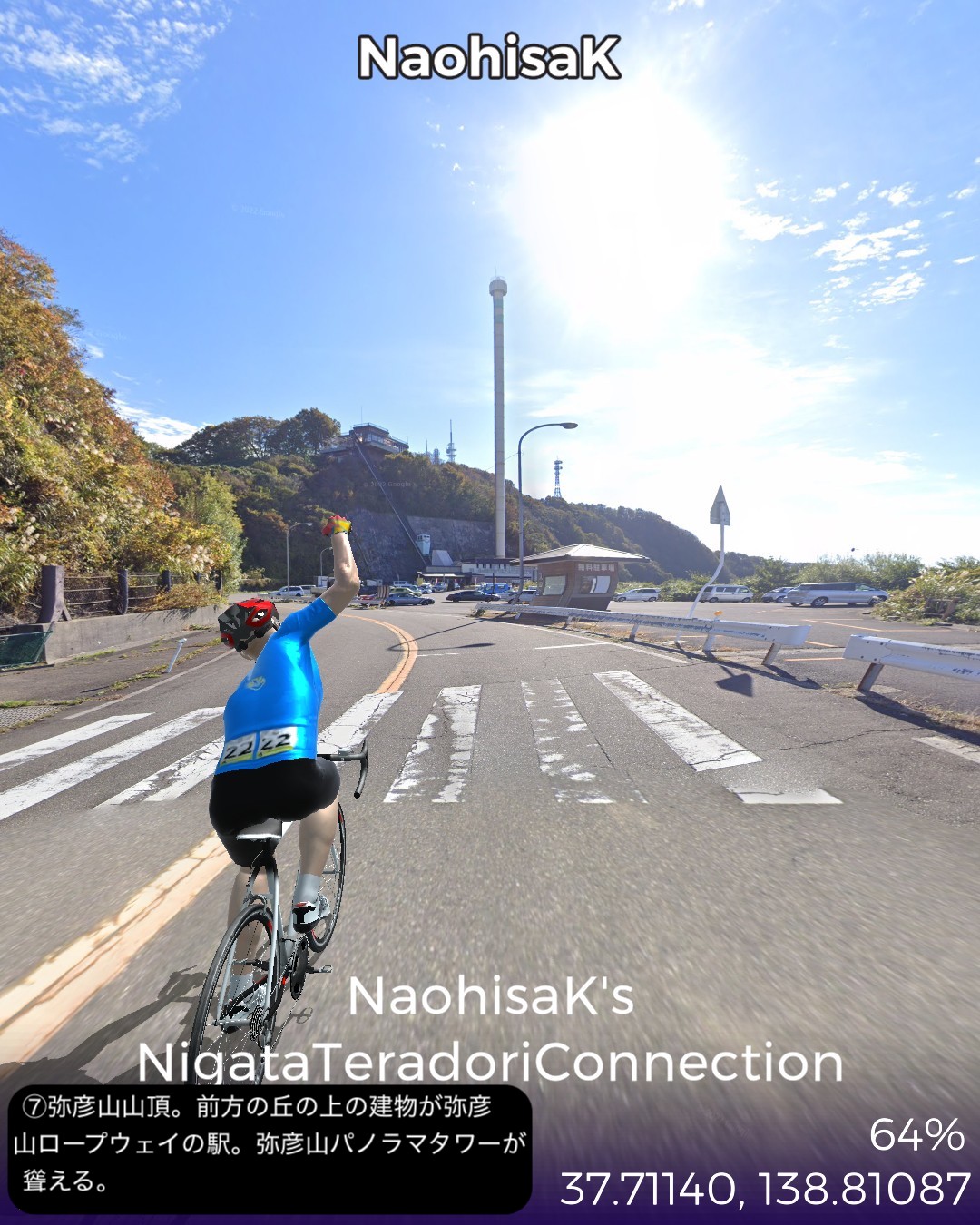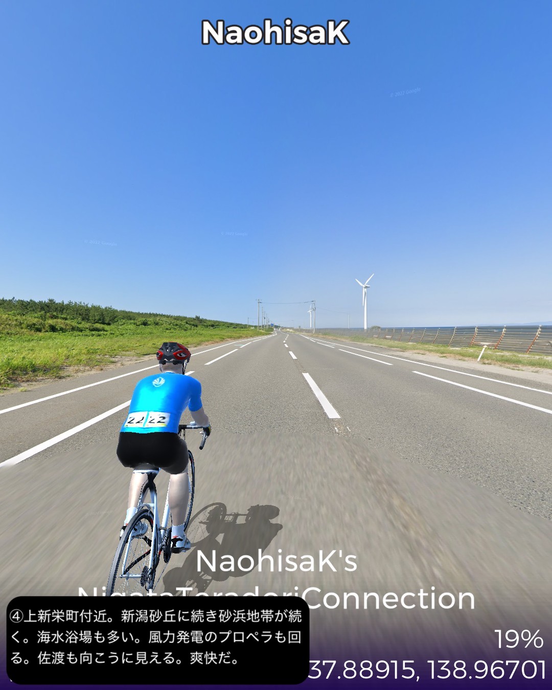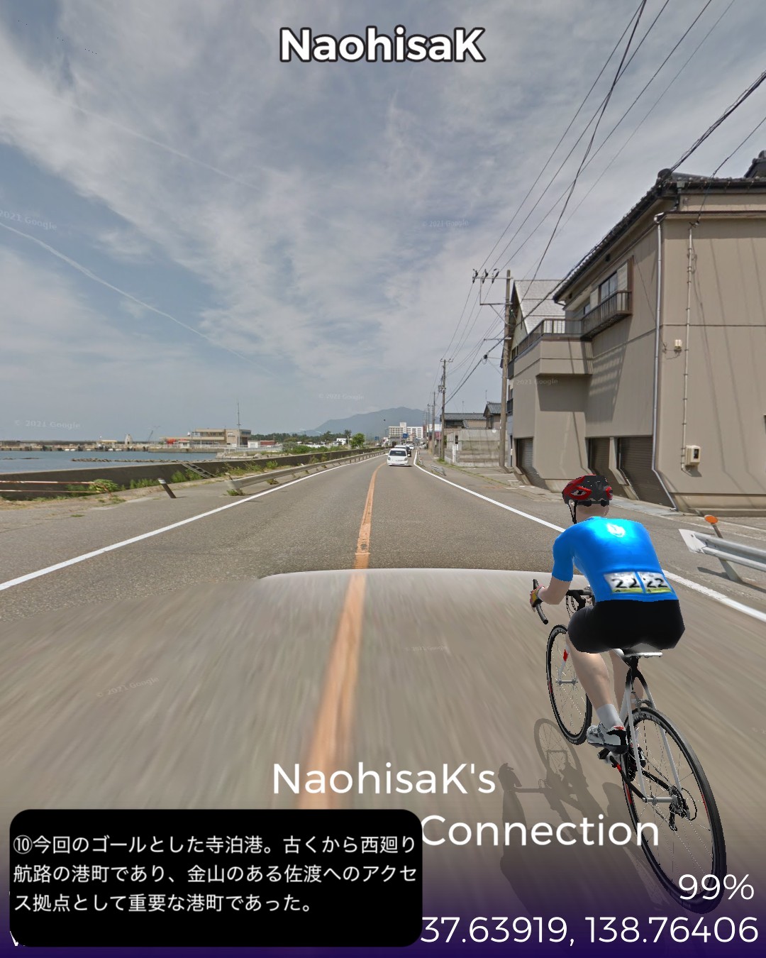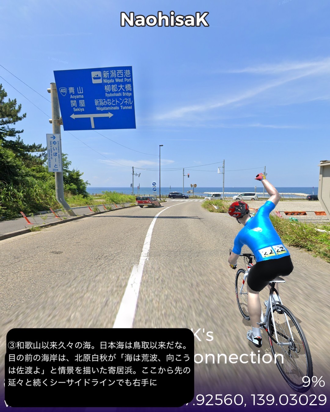 VRサイクリング 今回は次の街道旅への繋ぎの回。新潟市街をざっと巡った後、新潟砂丘など砂浜の続く海岸線沿いの道を進むと、途中から越前七浦シーサイドラインという奇岩が連続する荒々しい海岸の道に変化する。それから弥彦山スカイラインに入って標高634mの弥彦山の山頂へ登って下り最後は古くからの西廻り航路の港町寺泊まで76kmの長丁場。和歌山以来4ヶ月半ぶりに海を見た。日本海は鳥取以来9ヶ月ぶり。その久々の海岸が、「海は荒海、向こうは佐渡よ」と北原白秋の童謡砂山で歌われた新潟市の寄居浜。その後海岸沿い右手に常に佐渡島が見えていた。久々の海岸は開放的で気持ちがいい。日本は小さな島国なのに街道を中心に走っていると海岸沿いを走ることが意外と少ない。実は今回の新潟・寺泊間は北國街道という街道が通っているのだがこれは海岸からちょっと離れた道なのだ。これをいずれ通ることを想定してあえて外して街道ではないシーサイドラインをチョイスしたわけだ。弥彦山も海沿いなので日本海と佐渡のながめが素晴らしい。次回からは寺泊を起点として、佐渡からの航路で運んだ金を運ぶルートとして整備されてきた三国街道を進む。