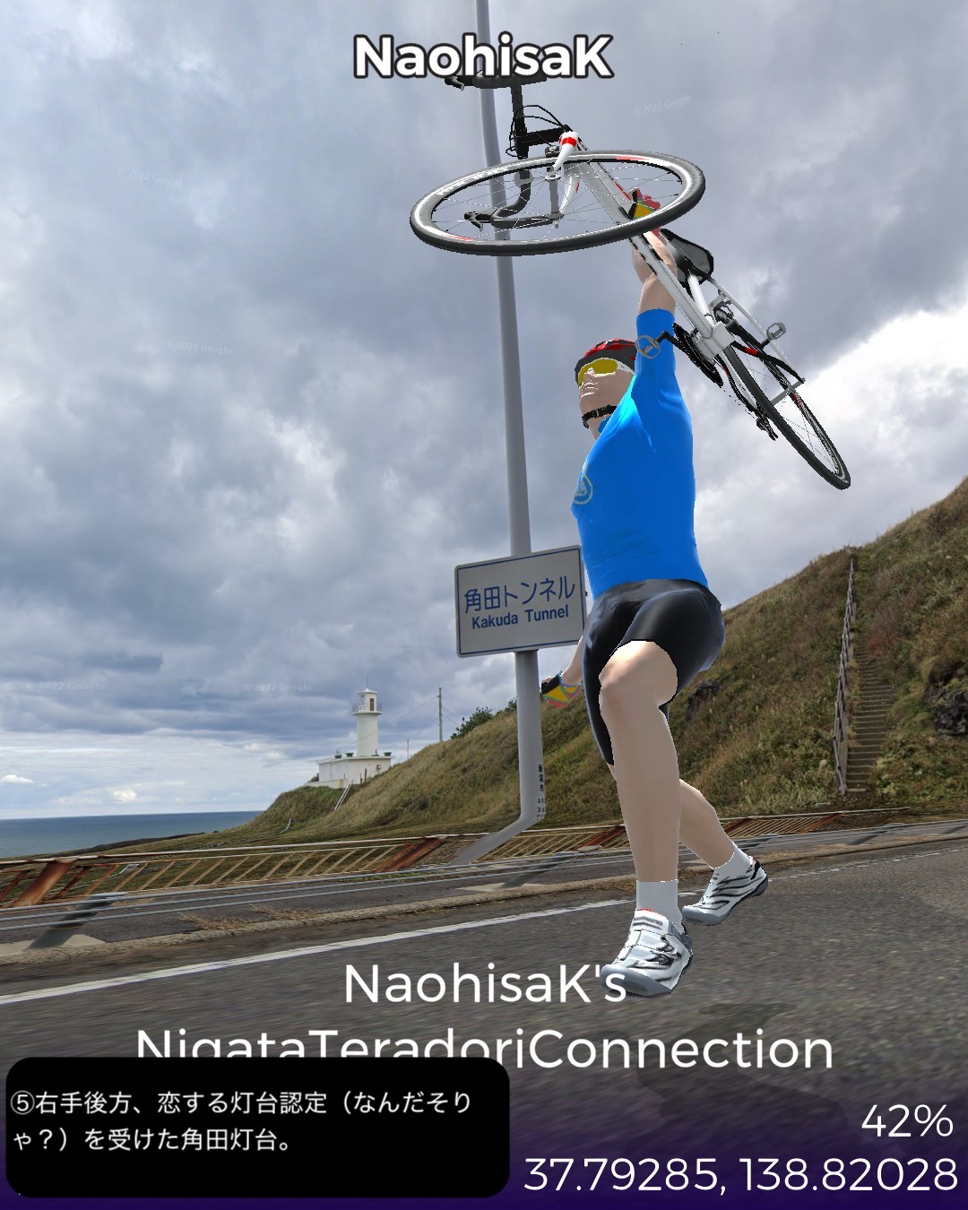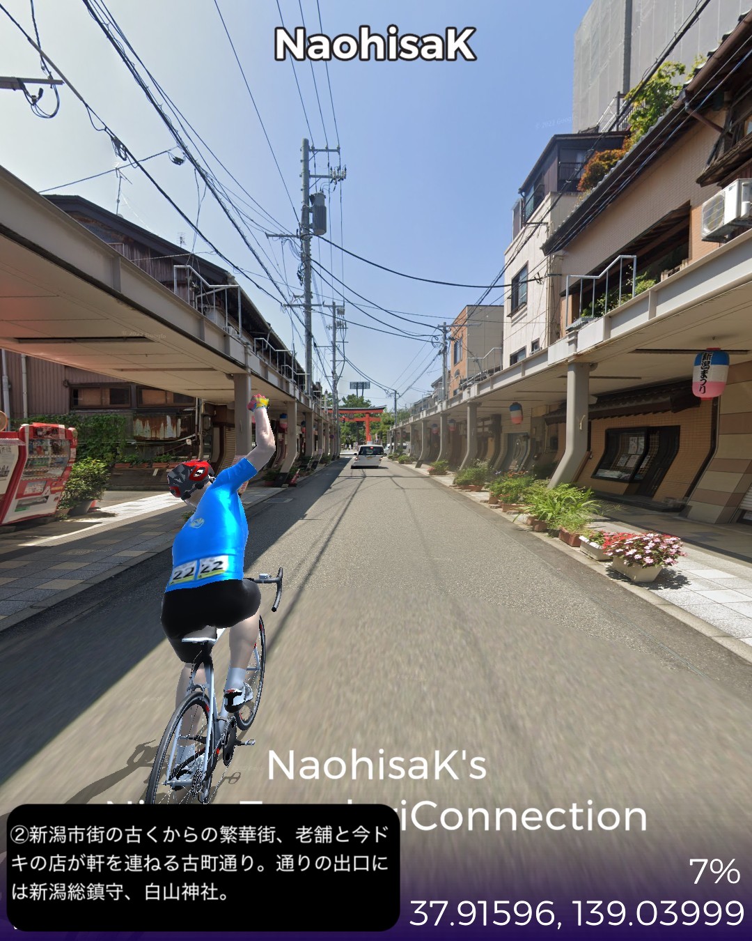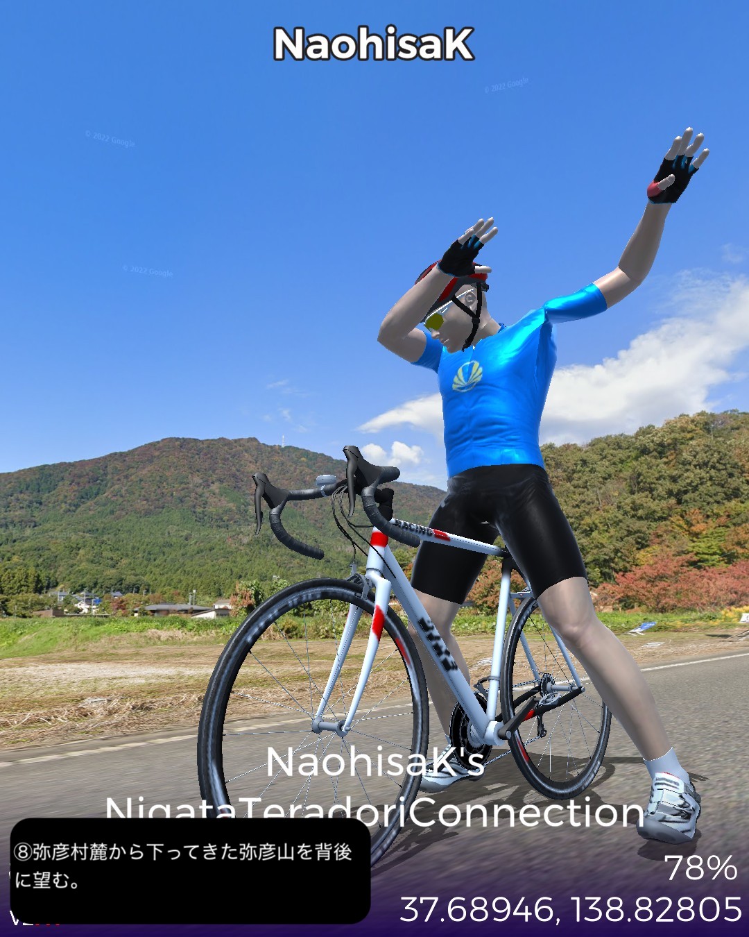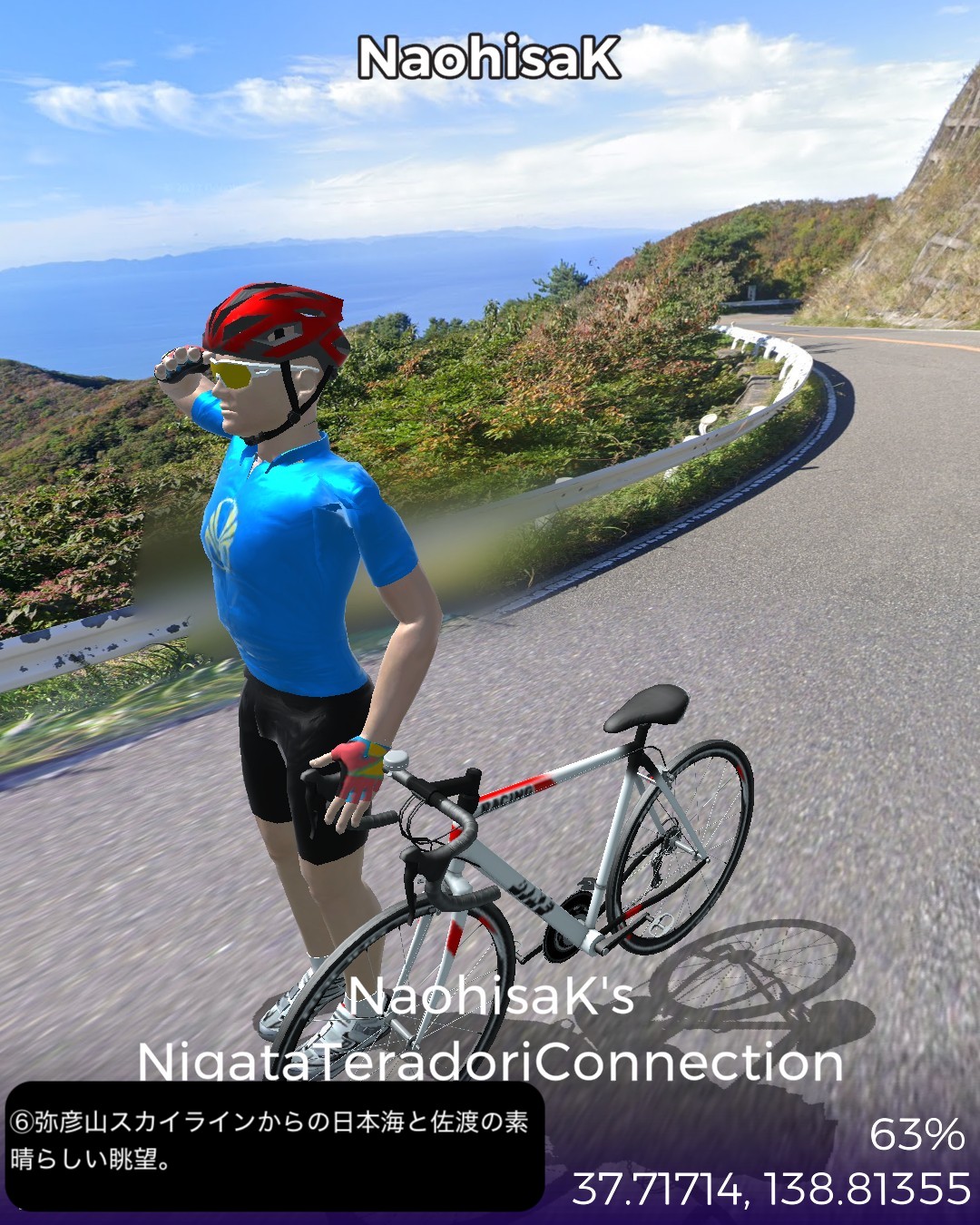 VRサイクリング 今回は次の街道旅への繋ぎの回。新潟市街をざっと巡った後、新潟砂丘など砂浜の続く海岸線沿いの道を進むと、途中から越前七浦シーサイドラインという奇岩が連続する荒々しい海岸の道に変化する。それから弥彦山スカイラインに入って標高634mの弥彦山の山頂へ登って下り最後は古くからの西廻り航路の港町寺泊まで76kmの長丁場。和歌山以来4ヶ月半ぶりに海を見た。日本海は鳥取以来9ヶ月ぶり。その久々の海岸が、「海は荒海、向こうは佐渡よ」と北原白秋の童謡砂山で歌われた新潟市の寄居浜。その後海岸沿い右手に常に佐渡島が見えていた。久々の海岸は開放的で気持ちがいい。日本は小さな島国なのに街道を中心に走っていると海岸沿いを走ることが意外と少ない。実は今回の新潟・寺泊間は北國街道という街道が通っているのだがこれは海岸からちょっと離れた道なのだ。これをいずれ通ることを想定してあえて外して街道ではないシーサイドラインをチョイスしたわけだ。弥彦山も海沿いなので日本海と佐渡のながめが素晴らしい。次回からは寺泊を起点として、佐渡からの航路で運んだ金を運ぶルートとして整備されてきた三国街道を進む。