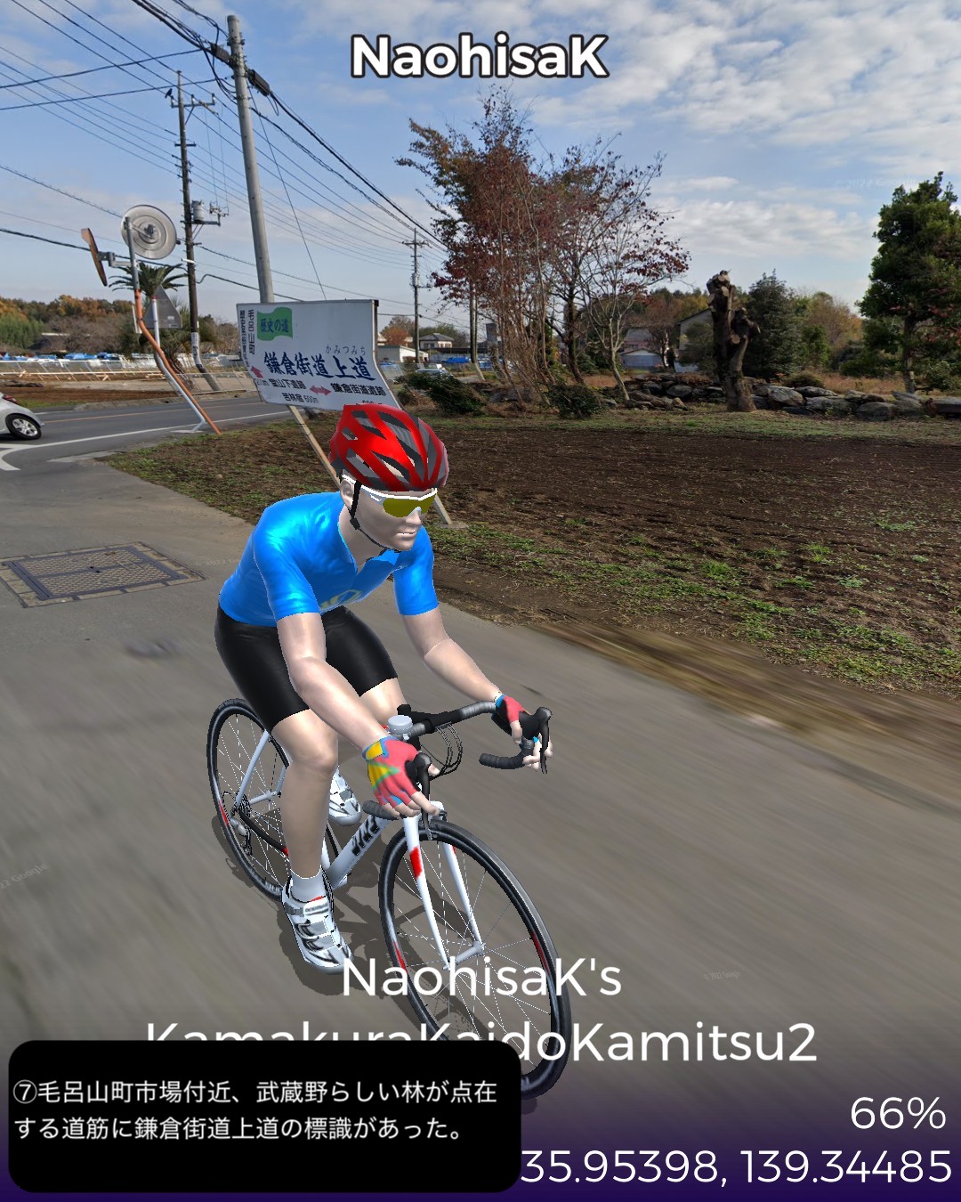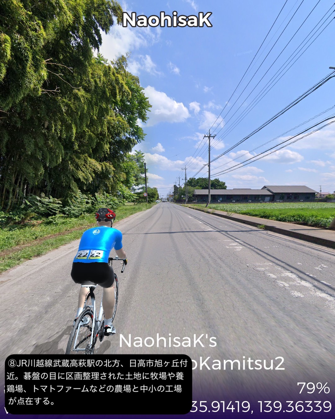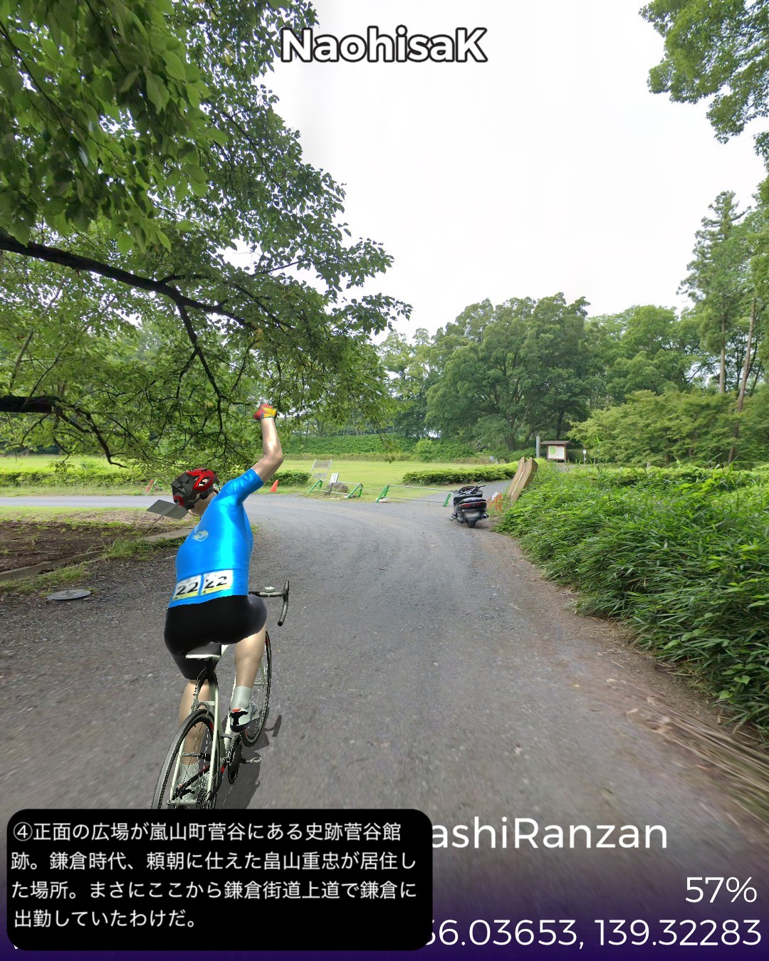VRサイクリング 鎌倉街道上道2日目。JR八高線と関越自動車道のほぼ真ん中あたりの武蔵野を進む回。寄居に近い秩父鉄道沿線の小前田をスタートし、荒川を越え、源義賢、木曽義仲、畠山重忠という平安時代末期から鎌倉時代の武将にゆかりの地嵐山を通り、鳩山、毛呂山、日高あたりの林が点在する平地、丘陵地という典型的な武蔵野の風景の中を突き抜けて狭山市に至る45kmの行程。前回より鎌倉時代に関連する史跡が多くなってきた。特に嵐山にある菅谷館跡は源頼朝に使えた武将畠山重忠が居住していたとされる場所。鎌倉殿の13人で中川大志君が演じていたのが記憶に新しい。そのイメージでここからまさに鎌倉街道上道をひた走って鎌倉に出勤していたんだな、と思うと興味深い。狭山市という都心に通じる西武新宿線の沿線に到達したが、この先都心方向へ進まないのがミソだ。江戸時代以降現代人の我々に至るまで無意識にハブと捉えられる江戸・東京は江戸時代以前は葦の生い茂る湿地帯の僻地で誰もそっちに用事はなかった。その頃のハブ、いざ鎌倉へ向かうベクトル、つまり次回もひたすら南へ進むのだ。