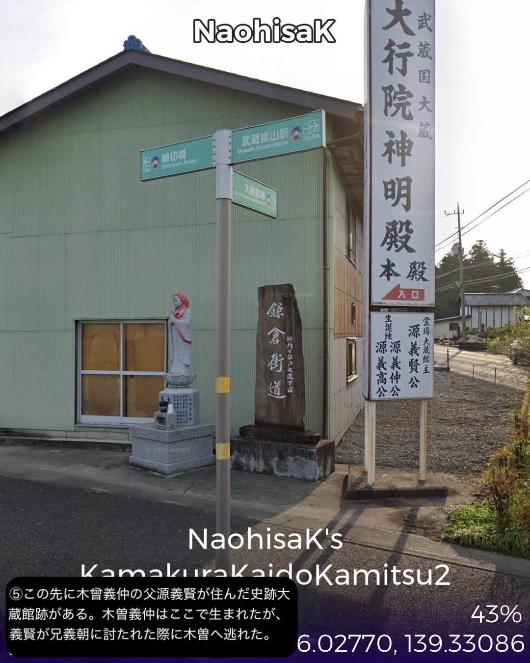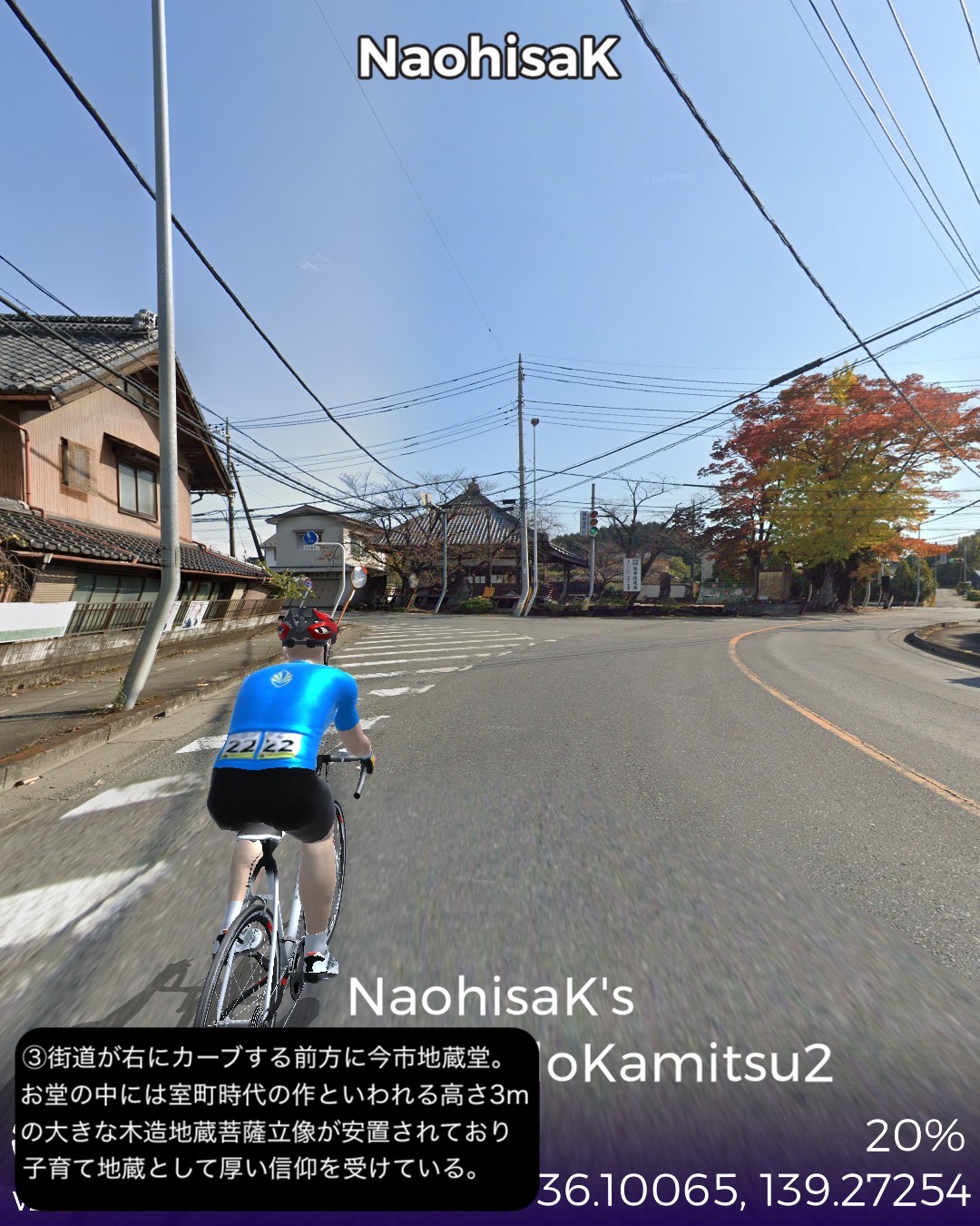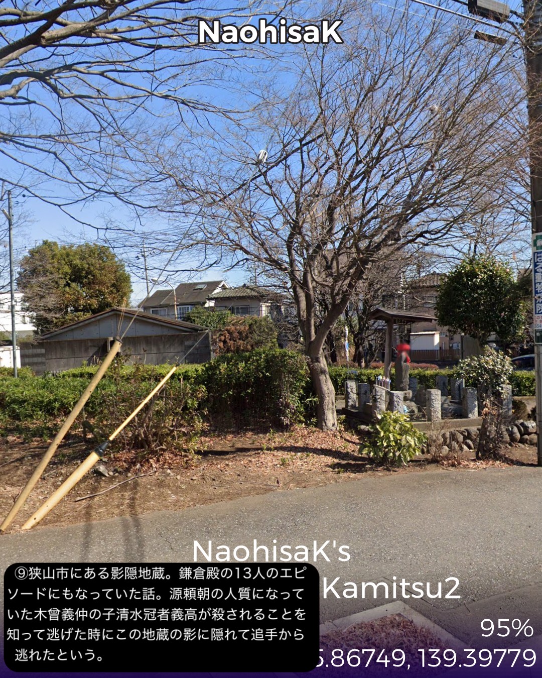 VRサイクリング 鎌倉街道上道2日目。JR八高線と関越自動車道のほぼ真ん中あたりの武蔵野を進む回。寄居に近い秩父鉄道沿線の小前田をスタートし、荒川を越え、源義賢、木曽義仲、畠山重忠という平安時代末期から鎌倉時代の武将にゆかりの地嵐山を通り、鳩山、毛呂山、日高あたりの林が点在する平地、丘陵地という典型的な武蔵野の風景の中を突き抜けて狭山市に至る45kmの行程。前回より鎌倉時代に関連する史跡が多くなってきた。特に嵐山にある菅谷館跡は源頼朝に使えた武将畠山重忠が居住していたとされる場所。鎌倉殿の13人で中川大志君が演じていたのが記憶に新しい。そのイメージでここからまさに鎌倉街道上道をひた走って鎌倉に出勤していたんだな、と思うと興味深い。狭山市という都心に通じる西武新宿線の沿線に到達したが、この先都心方向へ進まないのがミソだ。江戸時代以降現代人の我々に至るまで無意識にハブと捉えられる江戸・東京は江戸時代以前は葦の生い茂る湿地帯の僻地で誰もそっちに用事はなかった。その頃のハブ、いざ鎌倉へ向かうベクトル、つまり次回もひたすら南へ進むのだ。