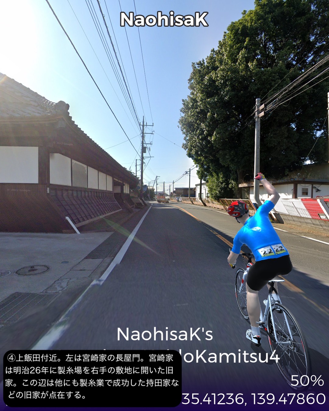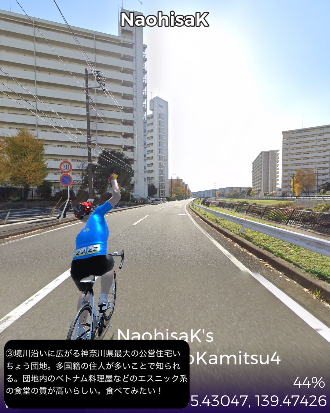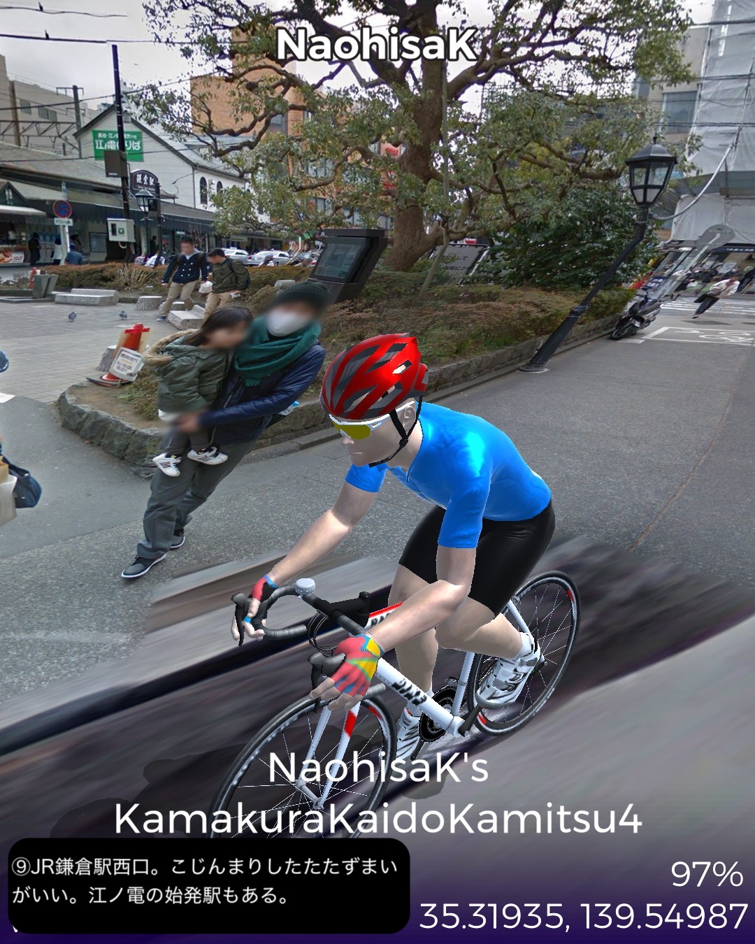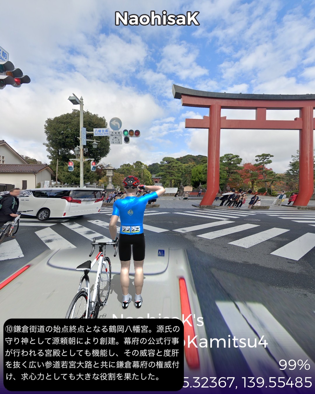 VRサイクリング 鎌倉街道上道 4日目。いよいよゴール古都鎌倉に到着する街道完結編。町田駅前をスタートし、小田急江ノ島線の数km東を並行して進むルート。瀬谷、飯田を抜けて鎌倉に北西から入って鶴岡八幡宮まで35kmの行程。ほぼほぼベッドタウンの住宅街を延々と進む道中ではあるが、瀬谷の中屋敷、飯田、俣野付近は緑が多くまた古の史跡や伝統的な家屋が点在し街道情緒が感じられた。街道に沿って鎌倉へ入ってゆくと海に面した都市でありながら深い山に囲まれて天然要塞と言われる由縁が体感できる。ここまで日本の半分をあちこち回ってきた中でも群を抜いてその特殊性が強く感じられる風土である。源頼朝は鎌倉幕府を開くにあたり、立派な鶴岡八幡宮とそのだだっ広く長い参道若宮大路のみの建設を指示し、それ以外はケアしなかったらしい。関東武士達の度肝を抜く威容が源氏の権威付けとなりその後の源平合戦に勝利した遠因となったことは想像に難くない。ゆく年くる年でもメイン会場になっていたその鶴岡八幡宮に狙った通り元旦に到着。今年も健康で順調に街道の旅がつづけられますように、また皆様のご多幸と世界の平和を祈念してバーチャルに参拝致しました。さて次回は鎌倉を出て鎌倉街道中道へ入ってゆく予定です。