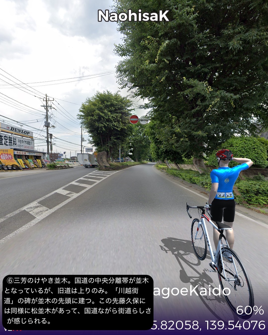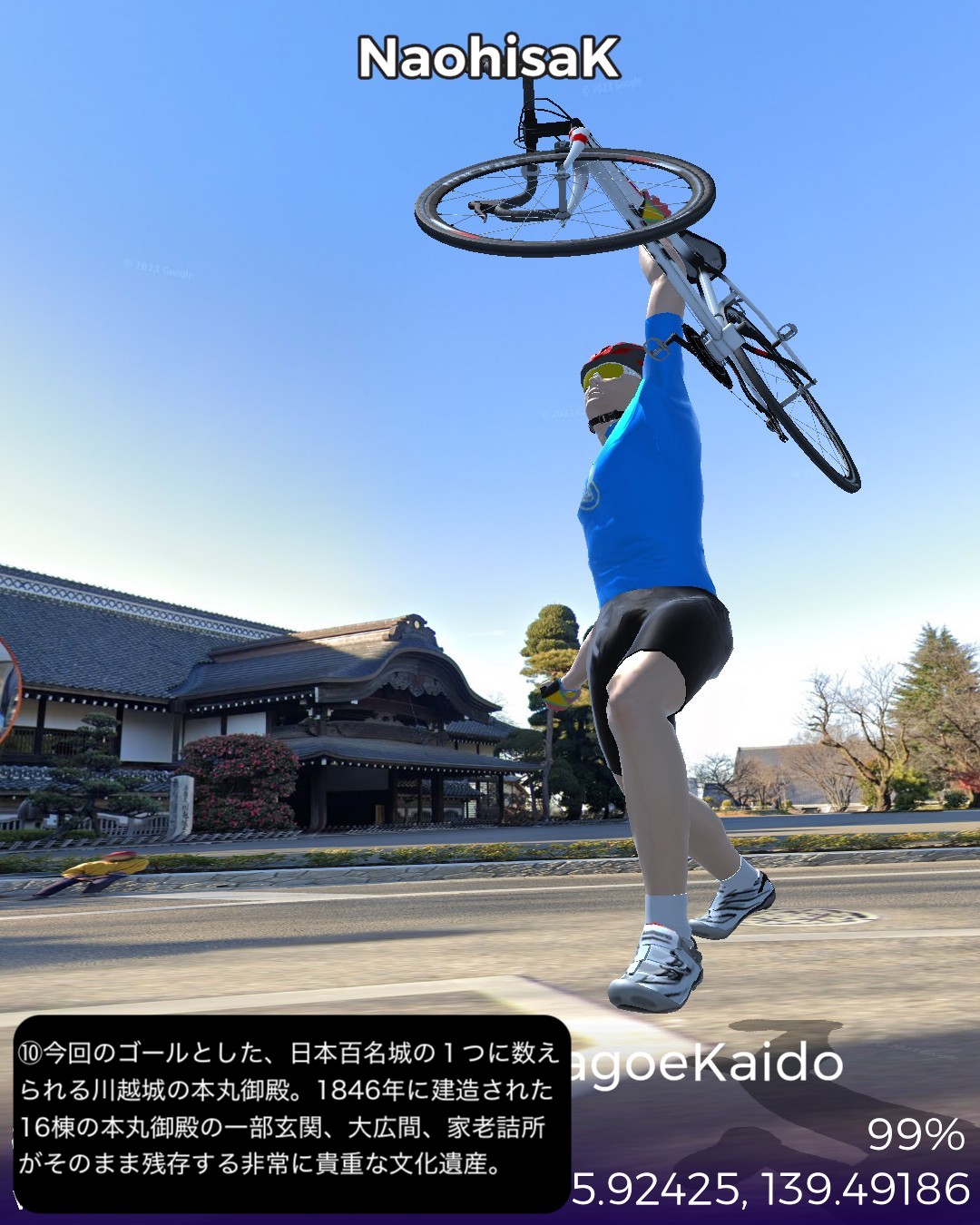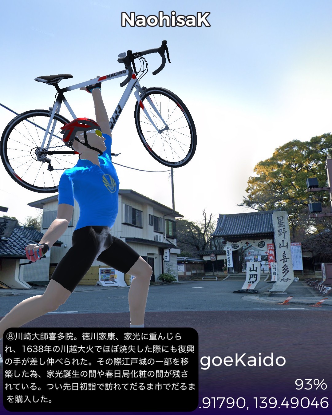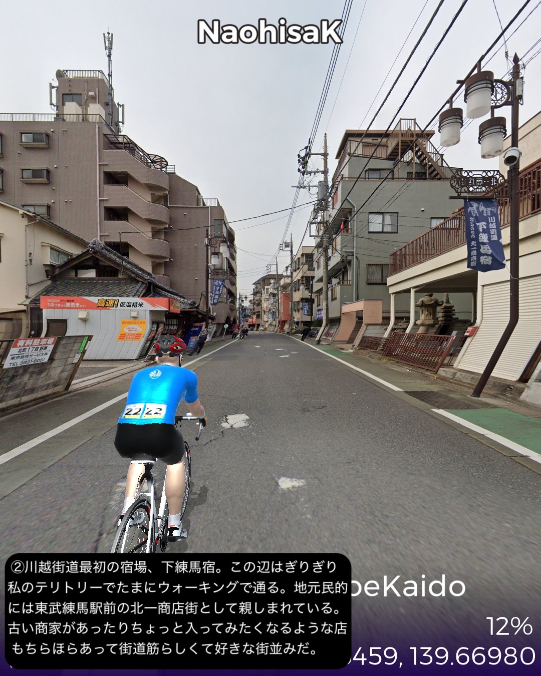 VRサイクリング 今回から江戸を起点とした秩父巡礼のみちを辿る。その1回目として川越街道で川越まで進む。中山道と川越街道との分岐点である板橋宿に近い平尾追分を出発し、最初の宿場である東武練馬駅付近の下練馬宿までは賑やかな商店街が断続的にウネウネと続く旧道。その先は地元となるのでちょっと街道を外れて光が丘公園や自宅前など馴染みの場所を挨拶まわりした後、街道に戻り埼玉県方面へ進む。白子宿、膝折宿と行くうちに急速に田園風景化しているのに気づく。三芳付近からふじみ野の大井宿あたりまで国道に収まるが、けやき並木や杉並木が続き意外と街道風情が感じられる。その先はまた旧道に入って川越市街。最後にちょっと寄り道して川越の名所、喜多院、蔵造りの街並みの一番街を経由してゴールとした川越城本丸御殿まで38kmの行程。前半は自宅周辺でお馴染みの道・街並みであったが、大山ハッピーロードが川越街道旧道だったのは初めて知ったし、それ以外にも想定と違った旧道が何箇所かあり面白かった。川越はここ数年、年に一度は訪れて老舗でうなぎを食べてそぞろ歩きをするデートリップの目的地としてお気に入りの街。なかなか奥が深い街だとわかってきた。うちからだと都心へ行くのと変わらない時間で旅行気分が味わえる。秩父巡礼についてはまた次回。