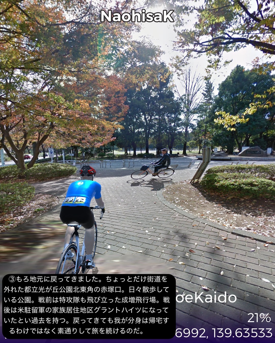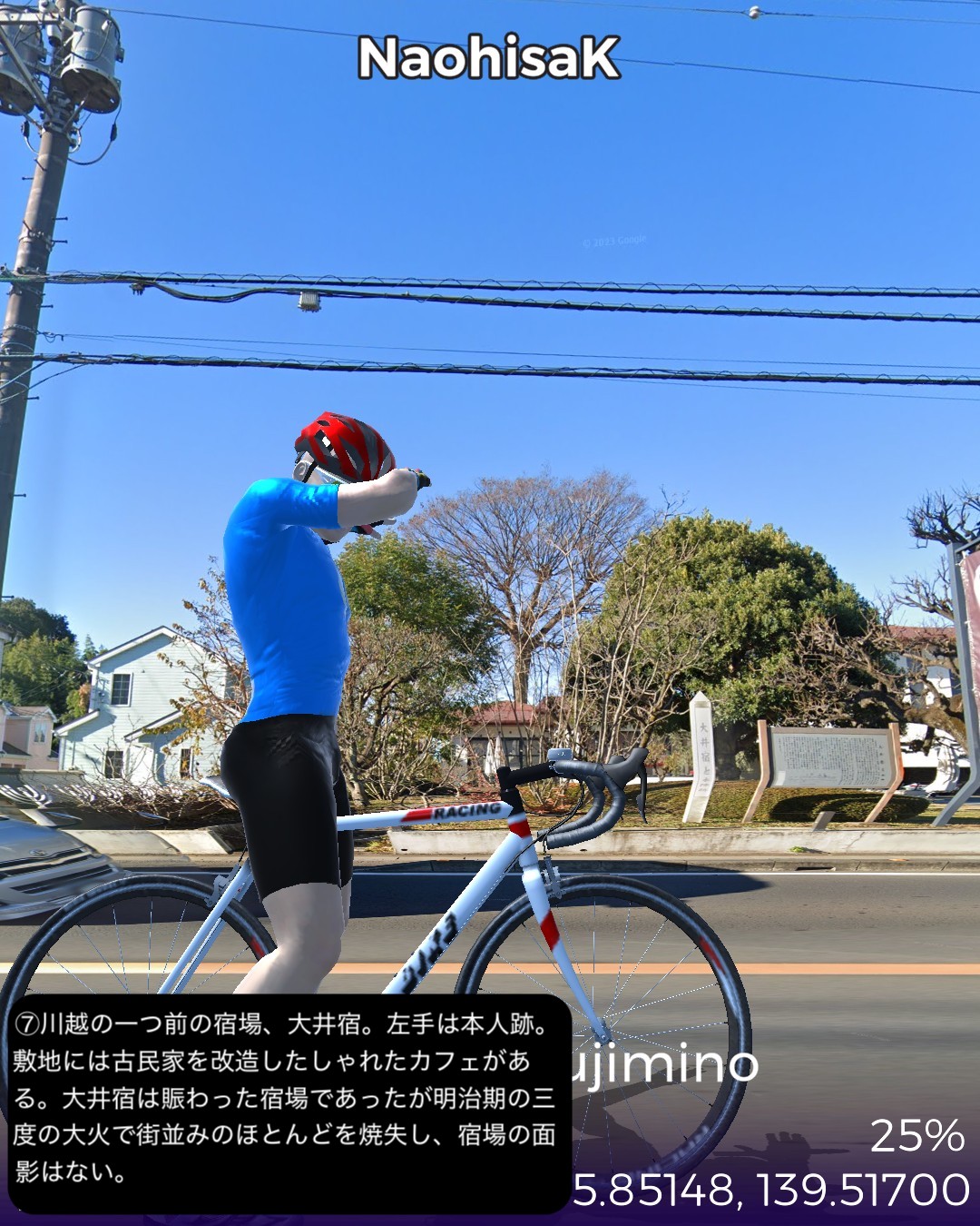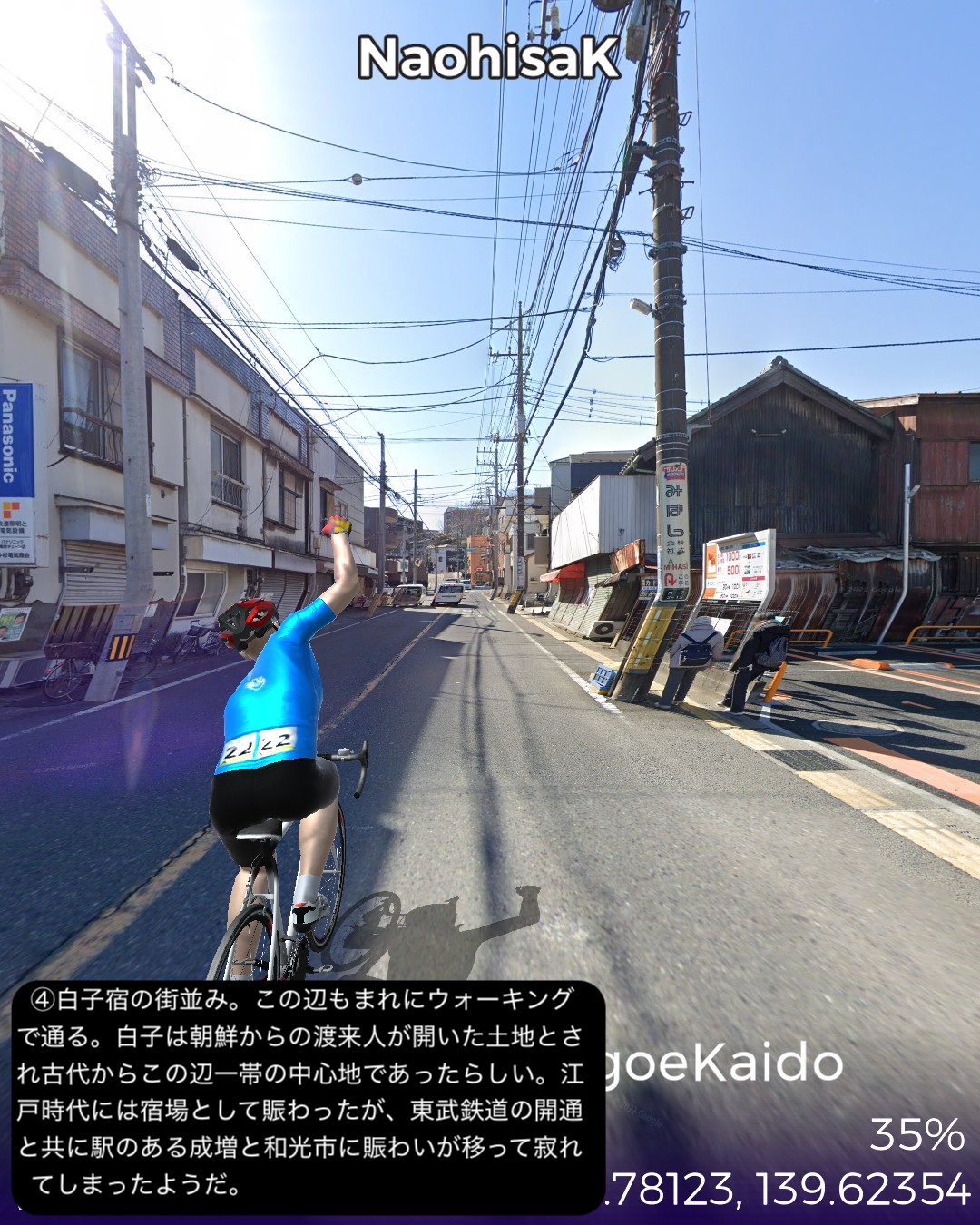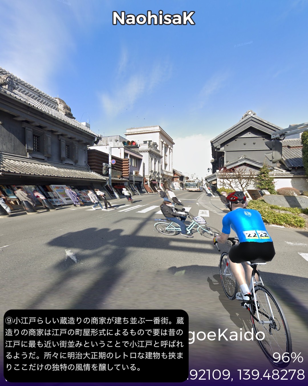 VRサイクリング 今回から江戸を起点とした秩父巡礼のみちを辿る。その1回目として川越街道で川越まで進む。中山道と川越街道との分岐点である板橋宿に近い平尾追分を出発し、最初の宿場である東武練馬駅付近の下練馬宿までは賑やかな商店街が断続的にウネウネと続く旧道。その先は地元となるのでちょっと街道を外れて光が丘公園や自宅前など馴染みの場所を挨拶まわりした後、街道に戻り埼玉県方面へ進む。白子宿、膝折宿と行くうちに急速に田園風景化しているのに気づく。三芳付近からふじみ野の大井宿あたりまで国道に収まるが、けやき並木や杉並木が続き意外と街道風情が感じられる。その先はまた旧道に入って川越市街。最後にちょっと寄り道して川越の名所、喜多院、蔵造りの街並みの一番街を経由してゴールとした川越城本丸御殿まで38kmの行程。前半は自宅周辺でお馴染みの道・街並みであったが、大山ハッピーロードが川越街道旧道だったのは初めて知ったし、それ以外にも想定と違った旧道が何箇所かあり面白かった。川越はここ数年、年に一度は訪れて老舗でうなぎを食べてそぞろ歩きをするデートリップの目的地としてお気に入りの街。なかなか奥が深い街だとわかってきた。うちからだと都心へ行くのと変わらない時間で旅行気分が味わえる。秩父巡礼についてはまた次回。