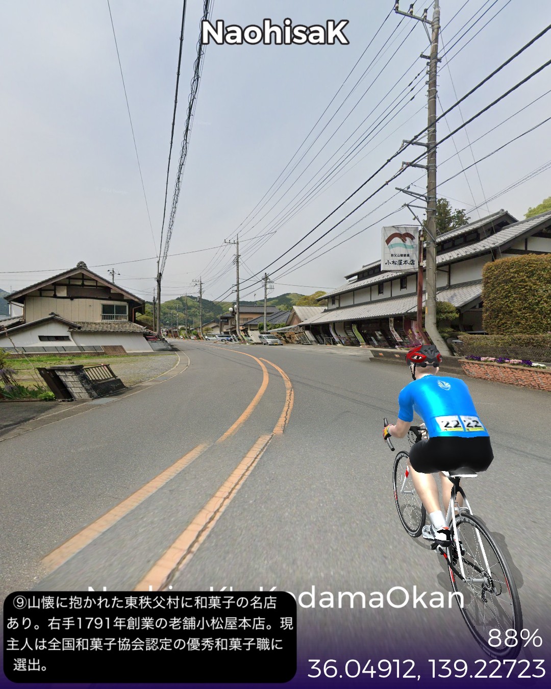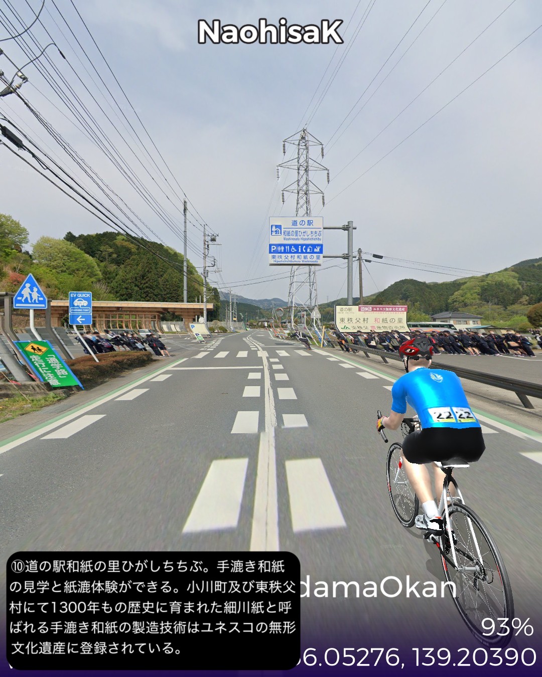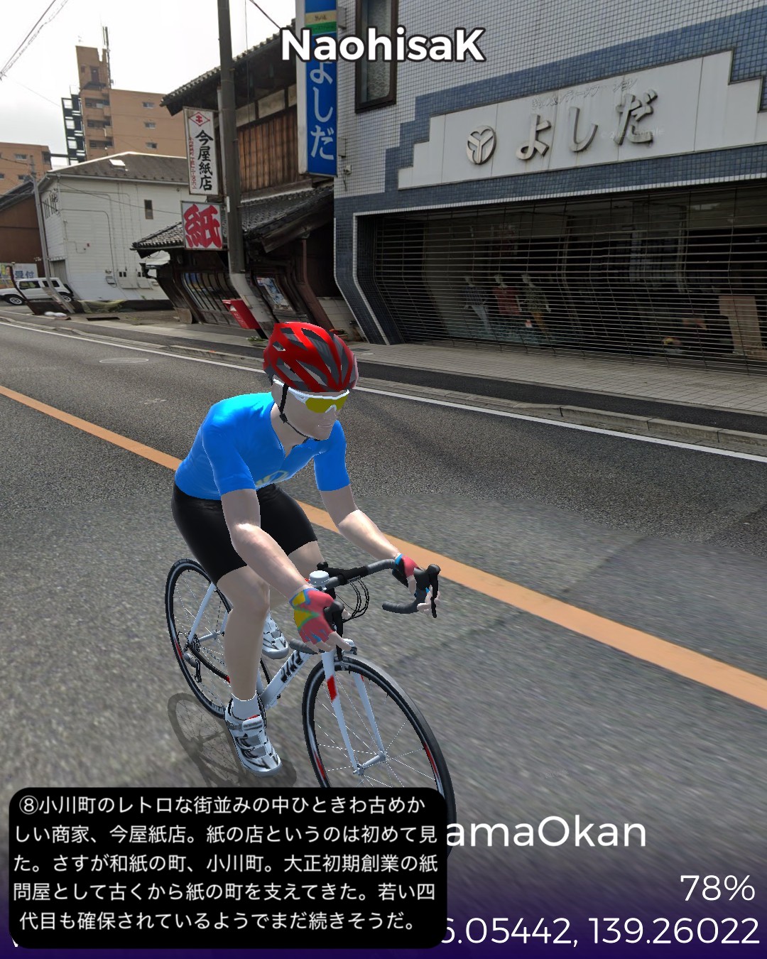 VRサイクリング 児玉往還。川越から先秩父巡礼の起点へ向けて山里へ分け入ってゆく回。蔵の町川越を出発し、前半は児玉往還を辿り関東平野の縁の田園地帯を高坂宿、さらに以前鎌倉街道上道で通過した嵐山付近の菅谷宿まで進む。そこから児玉往還から外れて嵐山渓谷を掠めて小川町を経由して秩父巡礼道の起点となる山里東秩父村まで到達する42kmの行程。児玉往還から外れた後半の山里の道が久々で新鮮であった。小川町とゴール東秩父村は1300年もの歴史に育まれた手漉き和紙の里として知られ、ユネスコの無形文化遺産として登録されている。小川町には初めて見る紙店があった。さて秩父巡礼であるが、江戸時代、西国、坂東と並び3大観音霊場として秩父霊場(札所)巡礼は、霊場がコンパクトにまとまった地域に密集していてコンプリートしやすいところから特に人気があった。江戸から巡礼する場合には前回の川越街道で川越を経て、今回の児玉往還から小川町、東秩父村と進んで、次回からの秩父巡礼道に入って34箇所の札所を1番から34番まで順に参拝してゆくことになる。