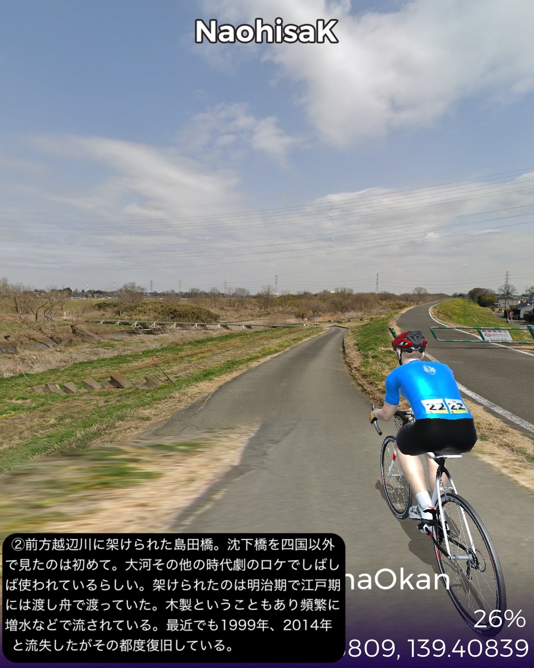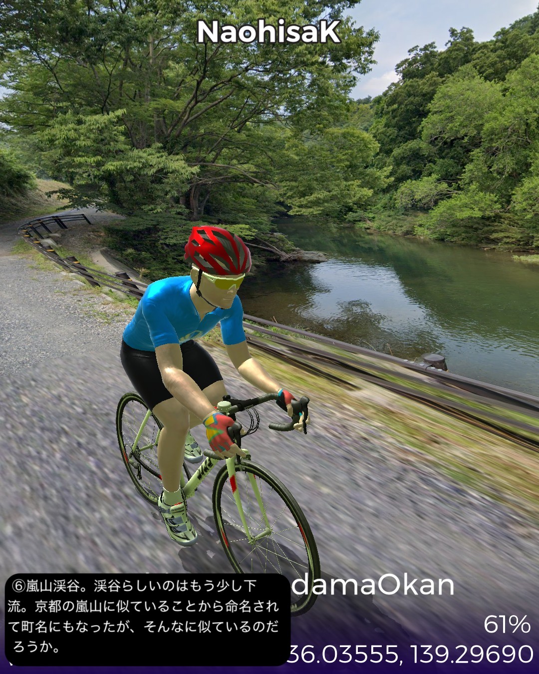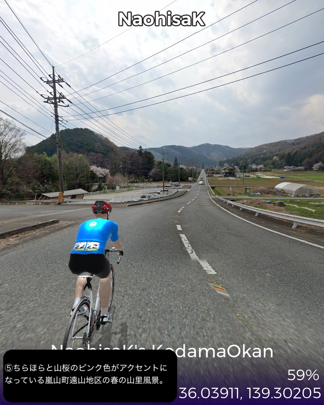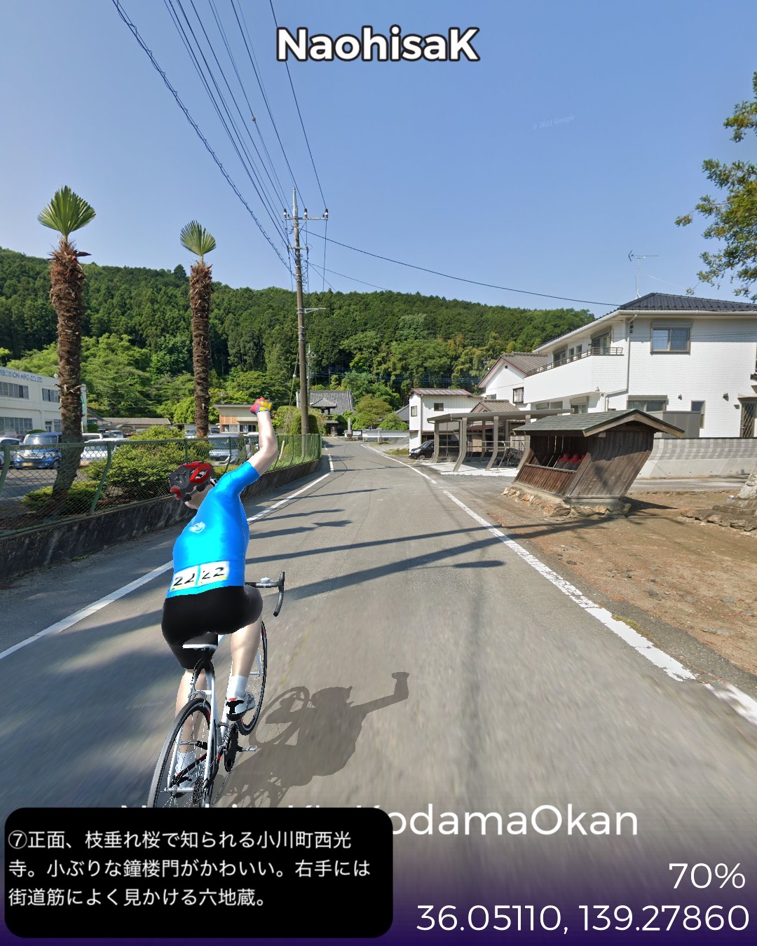 VRサイクリング 児玉往還。川越から先秩父巡礼の起点へ向けて山里へ分け入ってゆく回。蔵の町川越を出発し、前半は児玉往還を辿り関東平野の縁の田園地帯を高坂宿、さらに以前鎌倉街道上道で通過した嵐山付近の菅谷宿まで進む。そこから児玉往還から外れて嵐山渓谷を掠めて小川町を経由して秩父巡礼道の起点となる山里東秩父村まで到達する42kmの行程。児玉往還から外れた後半の山里の道が久々で新鮮であった。小川町とゴール東秩父村は1300年もの歴史に育まれた手漉き和紙の里として知られ、ユネスコの無形文化遺産として登録されている。小川町には初めて見る紙店があった。さて秩父巡礼であるが、江戸時代、西国、坂東と並び3大観音霊場として秩父霊場(札所)巡礼は、霊場がコンパクトにまとまった地域に密集していてコンプリートしやすいところから特に人気があった。江戸から巡礼する場合には前回の川越街道で川越を経て、今回の児玉往還から小川町、東秩父村と進んで、次回からの秩父巡礼道に入って34箇所の札所を1番から34番まで順に参拝してゆくことになる。