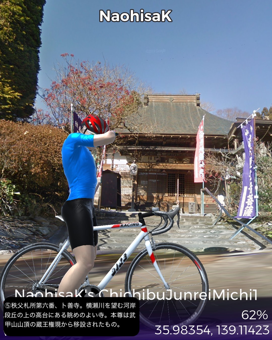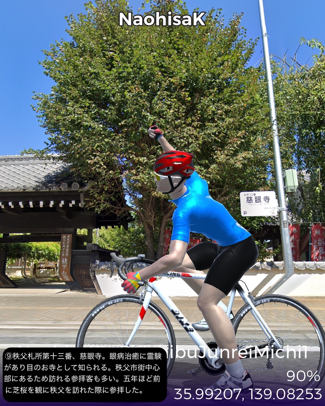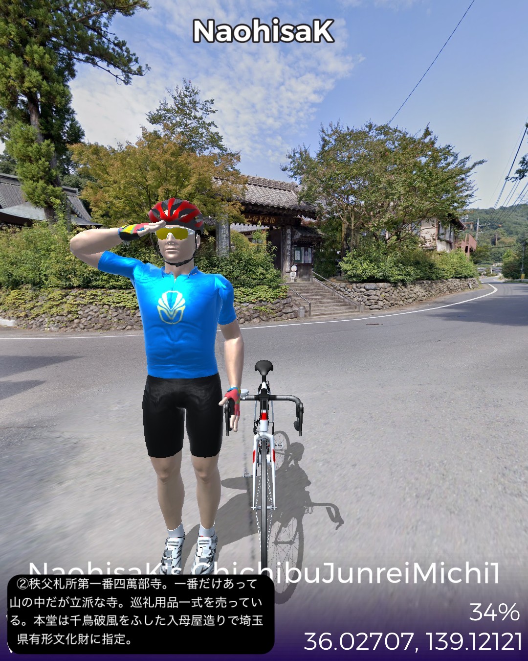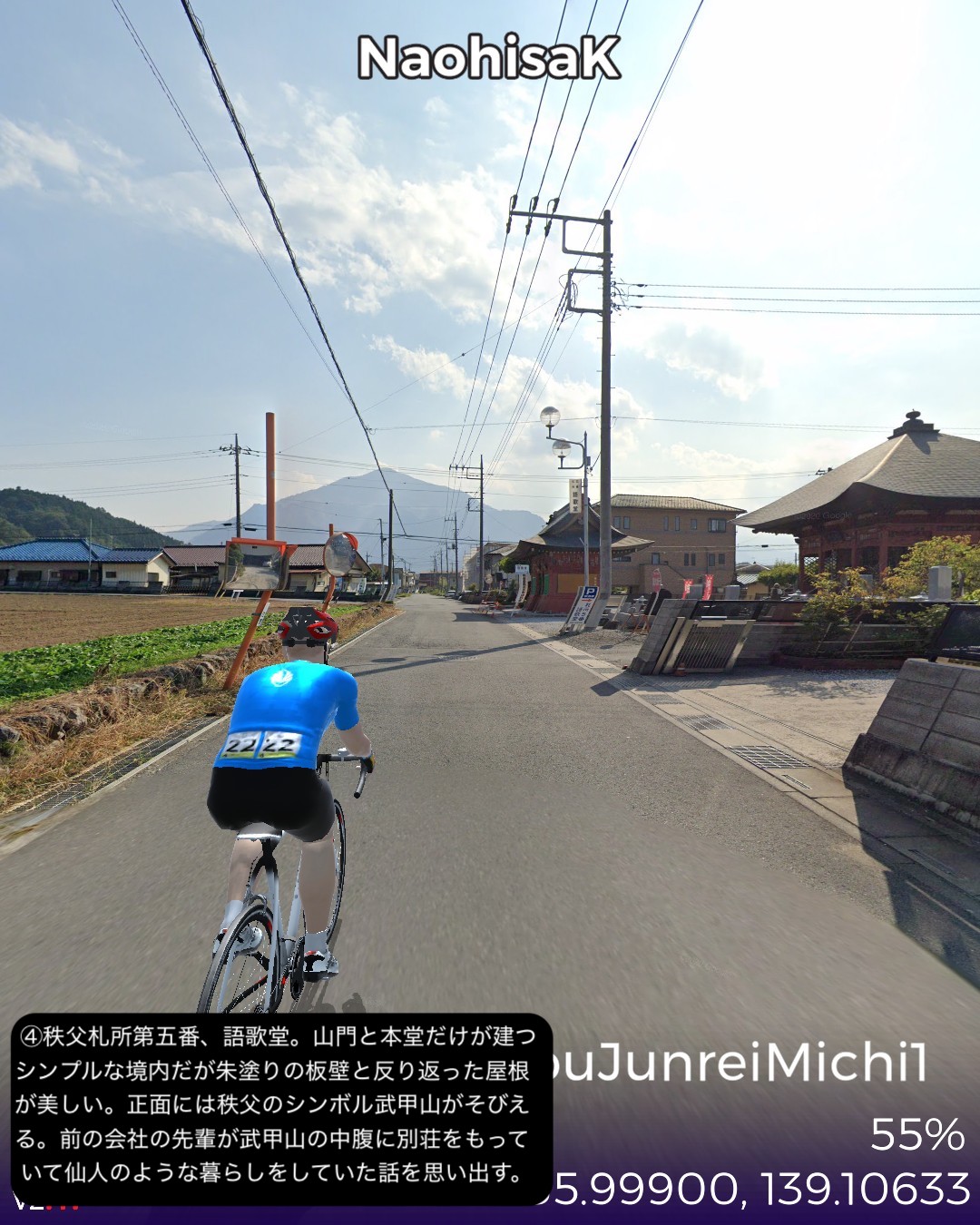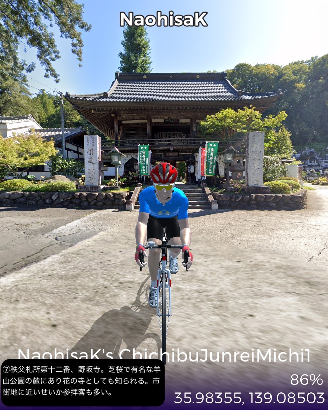 四国のお遍路は88箇所もありかつ次の霊場まで遠くていくつも山を越えるようなケースばかりで正直VRサイクリングでさえ結構苦痛に感じられたが、秩父巡礼は今のところコンパクトにまとまっていてアップダウンも激しくないし、何より心洗われるような山里の風景やレトロな秩父市街の街並みなど適度に変化があって楽しい道中。ここはいずれ是非歩いてみたいと思った。まだまだ巡礼は続く。