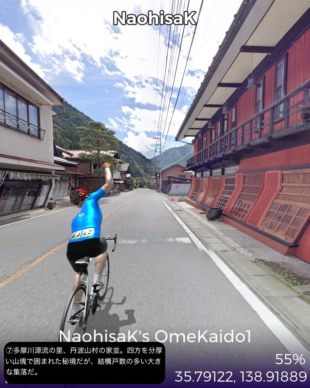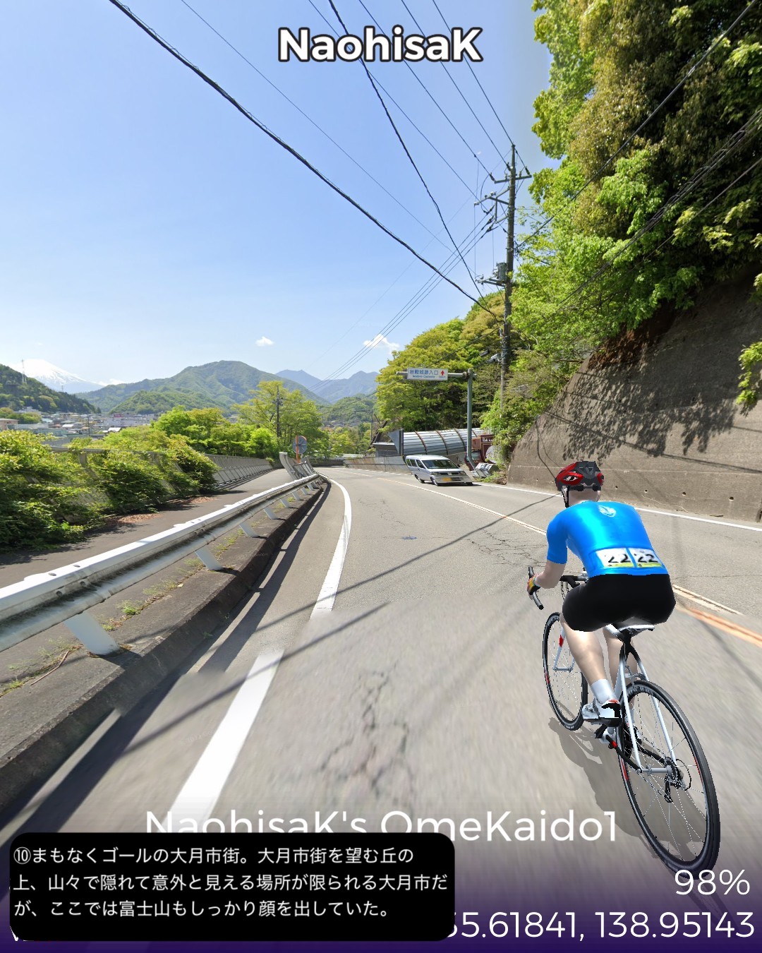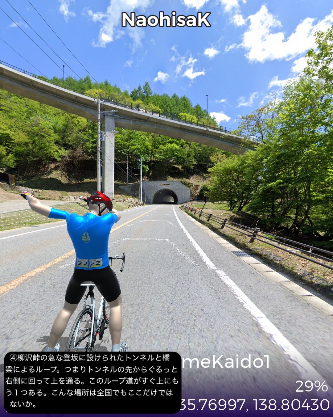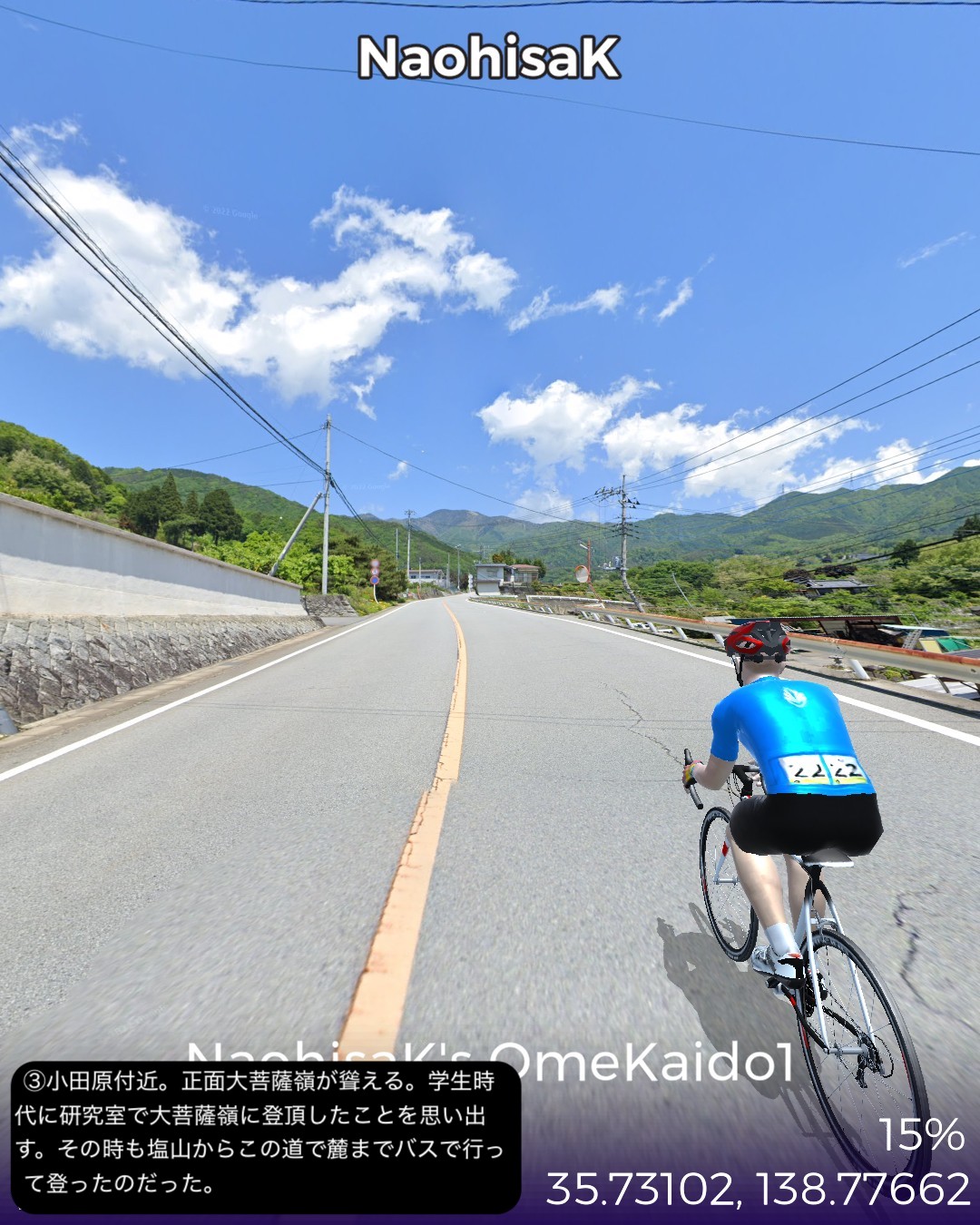 VRサイクリング、青梅街道1日目。山梨から青梅街道で江戸・東京へ戻ると見せかけて途中で進路変更して大月へ抜けるの巻。山梨市は笛吹川に架かる亀甲橋をスタートし青梅街道を江戸・東京方面へ向かう。塩山を通り、大菩薩嶺の麓から急峻な柳沢峠を越えて秘境の村、丹波山村へと下りてゆく。ここでいきなり街道を外れて南下し、一山越えてもう1つの秘境の村小菅村を過ぎ、難所松姫峠をトンネルで抜けて渓流沿いの道を下り続けて大月に至る、今回も超長丁場72kmの行程。そして今回も山また山を登ったり下ったりの体力勝負。VRだから誤魔化せるが一応登り坂は斜度に合わせてフィットネスバイクの負荷を変えてるので結構疲れるのだ。塩山からの道で正面に聳え立つ大菩薩嶺は南斜面で明るく美しい山容を見せていて僕らのような山の素人でも登りたくなる山だ。ハイカーに人気があるのはよくわかる。学生時代研究室の催しで大菩薩嶺に登頂したことを思い出す。その時も塩山からバスで多分同じルートで山麓まで行ってから登り始め、途中山小屋で一泊して山頂に辿り着き、下った先も今回のルート上の小菅村だった気がする。そこからバスで奥多摩へ抜けるルートで帰ったと思う。さて青梅街道は江戸・東京へ向けて走るのをやめたわけではなく戻ってくる予定だが、大月へ出たのは目的があるのだ。それは次回のお楽しみ。