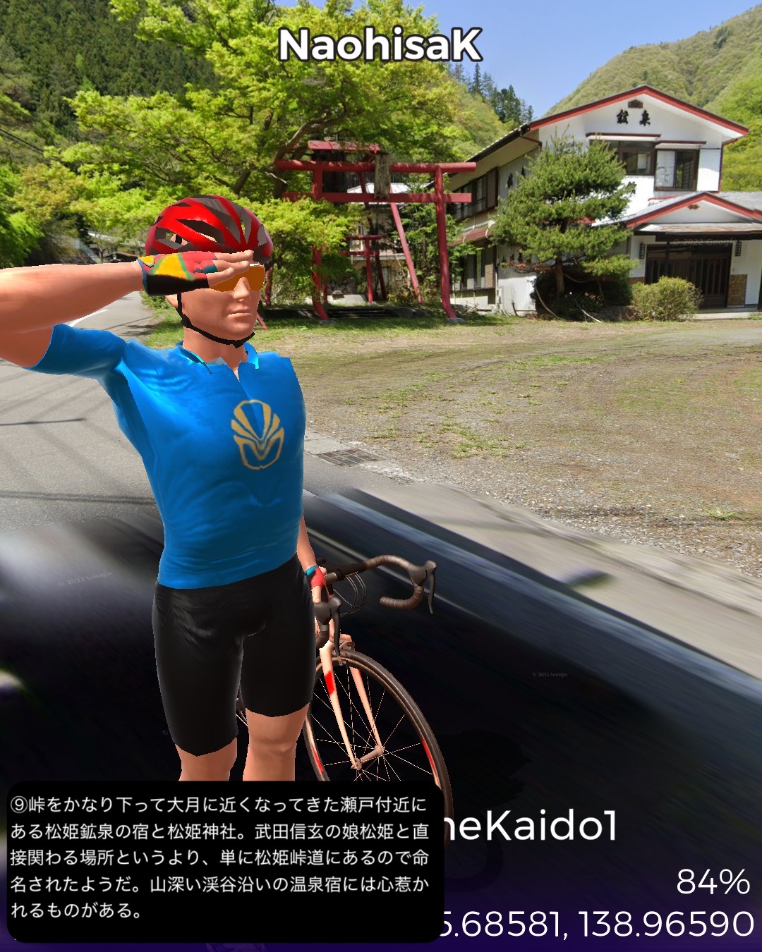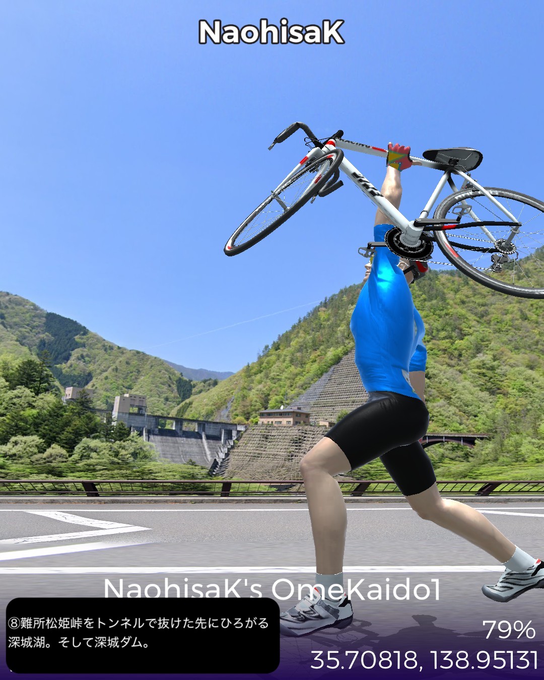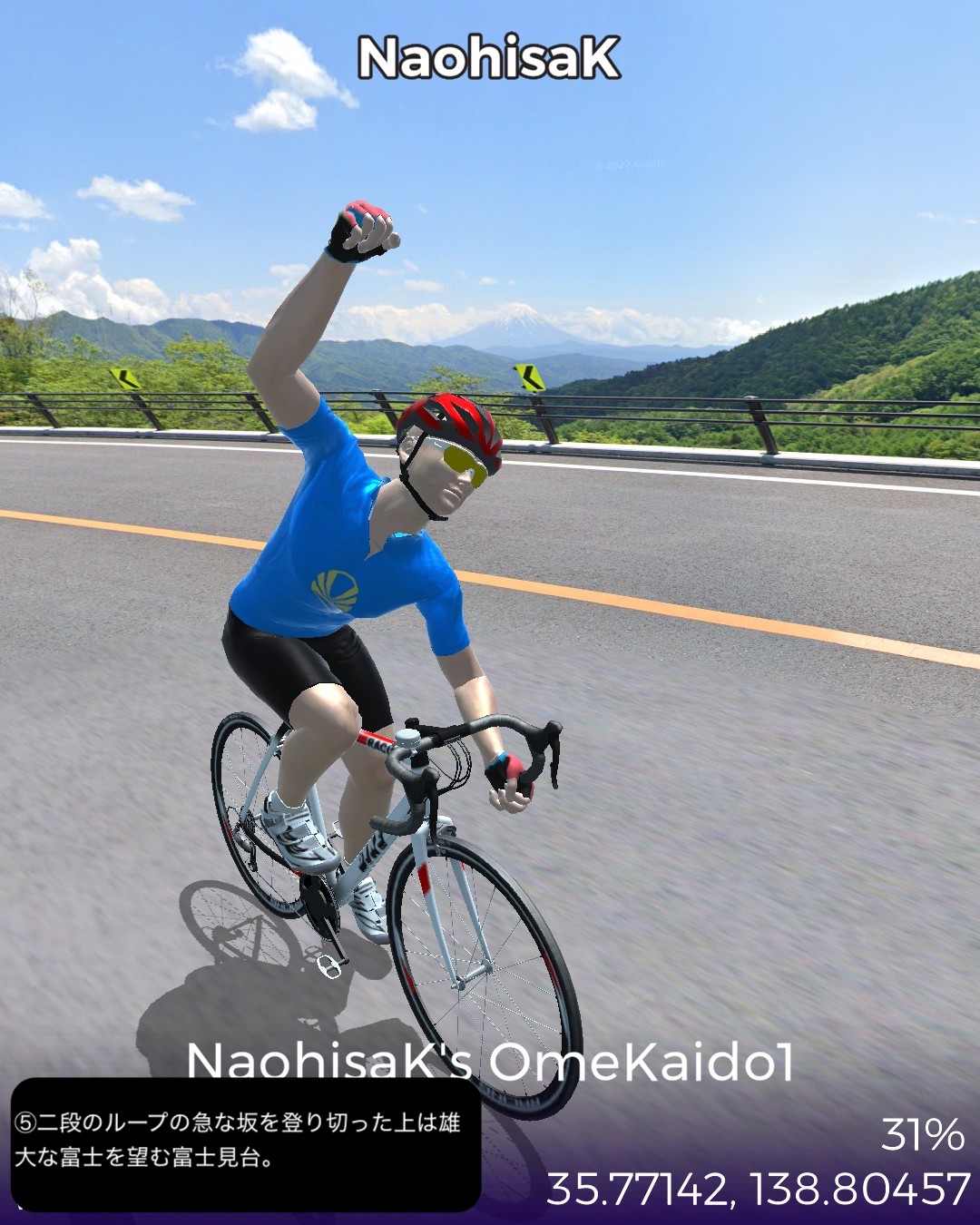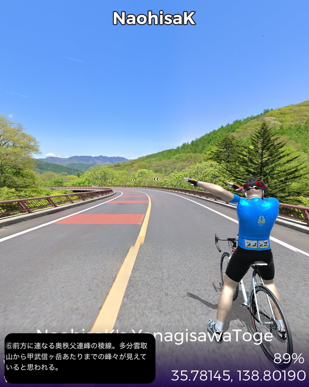 VRサイクリング、青梅街道1日目。山梨から青梅街道で江戸・東京へ戻ると見せかけて途中で進路変更して大月へ抜けるの巻。山梨市は笛吹川に架かる亀甲橋をスタートし青梅街道を江戸・東京方面へ向かう。塩山を通り、大菩薩嶺の麓から急峻な柳沢峠を越えて秘境の村、丹波山村へと下りてゆく。ここでいきなり街道を外れて南下し、一山越えてもう1つの秘境の村小菅村を過ぎ、難所松姫峠をトンネルで抜けて渓流沿いの道を下り続けて大月に至る、今回も超長丁場72kmの行程。そして今回も山また山を登ったり下ったりの体力勝負。VRだから誤魔化せるが一応登り坂は斜度に合わせてフィットネスバイクの負荷を変えてるので結構疲れるのだ。塩山からの道で正面に聳え立つ大菩薩嶺は南斜面で明るく美しい山容を見せていて僕らのような山の素人でも登りたくなる山だ。ハイカーに人気があるのはよくわかる。学生時代研究室の催しで大菩薩嶺に登頂したことを思い出す。その時も塩山からバスで多分同じルートで山麓まで行ってから登り始め、途中山小屋で一泊して山頂に辿り着き、下った先も今回のルート上の小菅村だった気がする。そこからバスで奥多摩へ抜けるルートで帰ったと思う。さて青梅街道は江戸・東京へ向けて走るのをやめたわけではなく戻ってくる予定だが、大月へ出たのは目的があるのだ。それは次回のお楽しみ。