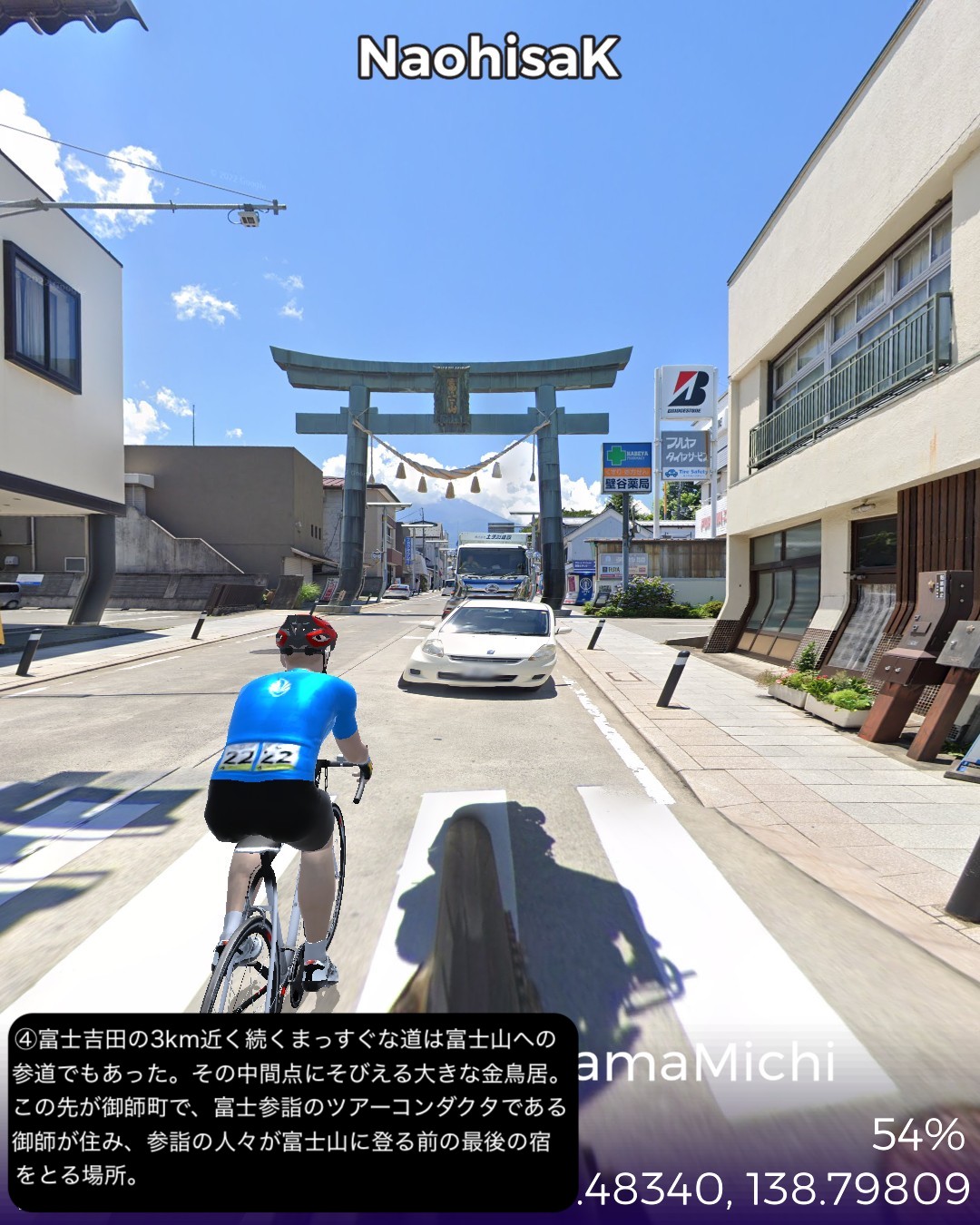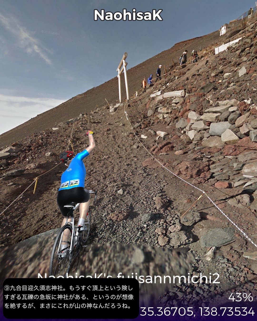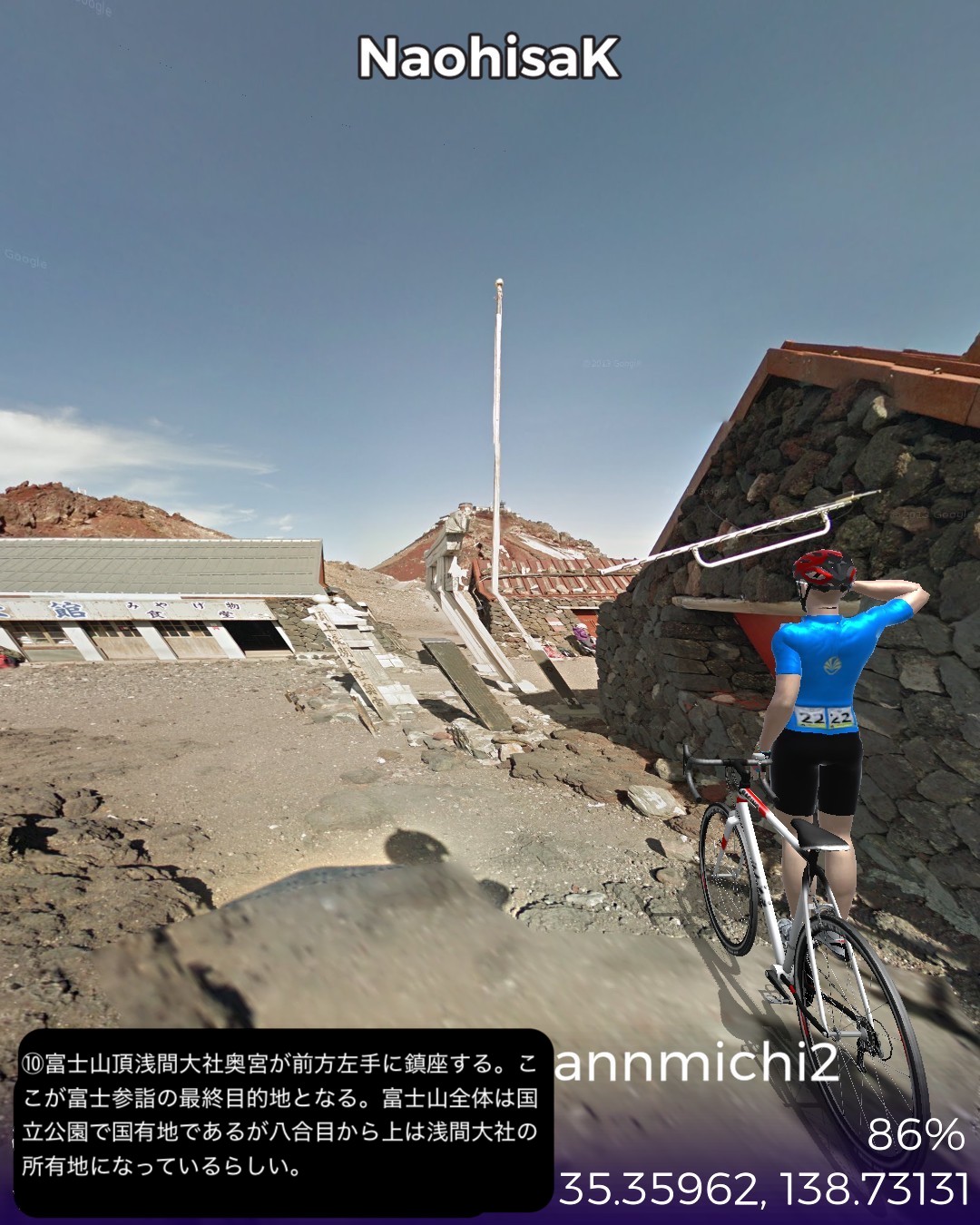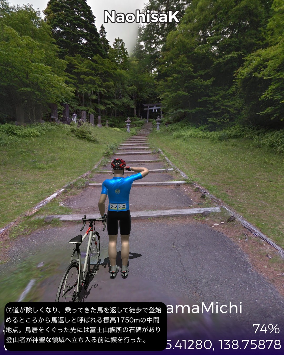 VRサイクリング、参詣と巡礼シリーズの大本命、富士みちで何と富士山頂まで行っちゃいましたの巻。大月駅をスタートし、ほぼ富士急線に沿って、富士参詣に利用された富士みちを進み富士登山前の最終宿泊地として栄えた富士吉田まで進む。北口本宮富士浅間神社の境内を突き抜けて登山道に入り延々と景色が変わらぬ樹海の中を我慢の進軍。五合目からは恐ろしいほどの下界のスペクタクルととんでもない溶岩ゴツゴツの急坂を登って山頂へ到達。さらに火口の周りをぐるっと巡って奥宮参拝して富士山測候所のある日本最高峰の剣ヶ峰まで行ってしまう45kmの行程。VRとはいえ自転車による富士山の初登頂者かもしれない(笑)ストリートビューが登山道をフルにカバーしていたので行けてしまったのだ。富士山信仰は古代から脈々と受け継がれてきたが、江戸時代には各地に富士講という組織ができて大いに流行った。庶民は地元の富士講に参加し、毎年旅費を積み立てて毎年選抜されたメンバー一団となって富士参詣へ向かうわけである。その各地の富士講と繋がって富士参詣を導くのが富士山麓に拠点を持つ御師と呼ばれるいわばツアーコンダクタの一群である。最大のマーケット、江戸からの参詣経路として一般的であったのは甲州街道で大月まで進みそこから今回の富士みちを通って富士吉田の御師の提供する宿に宿泊してそこから御師に導かれて富士山へ登頂するルートであったので、富士吉田には御師町という地名があるほど御師ビジネスで栄えたらしい。今回は登山道も含めまさに富士参詣の道をフルに体験することとなった。30年ほど前に須走ルートで登頂した経験があるが、今回の吉田ルートは富士参詣のメインルートだけあって登山道のあちこちに富士山信仰の名残りが点在していたのが印象的であった。