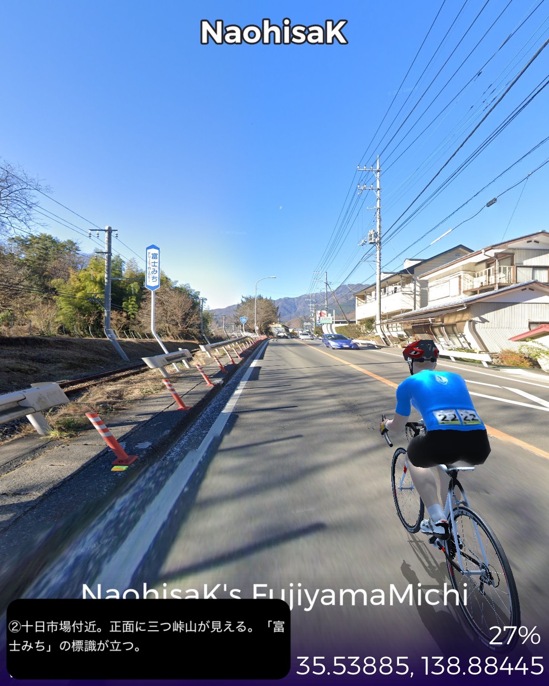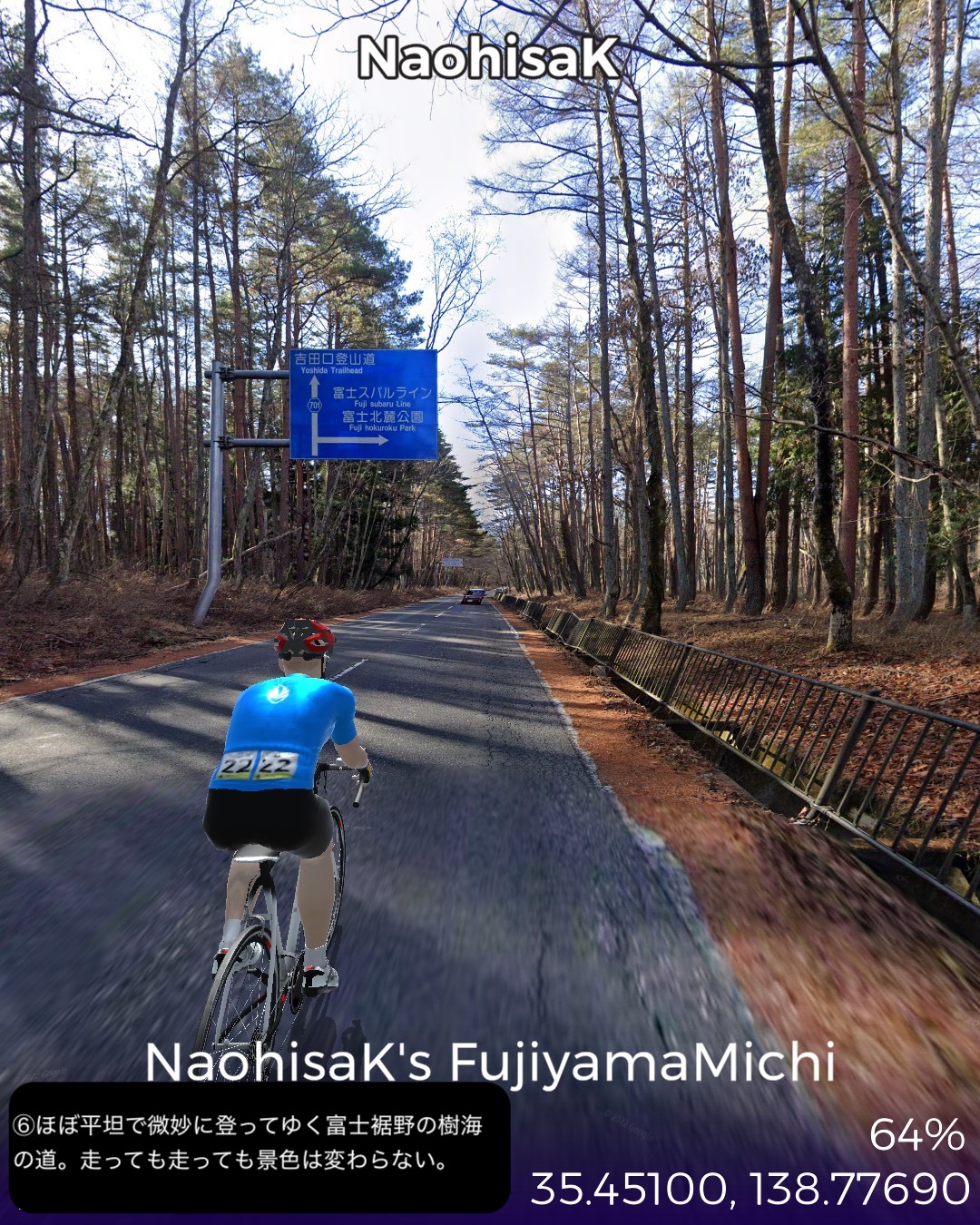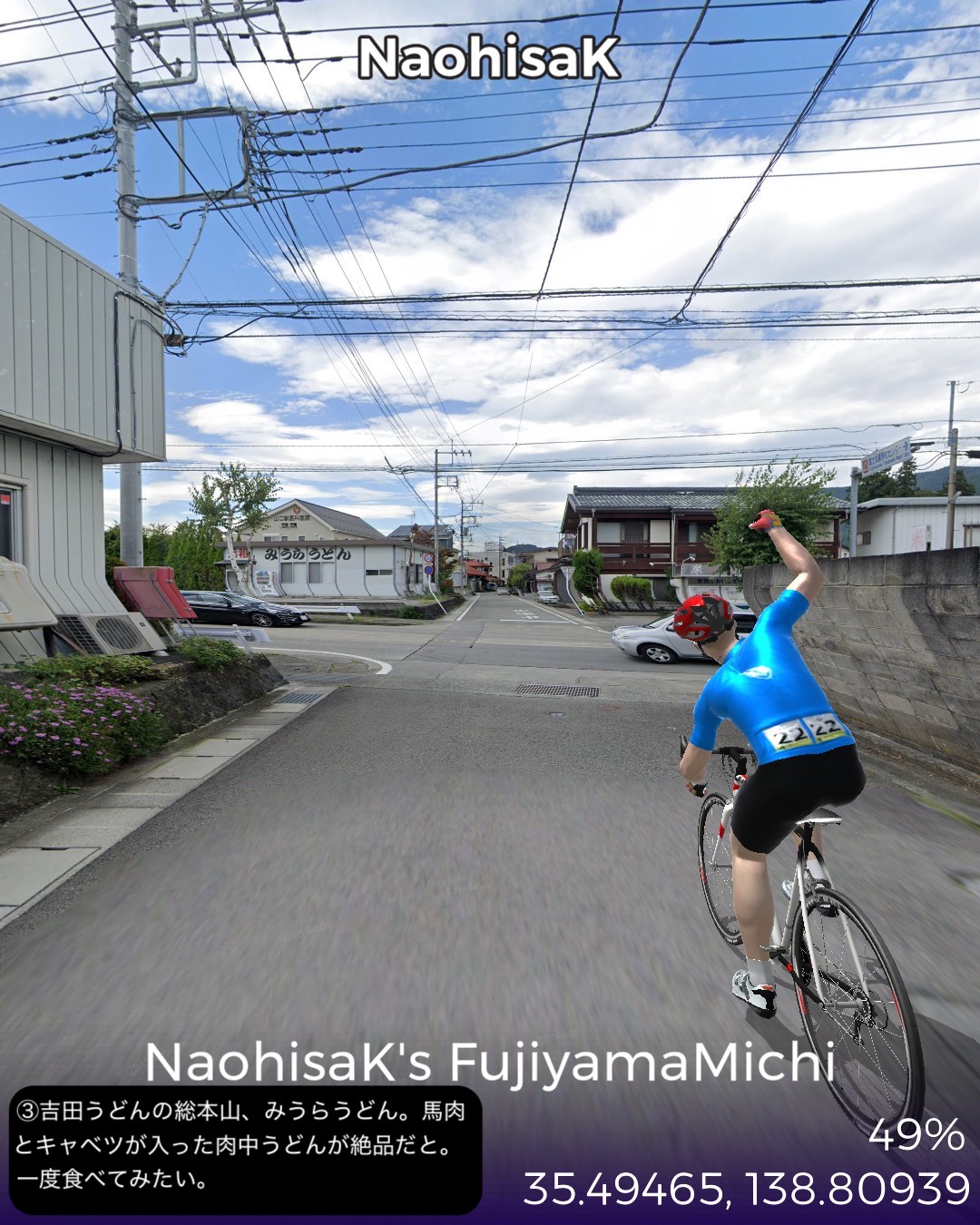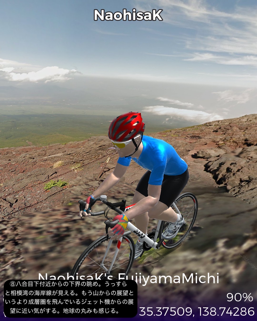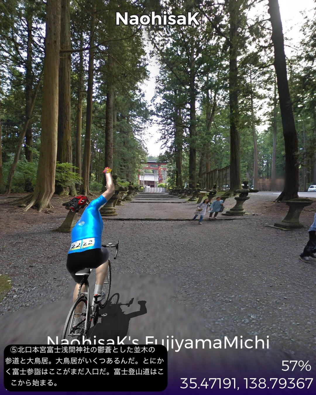 VRサイクリング、参詣と巡礼シリーズの大本命、富士みちで何と富士山頂まで行っちゃいましたの巻。大月駅をスタートし、ほぼ富士急線に沿って、富士参詣に利用された富士みちを進み富士登山前の最終宿泊地として栄えた富士吉田まで進む。北口本宮富士浅間神社の境内を突き抜けて登山道に入り延々と景色が変わらぬ樹海の中を我慢の進軍。五合目からは恐ろしいほどの下界のスペクタクルととんでもない溶岩ゴツゴツの急坂を登って山頂へ到達。さらに火口の周りをぐるっと巡って奥宮参拝して富士山測候所のある日本最高峰の剣ヶ峰まで行ってしまう45kmの行程。VRとはいえ自転車による富士山の初登頂者かもしれない(笑)ストリートビューが登山道をフルにカバーしていたので行けてしまったのだ。富士山信仰は古代から脈々と受け継がれてきたが、江戸時代には各地に富士講という組織ができて大いに流行った。庶民は地元の富士講に参加し、毎年旅費を積み立てて毎年選抜されたメンバー一団となって富士参詣へ向かうわけである。その各地の富士講と繋がって富士参詣を導くのが富士山麓に拠点を持つ御師と呼ばれるいわばツアーコンダクタの一群である。最大のマーケット、江戸からの参詣経路として一般的であったのは甲州街道で大月まで進みそこから今回の富士みちを通って富士吉田の御師の提供する宿に宿泊してそこから御師に導かれて富士山へ登頂するルートであったので、富士吉田には御師町という地名があるほど御師ビジネスで栄えたらしい。今回は登山道も含めまさに富士参詣の道をフルに体験することとなった。30年ほど前に須走ルートで登頂した経験があるが、今回の吉田ルートは富士参詣のメインルートだけあって登山道のあちこちに富士山信仰の名残りが点在していたのが印象的であった。