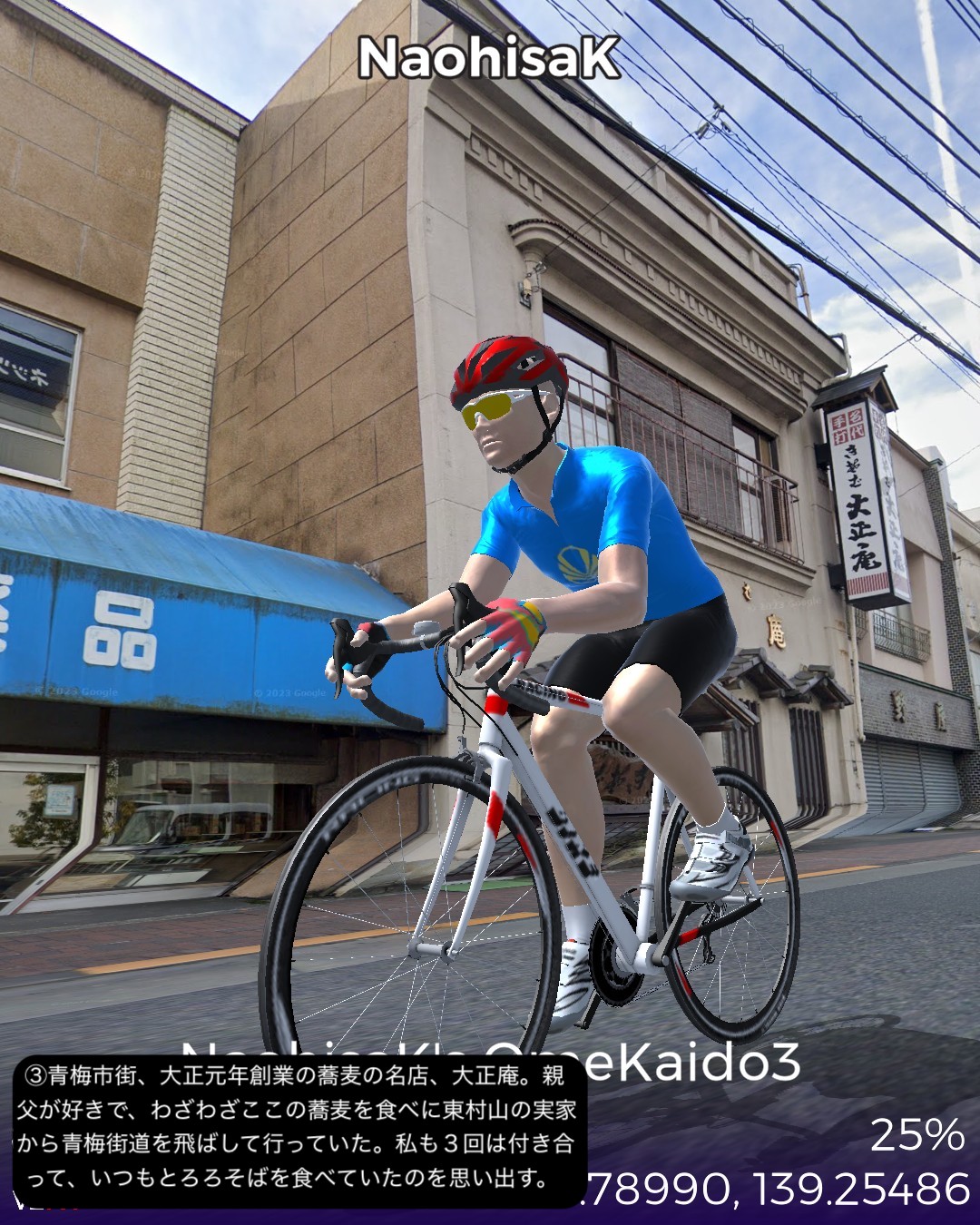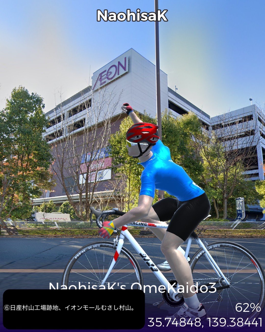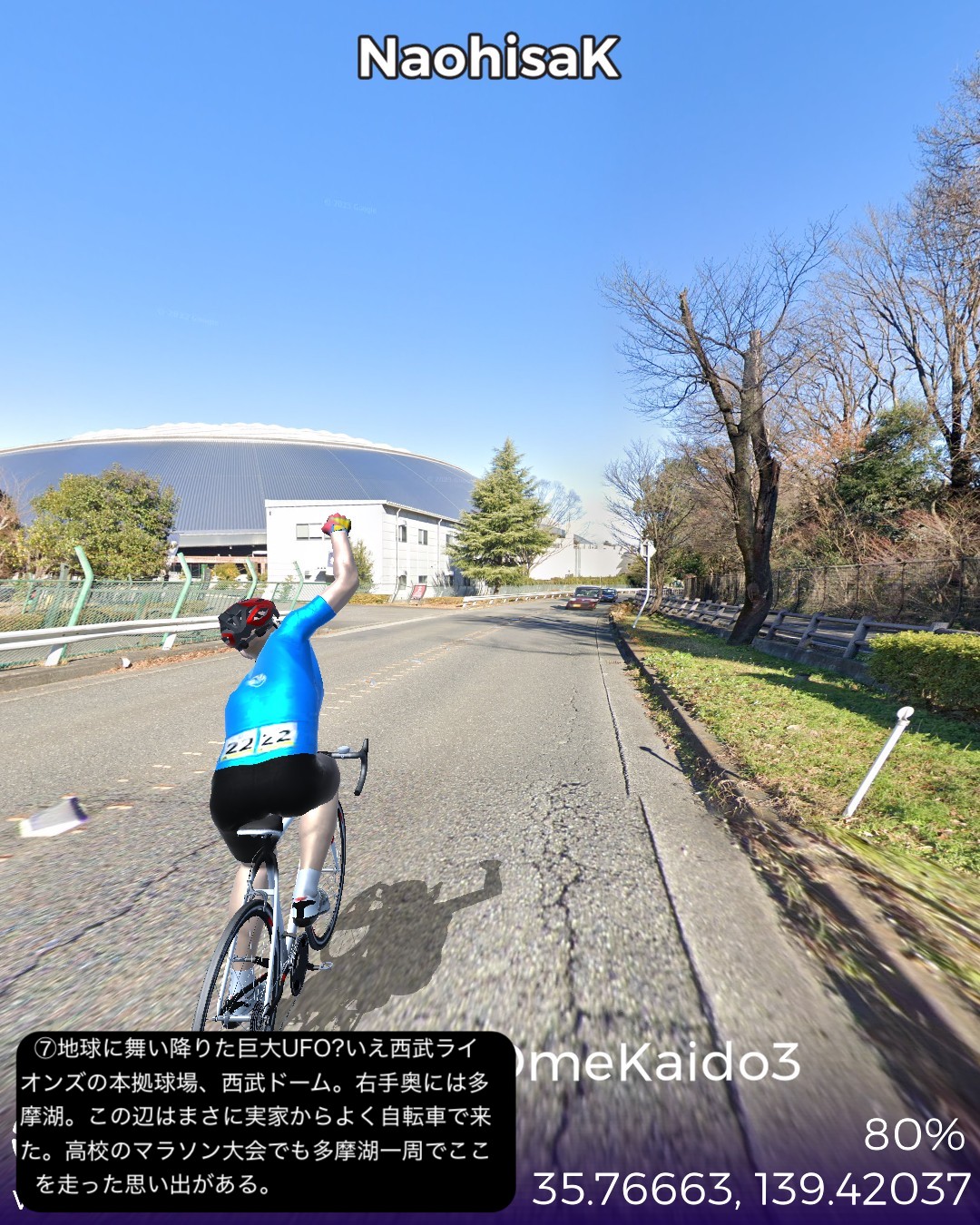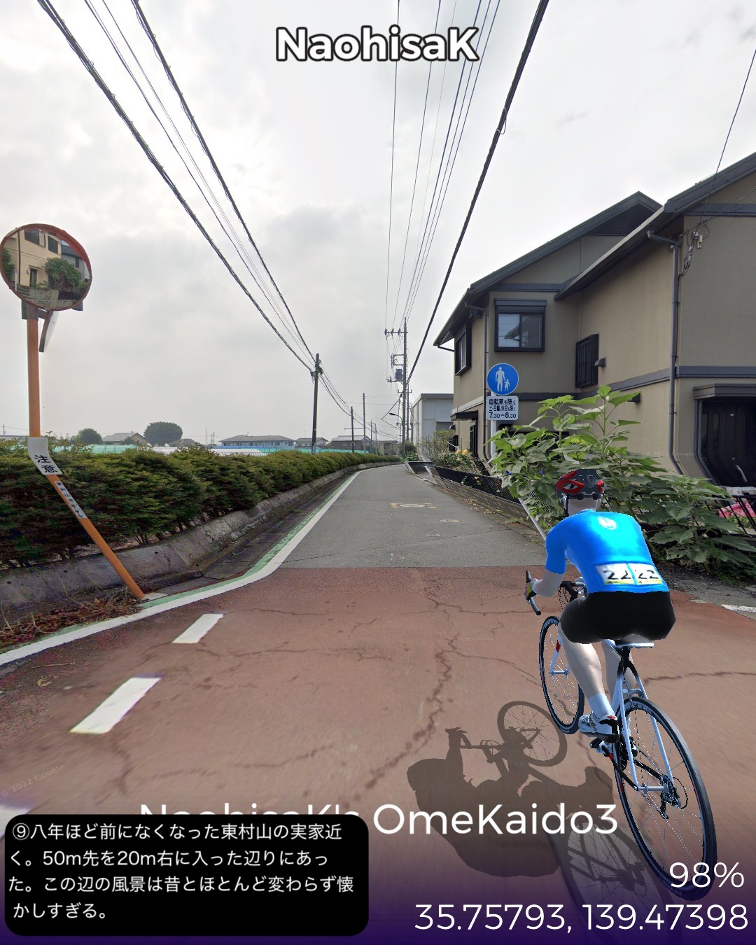 VRサイクリング、青梅街道3日目。ようやく山地を抜けて東京都下郊外の住宅地に入ってゆく。武蔵御嶽神社のある御嶽を出発し、しばらくはJR青梅線に沿って山間の谷を進むと急に開けて関東平野に出ると青梅宿。そこからは住宅と郊外店舗の中を都心に向かって進んでゆく。箱根ヶ崎宿のあった瑞穂市、日産の工場がイオンモールに置き換わった武蔵村山市を過ぎて多摩モノレール駅のある桜街道まで来たところで、街道を外れて寄り道モードで追憶の旅。多摩湖を回り東村山の実家のあった付近を通り母校の大岱小学校をゴールとする39kmの行程。青梅は実家から何度か青梅街道一走りで訪れたことがあったが、山懐に抱かれたレトロな家並みがキュンとくる魅力的な町だと再認識した。西武ドームや昭和レトロでブレーク中の西武園がある多摩湖から東村山にかけては私の少年時代の庭と言ってもいい馴染み深い土地だ。その自転車で走り回ったルートを辿って東村山の実家があったあたりへ近くにつれ、変わらぬ景色の懐かしさと変貌ぶりへの困惑が入り混じる複雑な気分。次回は再度東京都心を潜り抜けて新たな旅への出発点へ進む。