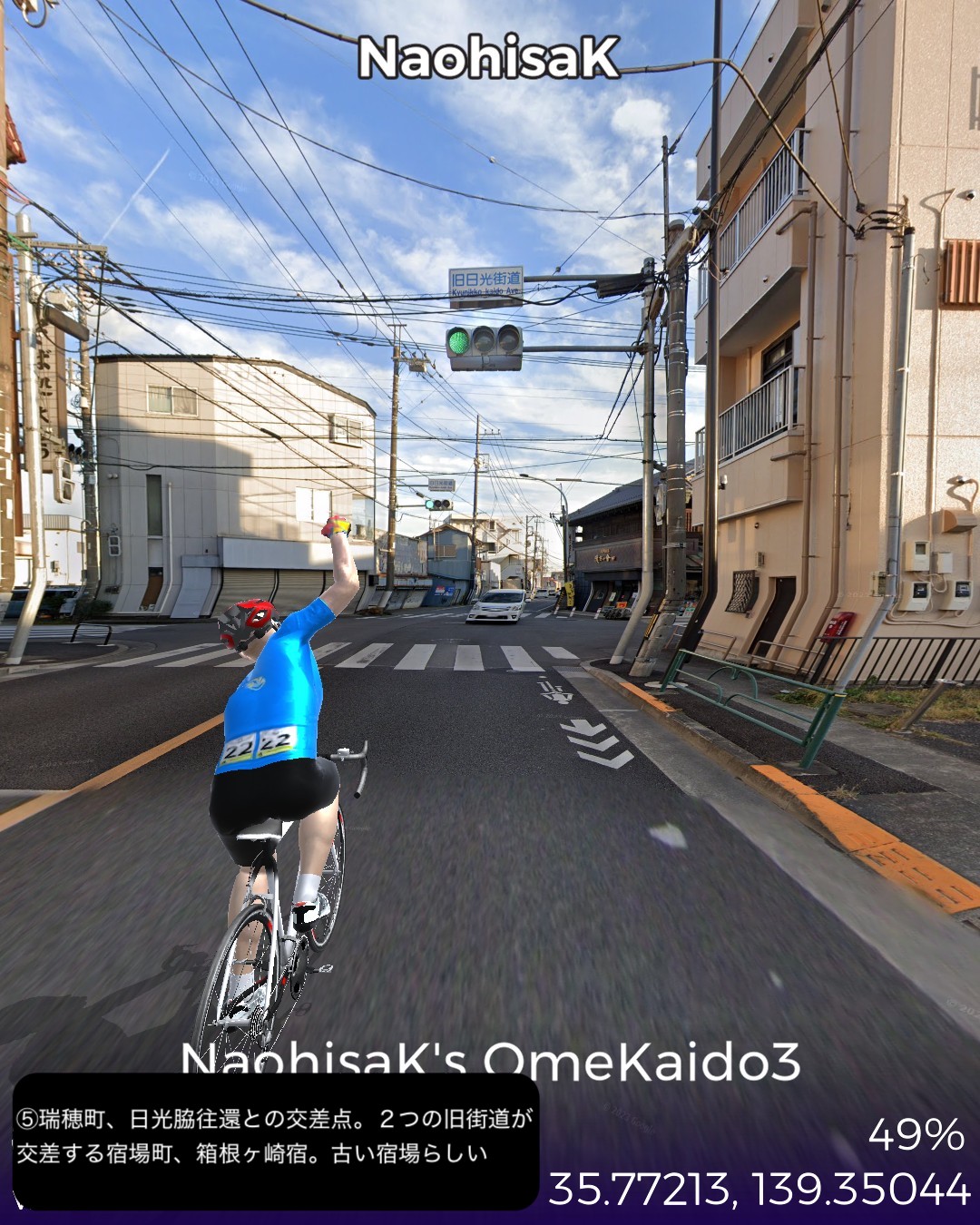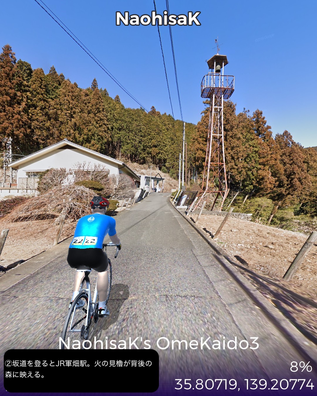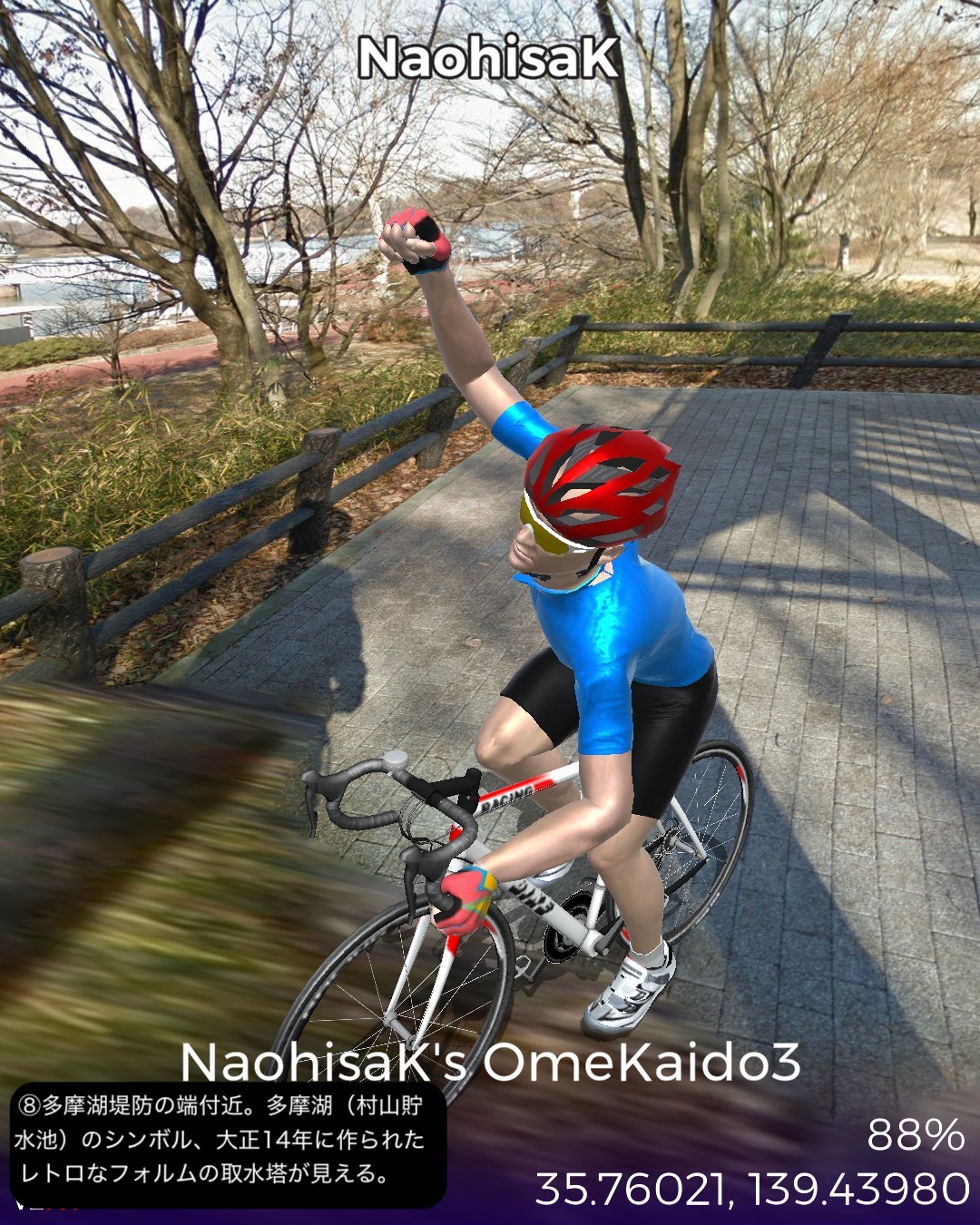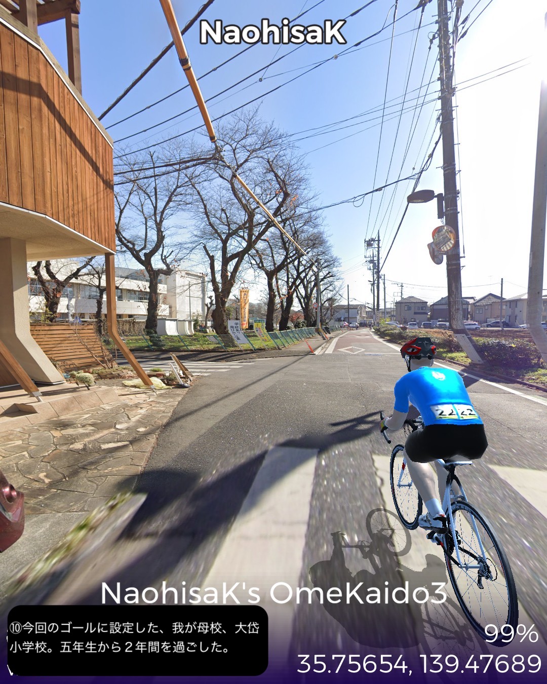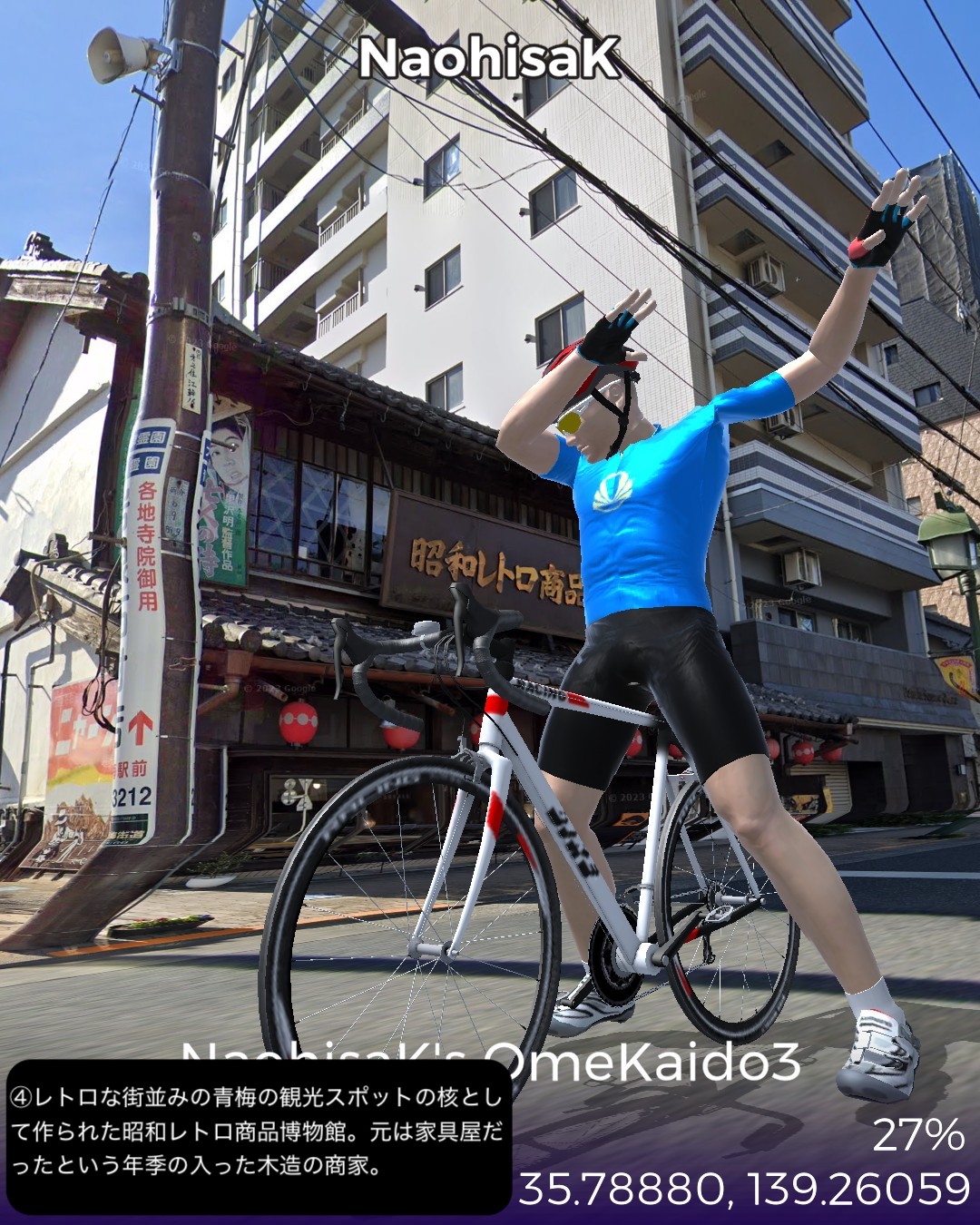 VRサイクリング、青梅街道3日目。ようやく山地を抜けて東京都下郊外の住宅地に入ってゆく。武蔵御嶽神社のある御嶽を出発し、しばらくはJR青梅線に沿って山間の谷を進むと急に開けて関東平野に出ると青梅宿。そこからは住宅と郊外店舗の中を都心に向かって進んでゆく。箱根ヶ崎宿のあった瑞穂市、日産の工場がイオンモールに置き換わった武蔵村山市を過ぎて多摩モノレール駅のある桜街道まで来たところで、街道を外れて寄り道モードで追憶の旅。多摩湖を回り東村山の実家のあった付近を通り母校の大岱小学校をゴールとする39kmの行程。青梅は実家から何度か青梅街道一走りで訪れたことがあったが、山懐に抱かれたレトロな家並みがキュンとくる魅力的な町だと再認識した。西武ドームや昭和レトロでブレーク中の西武園がある多摩湖から東村山にかけては私の少年時代の庭と言ってもいい馴染み深い土地だ。その自転車で走り回ったルートを辿って東村山の実家があったあたりへ近くにつれ、変わらぬ景色の懐かしさと変貌ぶりへの困惑が入り混じる複雑な気分。次回は再度東京都心を潜り抜けて新たな旅への出発点へ進む。