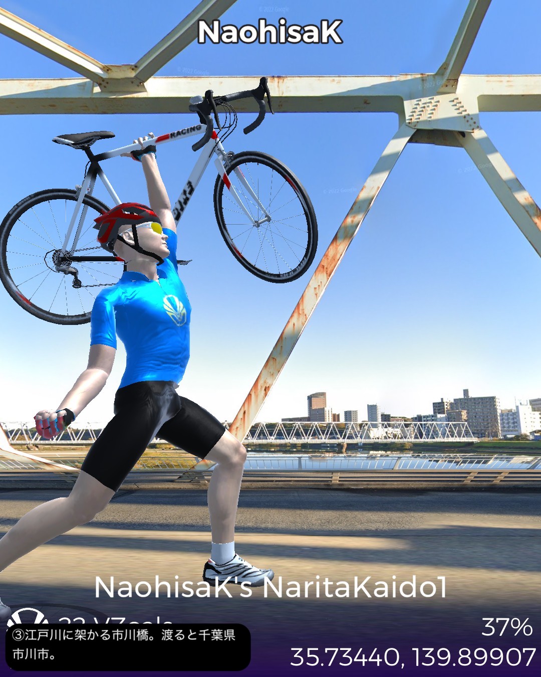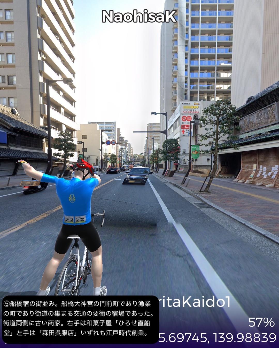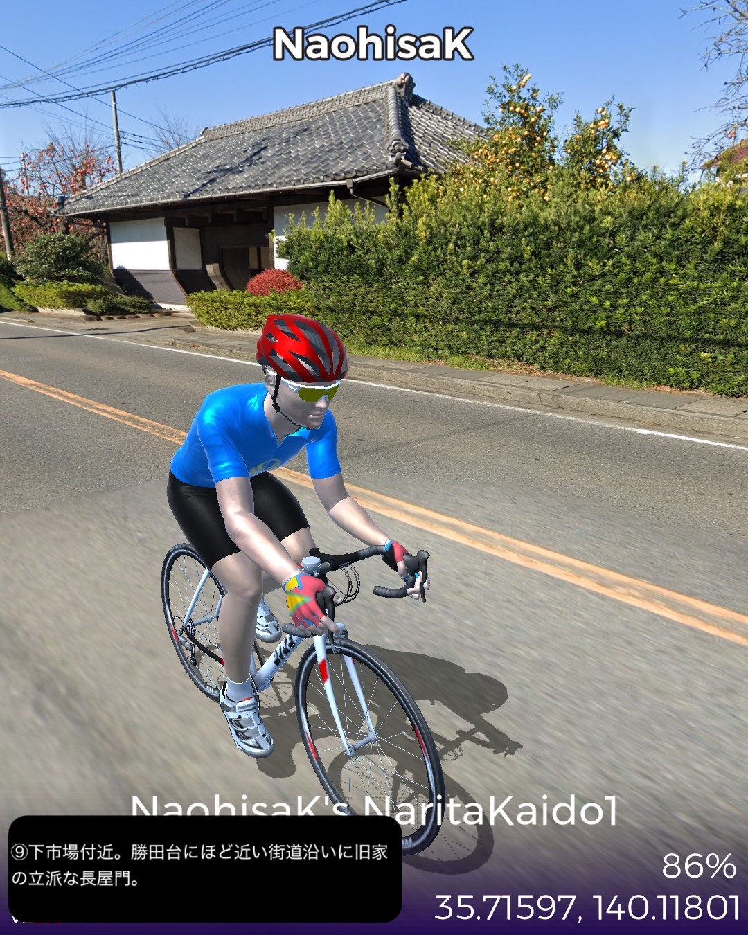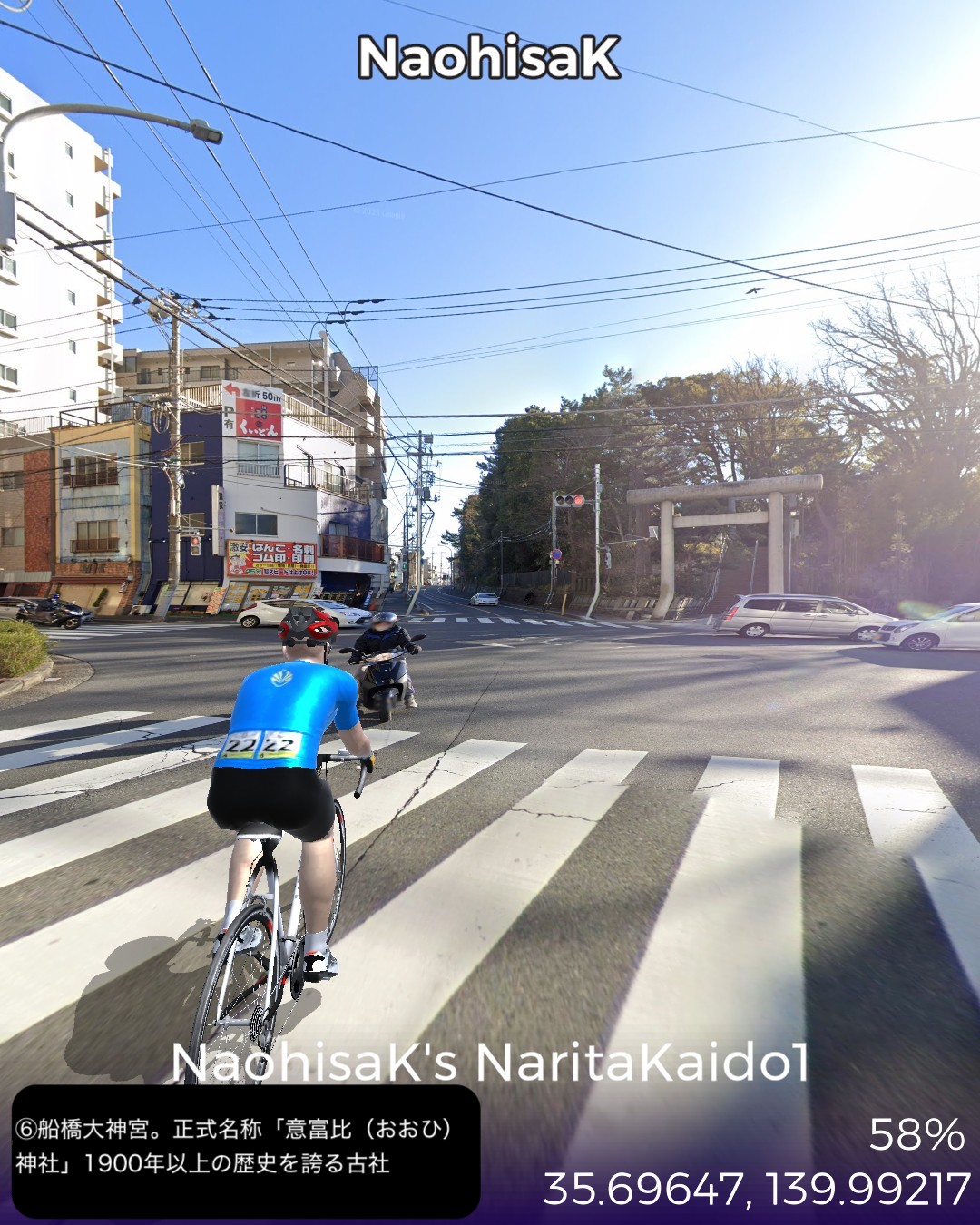 VRサイクリング しばらく千葉方面を攻める。今回は参詣と巡礼の道シリーズの続きで成田詣の参詣道であった成田街道の1日目。亀戸駅前を出発し、日光街道の宿場であった葛飾区新宿(にいじゅく)から成田街道を走る。江戸川を渡って千葉県下総国に入り関所があった市川宿、葛飾八幡宮のある八幡宿、船橋大神宮のある船橋宿を通り現代の習志野市、八千代市を抜けて佐倉市の臼井宿まで46kmの行程。成田山新勝寺に参拝する成田詣では江戸時代に大流行した。人気歌舞伎役者の初代市川團十郎が成田山の不動明王をテーマにした歌舞伎の演目が大当たりしたことがきっかけになったらしい。これにより市川家は成田屋の屋号を使うようになった。それで現在の十三代目市川團十郎も成田山新勝寺で節分の豆まきをやったりするわけだ。ともかく江戸庶民はこの成田街道を辿って成田詣でをしてきた。次回は早くも成田山に到着する。
