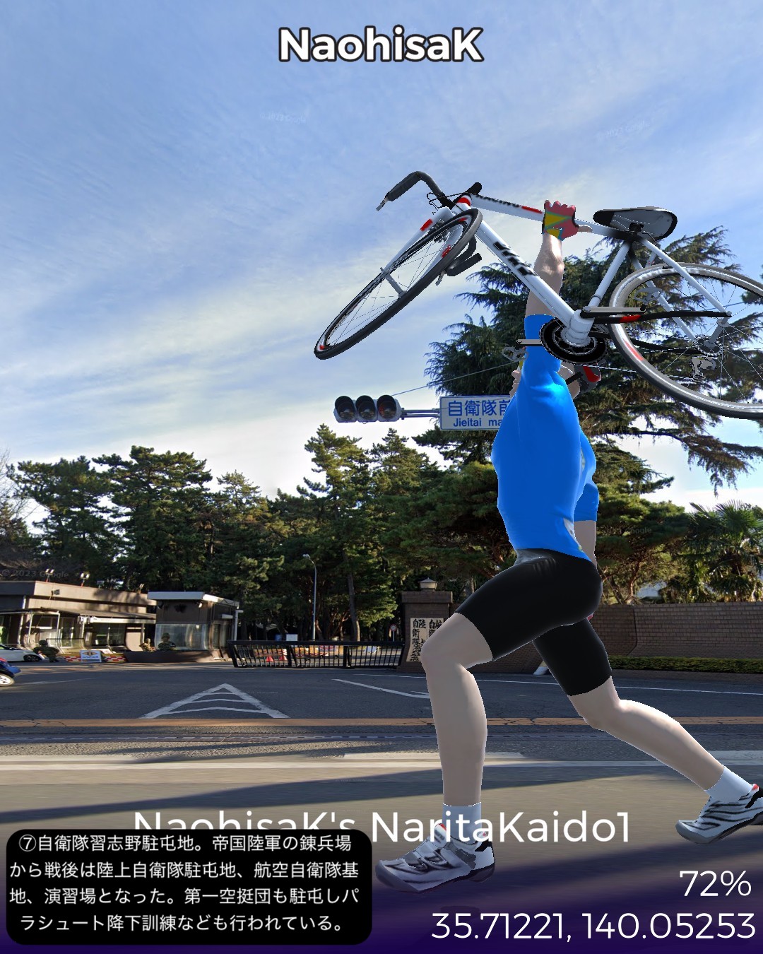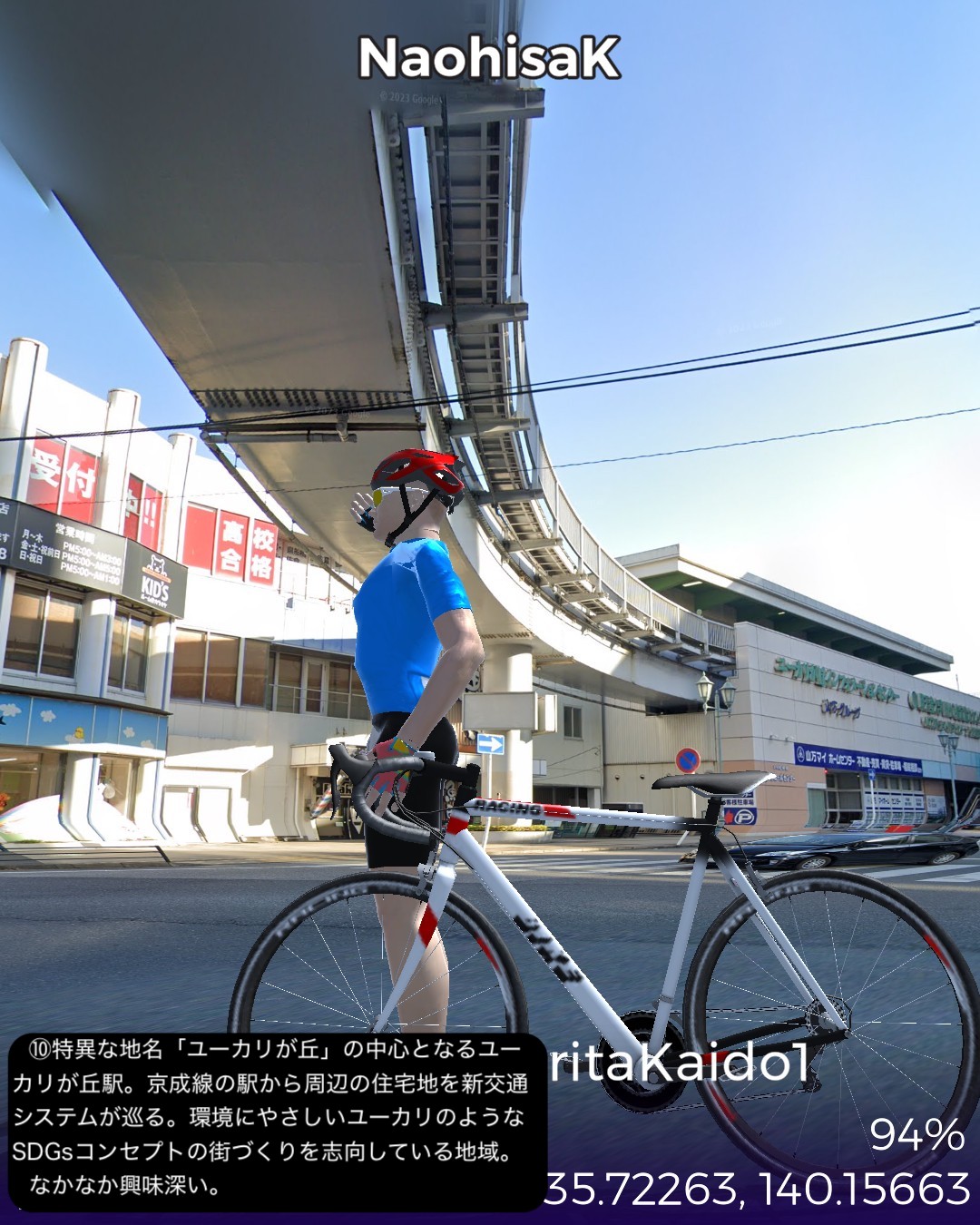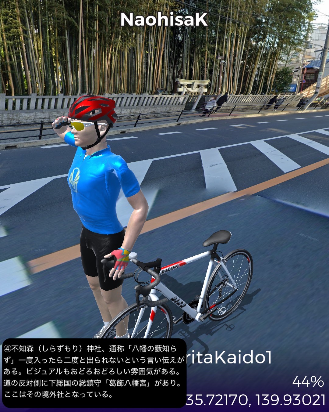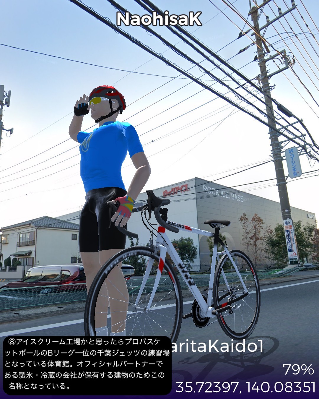 VRサイクリング しばらく千葉方面を攻める。今回は参詣と巡礼の道シリーズの続きで成田詣の参詣道であった成田街道の1日目。亀戸駅前を出発し、日光街道の宿場であった葛飾区新宿(にいじゅく)から成田街道を走る。江戸川を渡って千葉県下総国に入り関所があった市川宿、葛飾八幡宮のある八幡宿、船橋大神宮のある船橋宿を通り現代の習志野市、八千代市を抜けて佐倉市の臼井宿まで46kmの行程。成田山新勝寺に参拝する成田詣では江戸時代に大流行した。人気歌舞伎役者の初代市川團十郎が成田山の不動明王をテーマにした歌舞伎の演目が大当たりしたことがきっかけになったらしい。これにより市川家は成田屋の屋号を使うようになった。それで現在の十三代目市川團十郎も成田山新勝寺で節分の豆まきをやったりするわけだ。ともかく江戸庶民はこの成田街道を辿って成田詣でをしてきた。次回は早くも成田山に到着する。