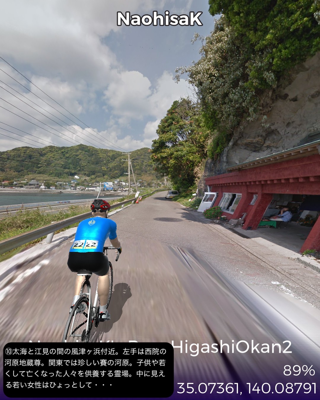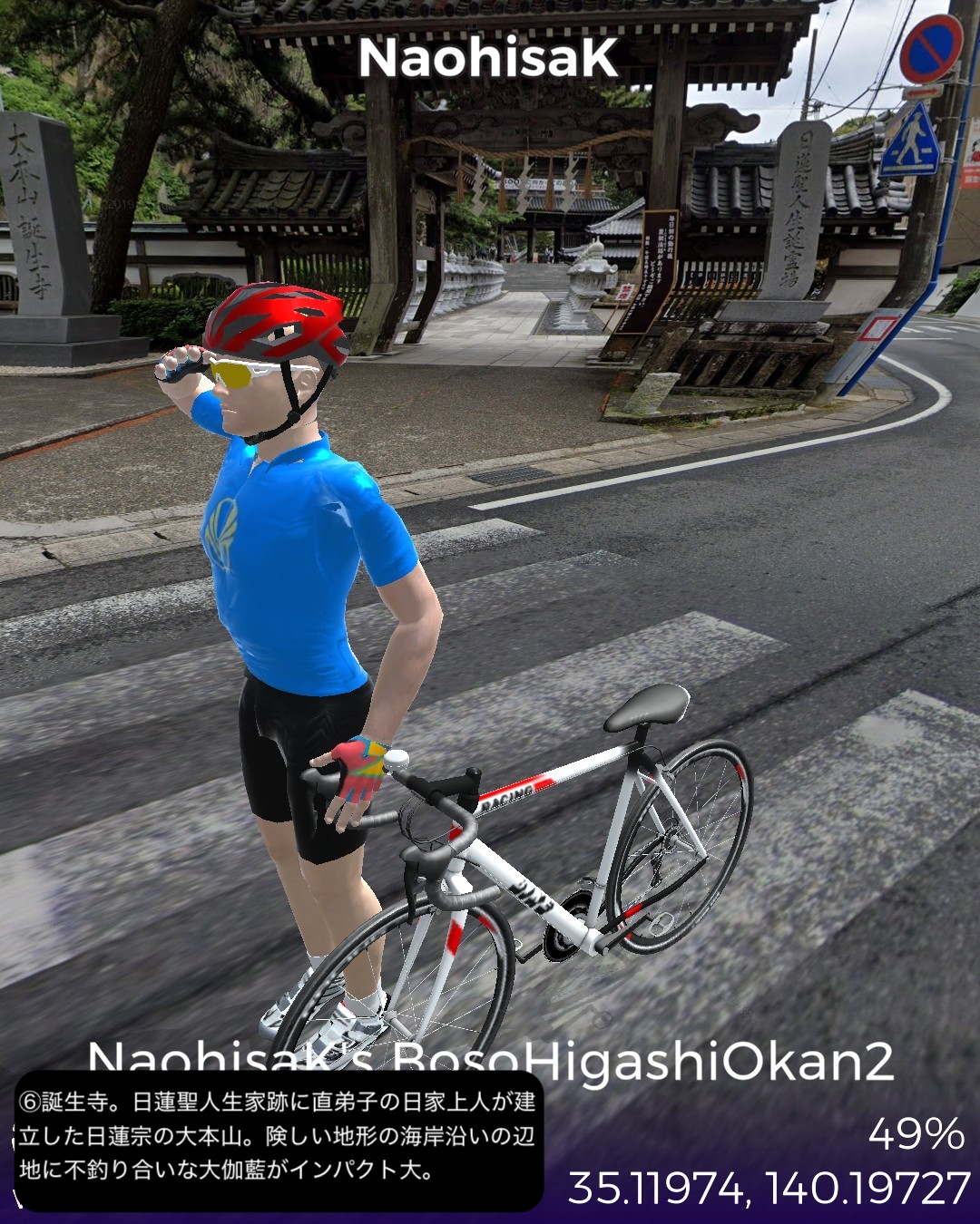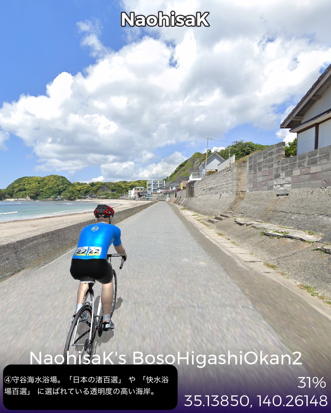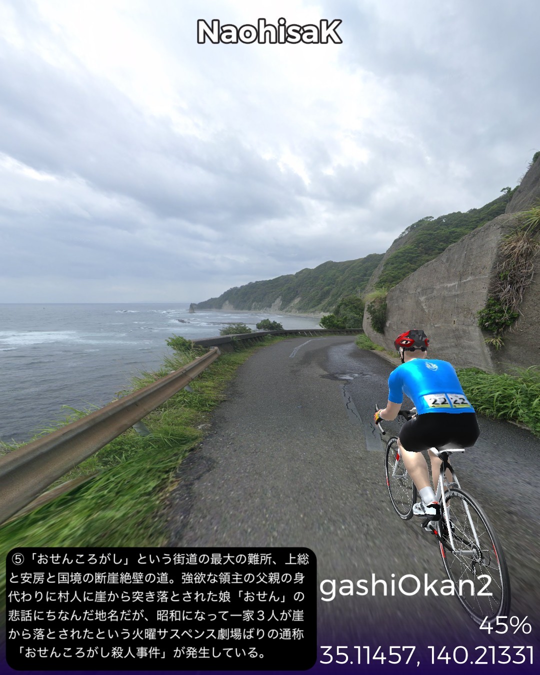 VRサイクリング 房総東往還2日目。いよいよ外房のゴールデンルート。御宿を出発し、今回はずっと海岸沿いの絶景街道を進む。朝市と坦々麺の町勝浦、日蓮宗の聖地と真鯛の町小湊、房総一の観光スポット鴨川シーワールドを有する鴨川を経て、花畑の町江見をゴールとする43kmの行程。国道から離れてほぼ海岸線に沿った旧道を走ったので絶景の海岸美と海岸沿いの漁港や鄙びた集落を愛でた今までのルートでもベスト10に入りそうな神回であった。首都圏に近いので海水浴場などの行楽地、リゾート地のイメージで縛られているが、紀州や九州、四国に負けない海岸美は再認識されるべきであろう。特に「おせんころがし」というおどろおどろしい地名のついた上総と安房の国境地帯の断崖絶壁の道は悲話の伝説とミステリアスな現代の殺人事件も背景にインパクト大であった。次回は早くも館山から内房へと進む。