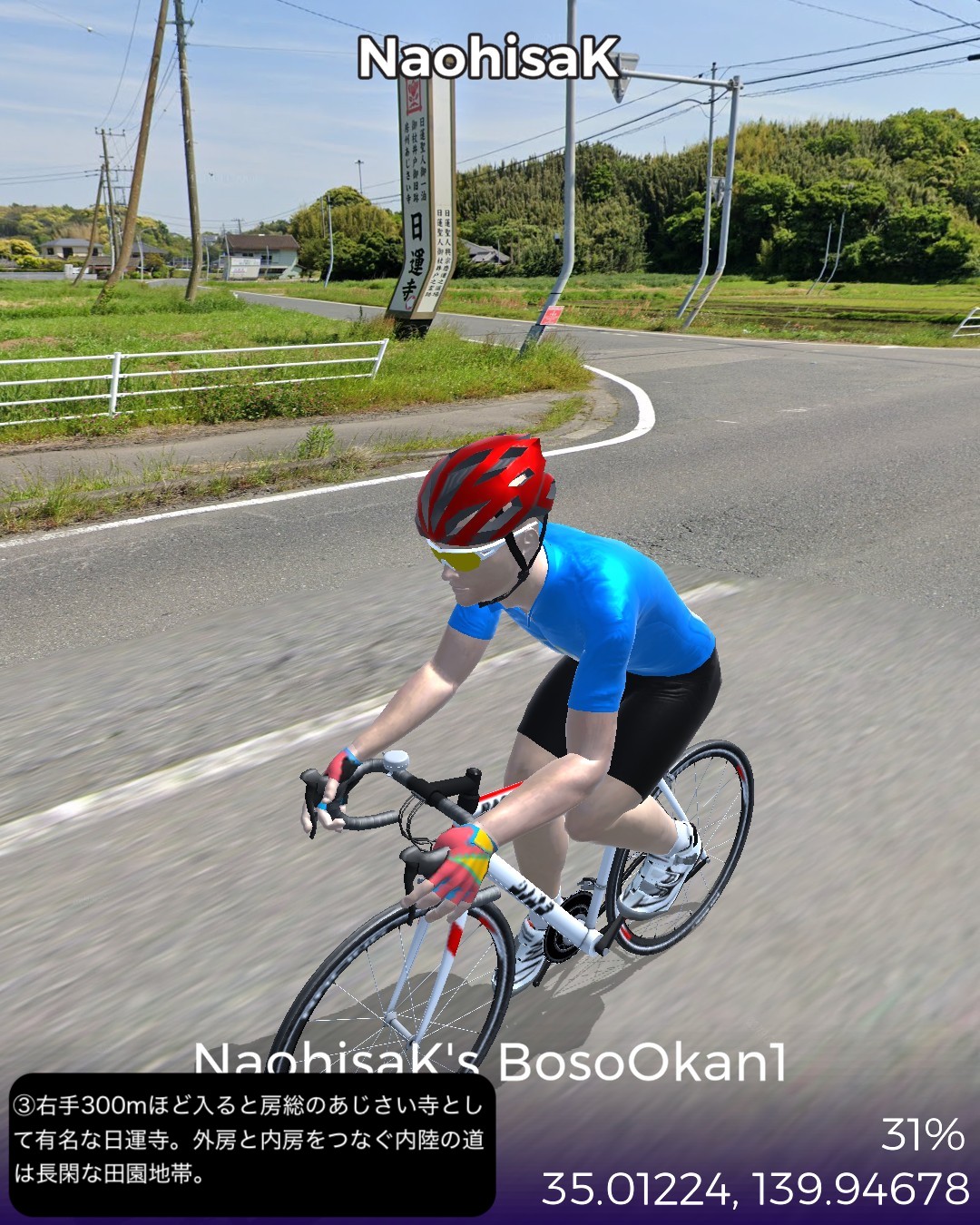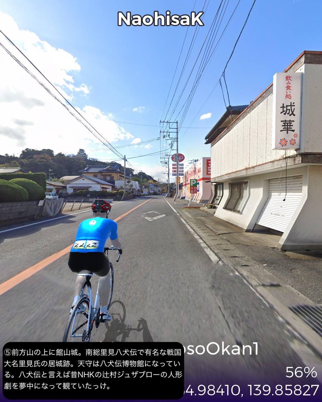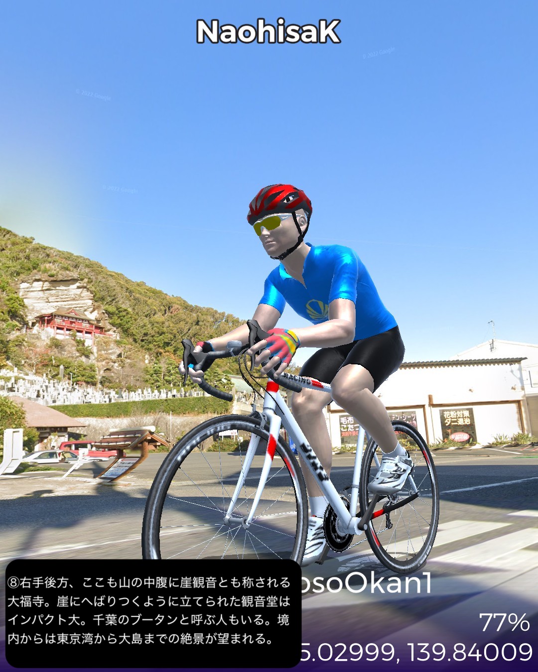 VRサイクリング 房総東往還3日目の後房総往還1日目。外房から内房へぐるっと回るの巻。外房の漁村江見を出発し、外房の海岸沿いに和田町白渚海岸まで到達したところで街道は海岸から離れ半島の内陸を突っ切って南房総最大の町、房総東往還の終点館山にたどり着く。ここで館山市街をぐるっと巡った後、房総往還に入り今度は内房の海岸伝いに北上を開始し、船形、富浦を経て岩井まで41kmの行程。外房は前回の区間が最も海岸線が入り組んでいて、江見から先は比較的長いビーチが続く穏やかな海岸を進む。外房から内房へ半島を横断する道は特に山道もなく田園地帯が続く平坦な道。館山には南総里見八犬伝で有名な戦国大名里見氏の居城跡の館山城の天守が八犬伝博物館になっている。昔NHKでひょっこりひょうたん島の2つ後ぐらいにやっていた辻村ジュザブローの新八犬伝を夢中になって観ていたのを思い出す。房総往還に入り館山の北の那古船形には2つの特徴的な寺がある。1つは坂東三十三観音霊場巡礼の最後三十三番の結願寺という特別な位置付けにある古刹、那古寺。もう1つは崖にへばりつくように建てられた通称崖観音と呼ばれる大福寺。どちらも奈良時代創建とされる古い観音霊場であり、山の中腹に嵌って東京湾を見晴らす境内があるという共通点がある。どちらもリアルに訪れたことはないが興味深い。富浦と岩井と言えば連想されるのは臨海学校。僕らの頃、多分東京の小中学校で臨海学校と言えば岩井海岸か富浦海岸のどちらかで行われていたのではないかと思う。私も小学校六年の時に岩井に行った記憶がおぼろげながらにある。次回はさらに内房を北上する。