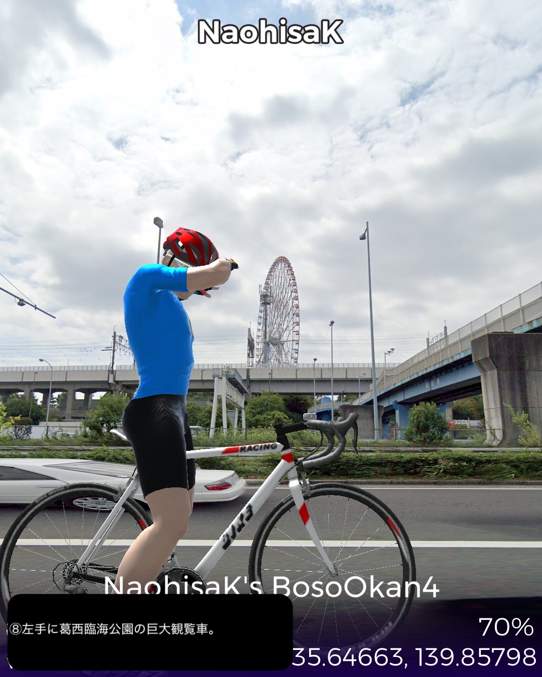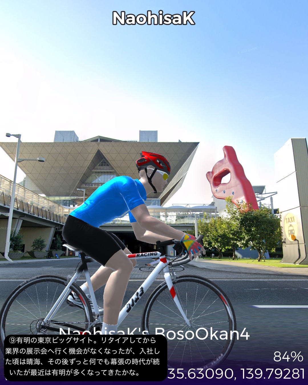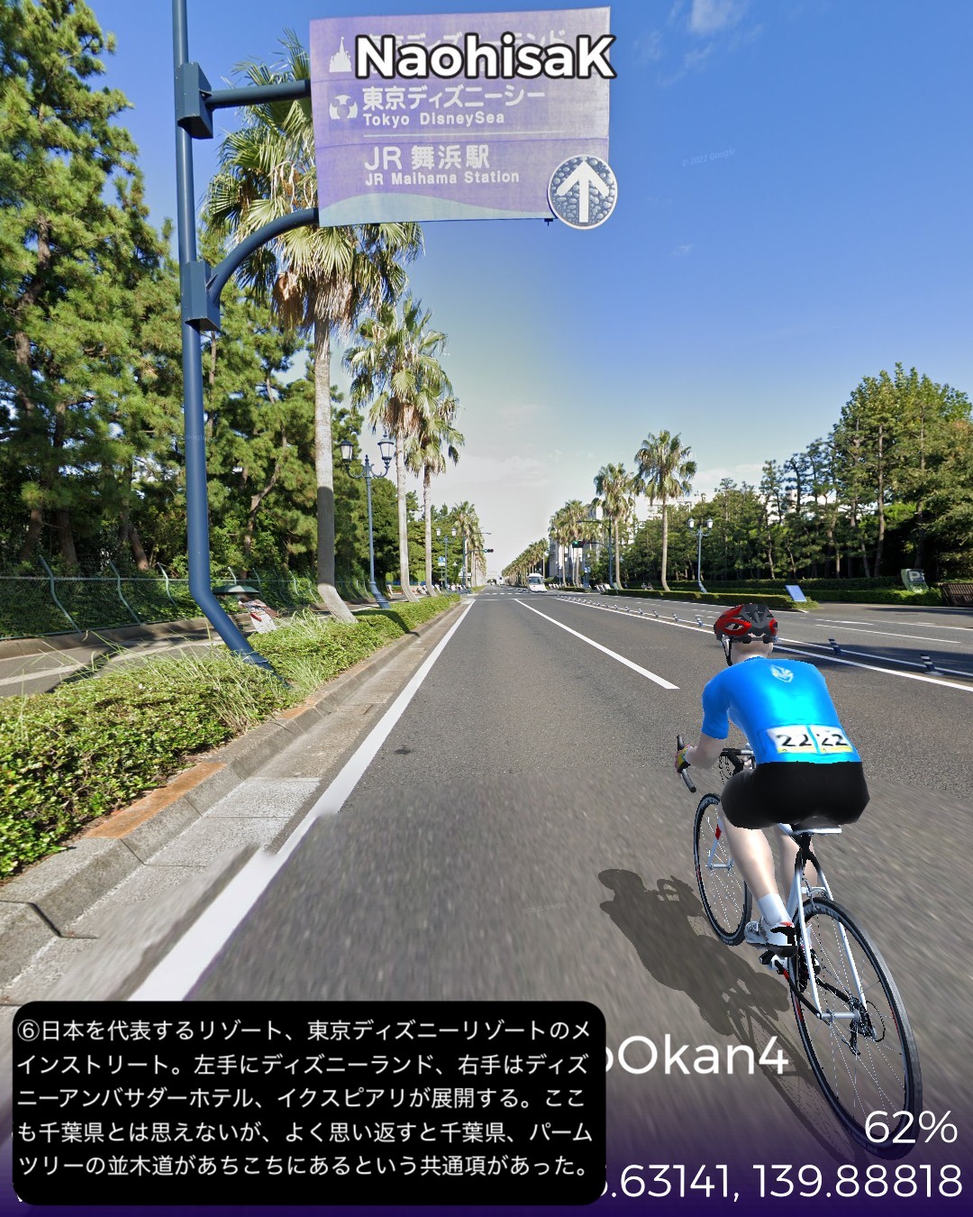 VRサイクリング 房総往還4日目。千葉方面の旅を終えて再度東京都内に戻るの巻。前回ゴールに近い東千葉駅付近をスタートし、稲毛、幕張を抜けて船橋市街の船橋大神宮前成田街道とぶつかって房総往還の終点へ到達し、そこから船橋港の脇ららぽーとから湾岸道路に入り、京葉線や首都高速湾岸線と並行して海沿いの埋立地を走る。ここから先は江戸時代には完全に東京湾の中だったところだが、浦安の東京ディズニーリゾート、葛西臨海公園、そして有明、お台場と馴染み深い湾岸地帯をぐるっと巡り巨大市場とショッピングモールとタワマンの街豊洲をゴールとする52kmの行程。それにしても房総半島は想像以上に奥深かった。三浦半島や伊豆東海岸あたりと比較すると秘境感が半端ない。九州・四国・紀伊半島をコンパクトにしてぐるっと巡ってきたような気分。その千葉の最後の場所が夢の国ディズニーリゾートというのが千葉の奥深さにギャップ萌えする。湾岸エリアの地理的なスケール感は日本離れしていてちょっと調子狂う。走ってもなかなか景色が変わらなかったり、近いと思っていた地点間が結構距離があったり。さて今度はどこへ進むのか次回のお楽しみ。