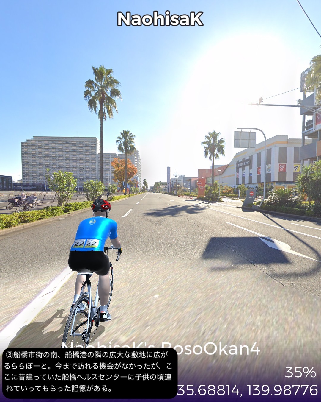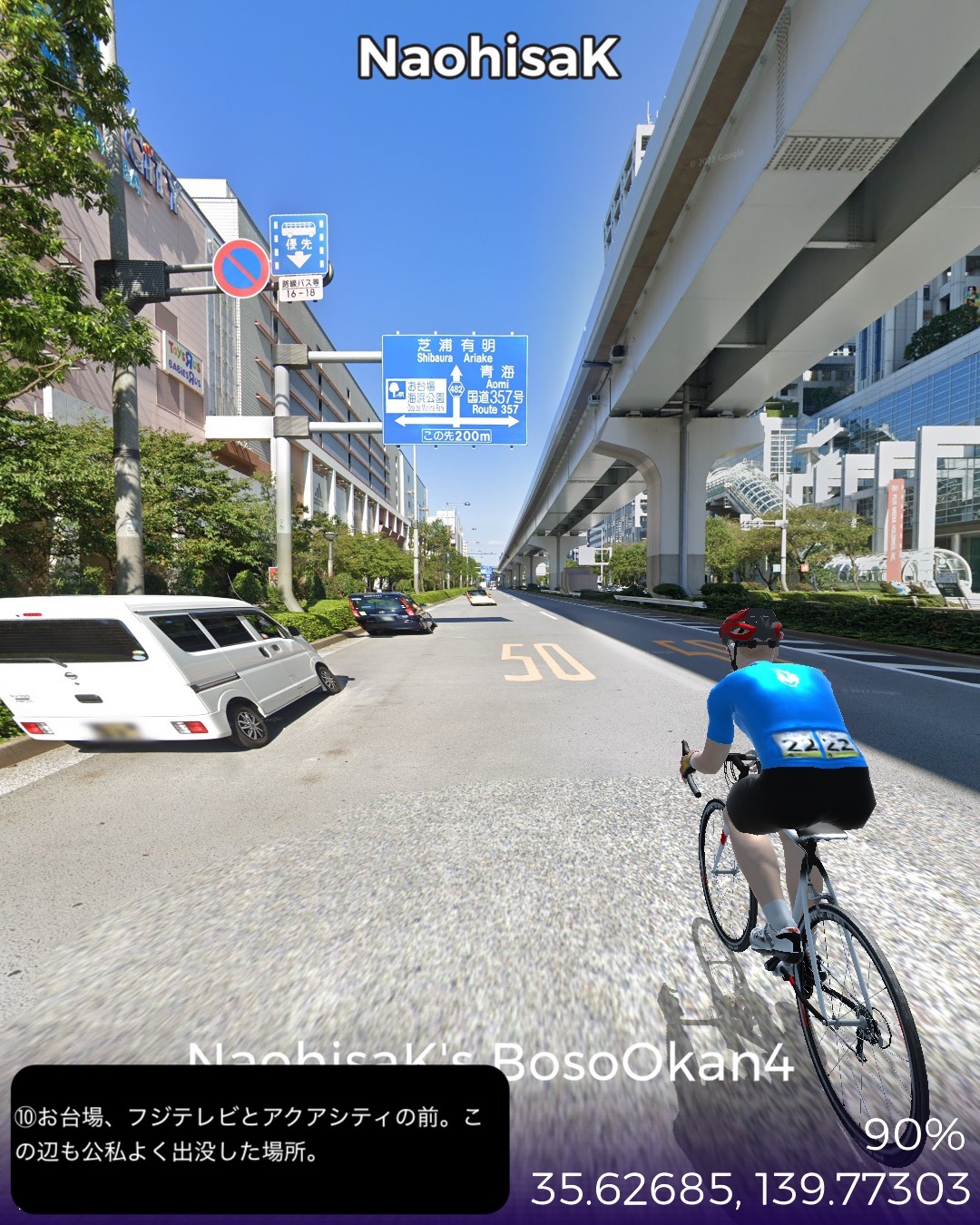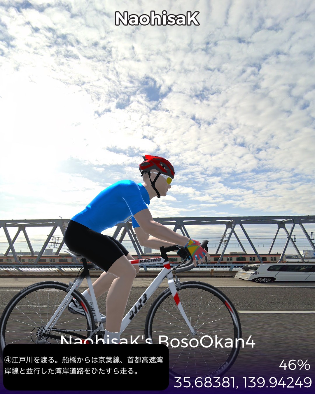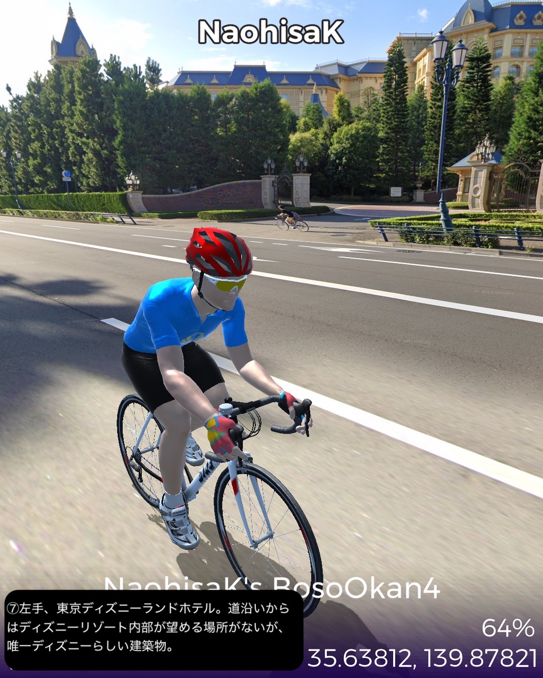 VRサイクリング 房総往還4日目。千葉方面の旅を終えて再度東京都内に戻るの巻。前回ゴールに近い東千葉駅付近をスタートし、稲毛、幕張を抜けて船橋市街の船橋大神宮前成田街道とぶつかって房総往還の終点へ到達し、そこから船橋港の脇ららぽーとから湾岸道路に入り、京葉線や首都高速湾岸線と並行して海沿いの埋立地を走る。ここから先は江戸時代には完全に東京湾の中だったところだが、浦安の東京ディズニーリゾート、葛西臨海公園、そして有明、お台場と馴染み深い湾岸地帯をぐるっと巡り巨大市場とショッピングモールとタワマンの街豊洲をゴールとする52kmの行程。それにしても房総半島は想像以上に奥深かった。三浦半島や伊豆東海岸あたりと比較すると秘境感が半端ない。九州・四国・紀伊半島をコンパクトにしてぐるっと巡ってきたような気分。その千葉の最後の場所が夢の国ディズニーリゾートというのが千葉の奥深さにギャップ萌えする。湾岸エリアの地理的なスケール感は日本離れしていてちょっと調子狂う。走ってもなかなか景色が変わらなかったり、近いと思っていた地点間が結構距離があったり。さて今度はどこへ進むのか次回のお楽しみ。