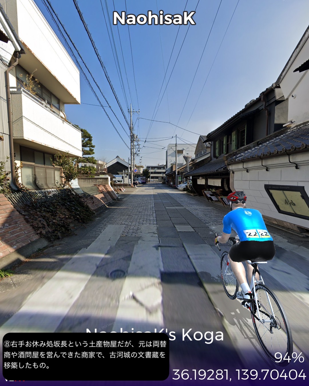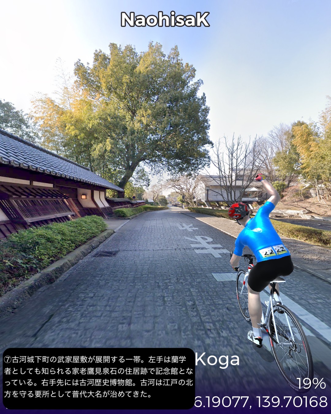 VRサイクリング 日光街道2日目。関東平野を地味に北へ進むの巻。東京のベッドタウン粕壁宿(春日部)を出発するとそれまでの郊外モードが一気に田舎モードに変化し田園地帯を進む。杉戸宿、幸手宿、栗橋宿と風情の残る宿場町を通り過ぎると広大な利根川を渡る。その先一旦下総国(茨城県)に入り城下町の香り漂う古河宿を若干街道を外れつつひと回りした後、先へ進み下野国(栃木県)の小山宿まで到達する46kmの行程。前半は前回同様宿場町が旧道沿いに結構保存されているので街並みを楽しめる。古河は城はなくなっているものの城郭や武家屋敷が保存されていていわゆる小京都か小江戸的に街巡りが楽しめる街だ。古河から小山までの後半戦はほとんど国道4号で走る道なので間に野木宿、間々田宿という宿場があるはずなのだが、特に痕跡が認められないまま田園の中を引っ掛かりなく通りすぎた感じ。次回は餃子の街宇都宮に突入だ。