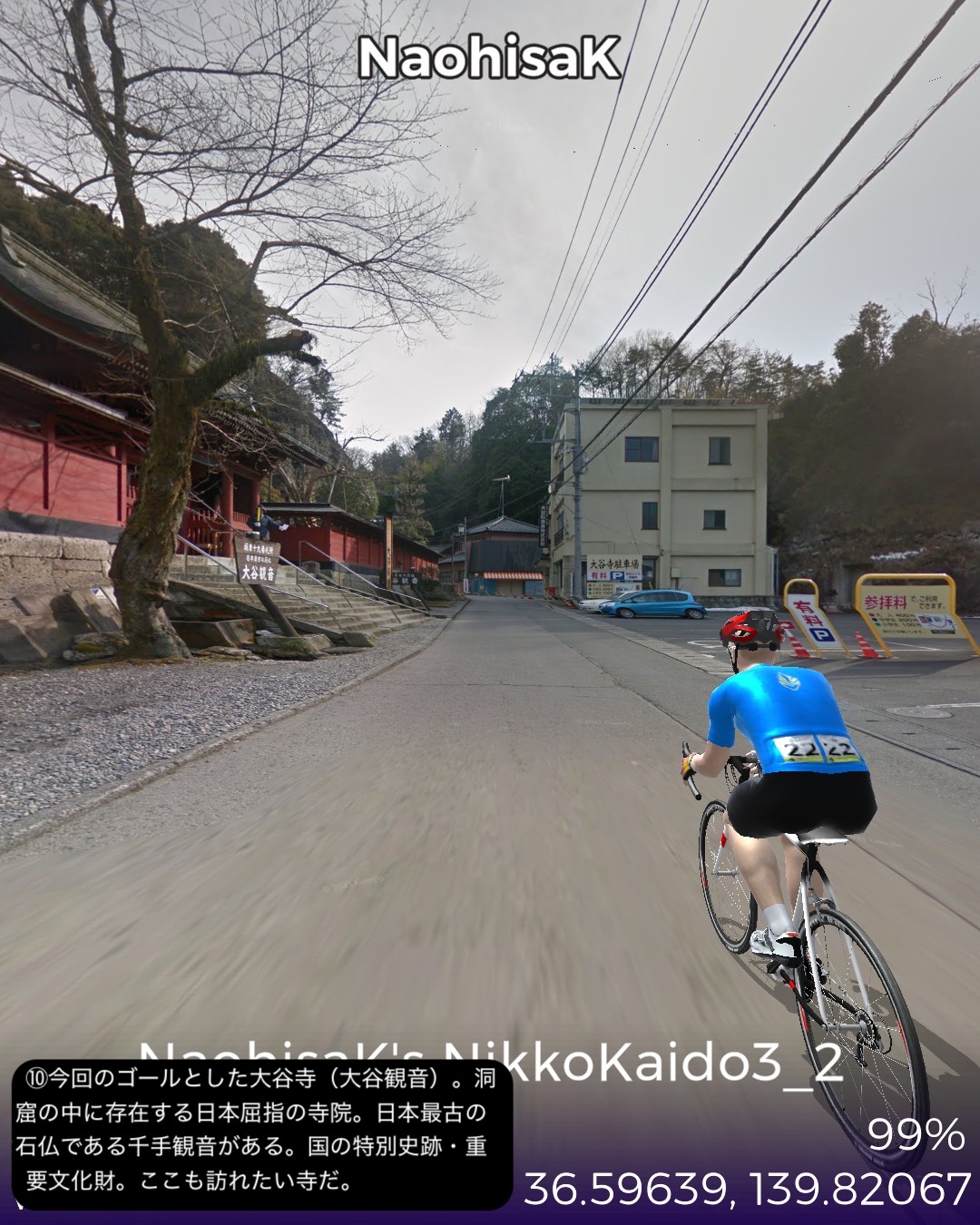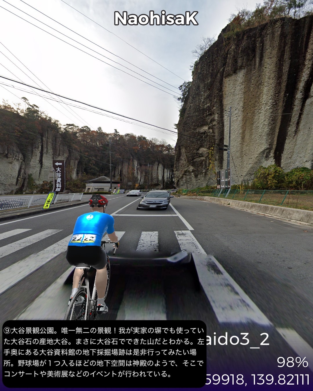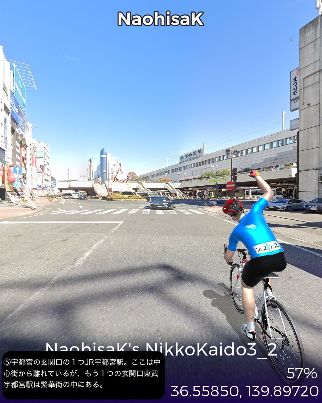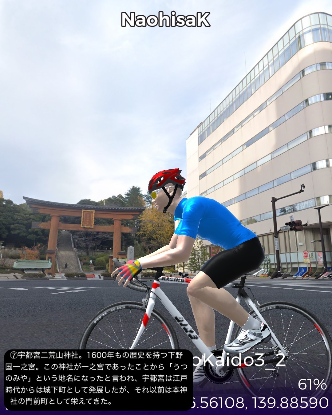 VRサイクリング、日光街道3日目。結果的には宇都宮観光ルート。栃木県南部の中心都市小山市の小山宿を出発し、新田宿、小金井宿、石橋宿、雀宮宿とほぼ国道4号線で通り過ぎ宇都宮市街に入ったところで、街道を外れて、宇都宮城址、JR宇都宮駅、餃子通り、宇都宮二荒山神社、松が峰教会と宇都宮のスポットを一巡り。街道に戻って日光へ向けてしばらく北へ走った後再度街道を外れて寄り道モード。行ってみたかった大谷石の産地大谷まで進む44kmの行程。宇都宮までの国道走りはやはり見るべきものはない。日本中どこへ行っても国道は同じように沿道店舗が建ち並びちょっとした名所史跡は隠れてしまうので面白くないのである。その分大谷も含めた宇都宮巡りは楽しかった。宇都宮市街はしばらく田舎を走ってきた流れからすると目まぐるしい大都市だが、名所史跡はなかなか立派で見応えがありそうだし、餃子グルメも含め魅力的な街だ。宇都宮の先の街道には日本屈指の山桜古木の桜並木が延々と続く区間があり、残念ながら外れのシーズンだったが開花のシーズンは素晴らしい眺めだと想像できる。何よりもゴールの大谷の景観は唯一無二で素晴らしい。我が実家の塀も大谷石だったが、昔は少なくとも東京近郊では大谷石の塀が多かった。その大谷石の唯一の産地大谷はまさにそこらじゅうの山が大谷石でできているのが露出した崖面でわかる。野球場が入るほどの大空間が広がる地下採石場跡は是非行って見たい場所だ。日本屈指の洞窟に展開する石仏が見られる大谷観音も同様に必見だな。まぁこういうのはリアルに行かないと見れないんだけれど。次回は街道の終点日光へ到達する。