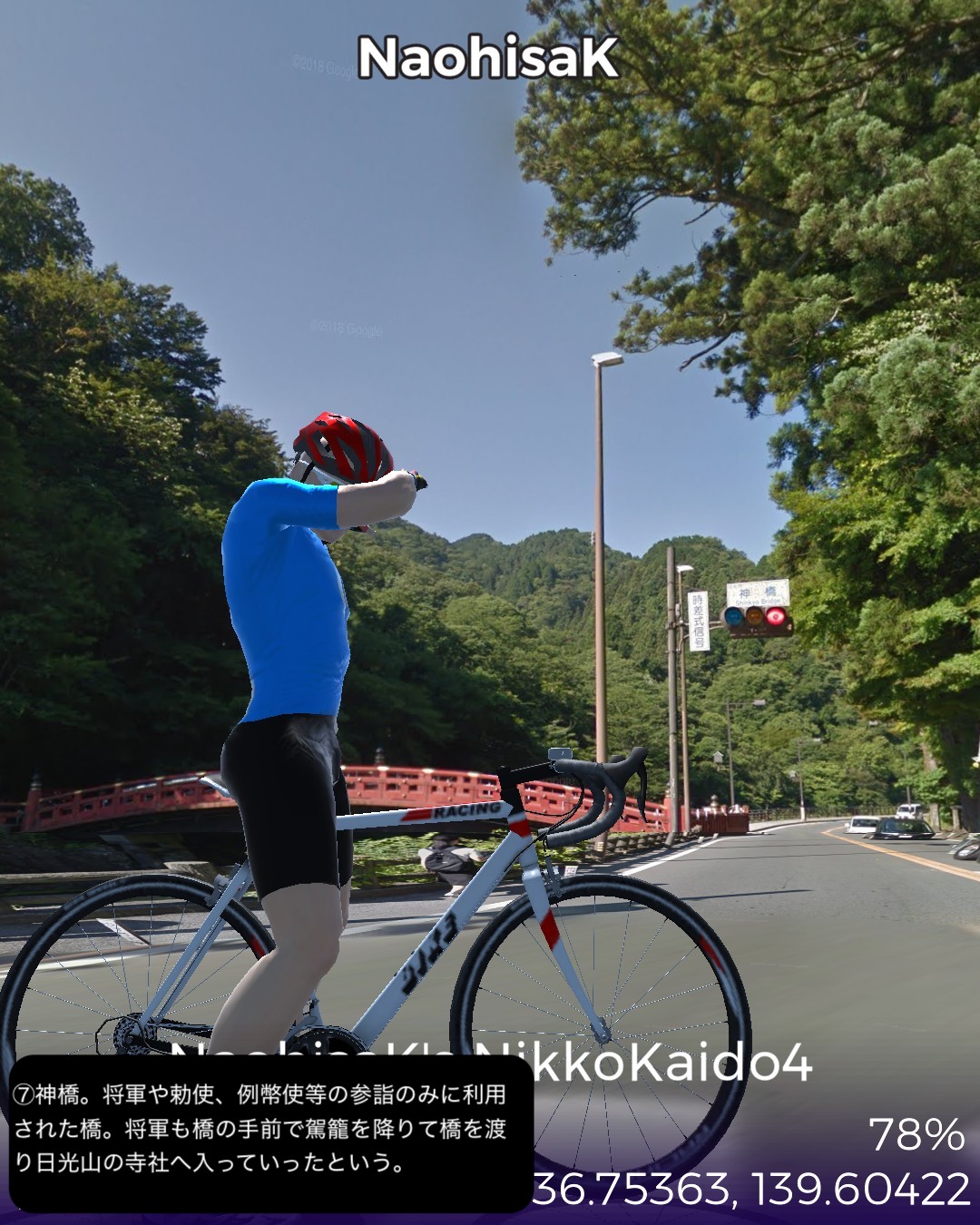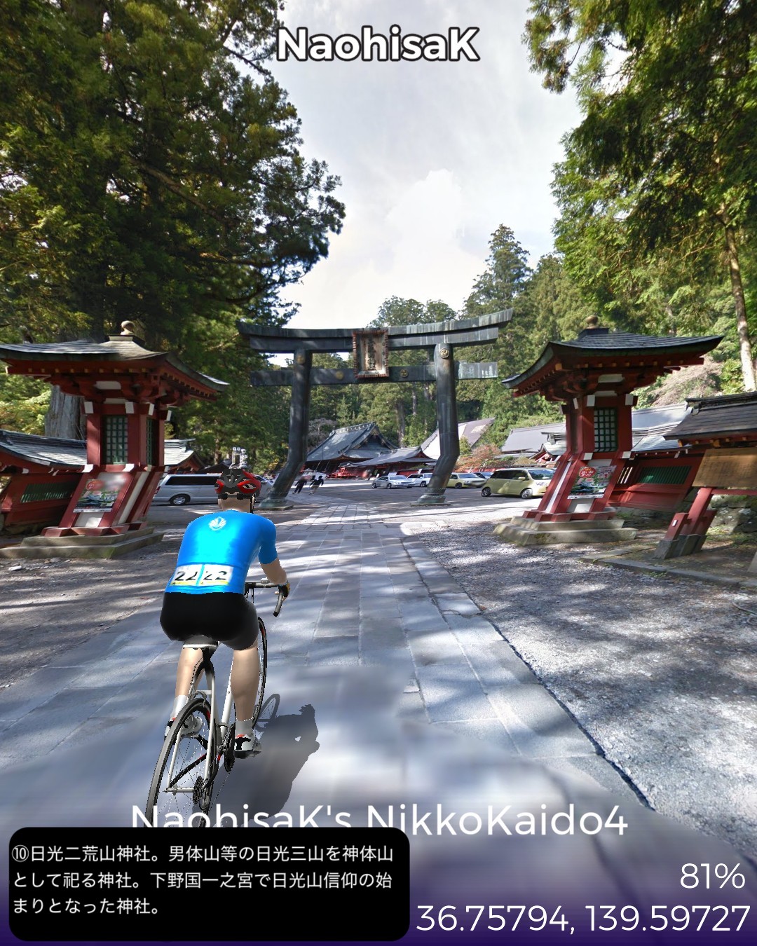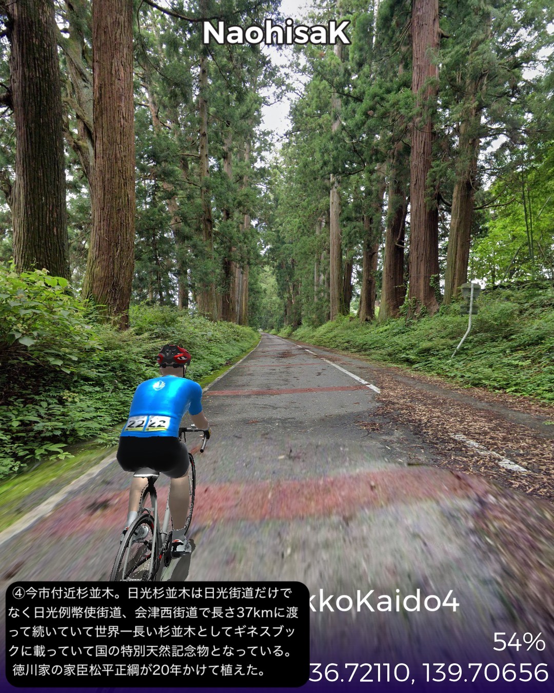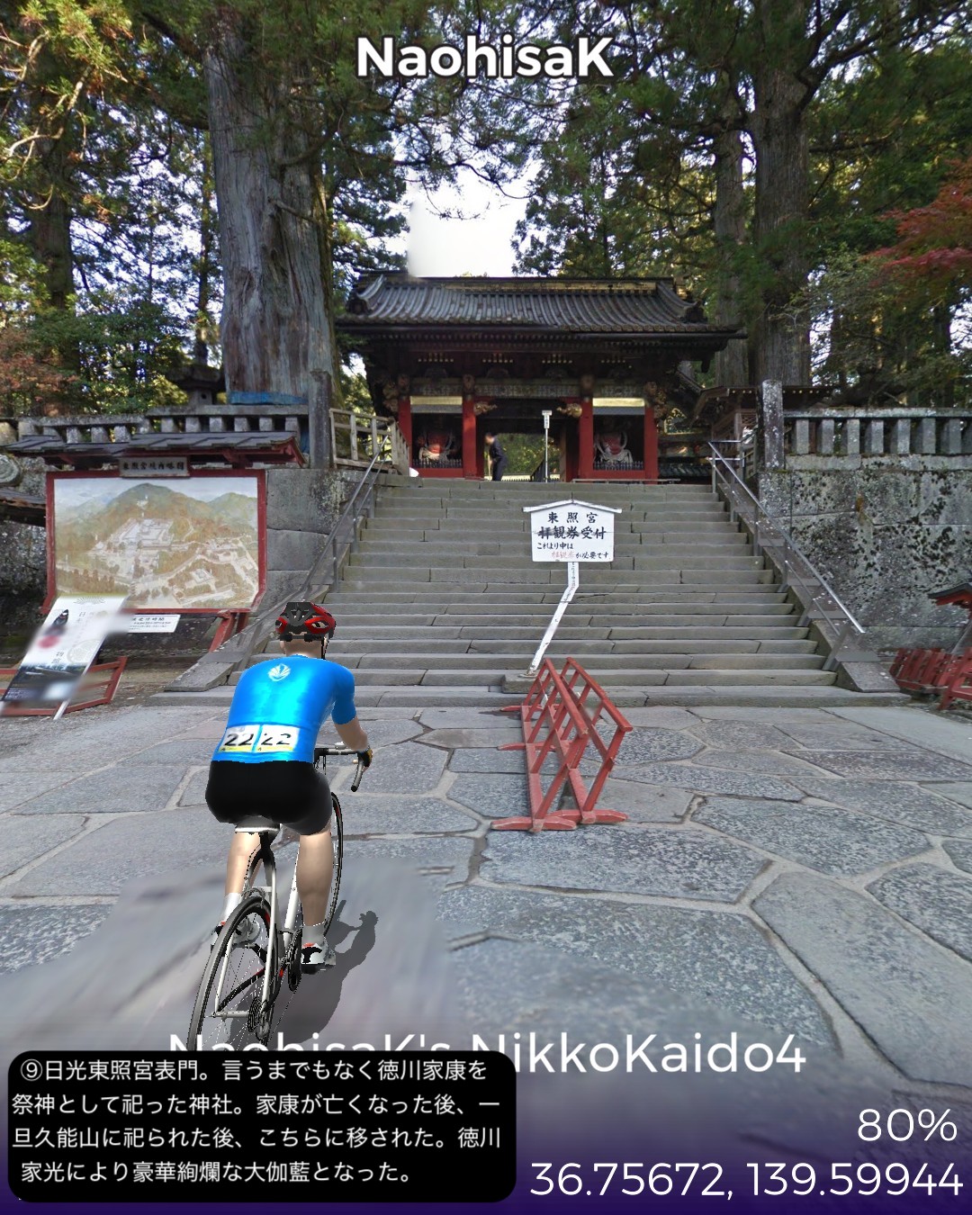 VRサイクリング 日光街道4日目。世界遺産日光山に到着しさらに進むの巻。前回大谷へ寄り道する時に日光街道から外れた宇都宮市野沢町付近を出発して、徳次郎宿、大沢宿、今市宿、そして街道終点の鉢石宿と進む。前半は断続する桜並木と田園の中、後半は主に荘厳な日光杉並木の中を進む。そして神橋から日光山へ入り、輪王寺、日光東照宮、日光二荒山神社を巡る。これで日光街道の旅は終了するが、そのまま先へ進みいろは坂下まで到達する42Kmの行程。日光街道の最終段は徳川家の威光をアピールする意図があるせいか他の街道とは異なった目的地へ向けての盛り上げが素晴らしい。前回も触れた桜並木が宇都宮から徳次郎宿付近まで断続的に続き、その先杉並木にスイッチするとそれがほぼ切れることなくずっと続くのだ。日光杉並木は国の特別天然記念物に指定され、世界一の長さとしてギネスブックに掲載されている。並木道を進むと荘厳で原始的なパワーが感じられる。日光山はリアルに数回訪れていてその都度どうしても豪華絢爛な日光東照宮に目がいってしまうが、輪王寺や日光二荒山神社は徳川家康以前の弘法大師や源頼朝も認める古くからの山岳信仰の聖地だったことを今回知った。さてその先だが、日光観光のゴールデンルートに従って、中禅寺湖から奥日光へ行ってみる。その先どこへ進むかはお楽しみ。