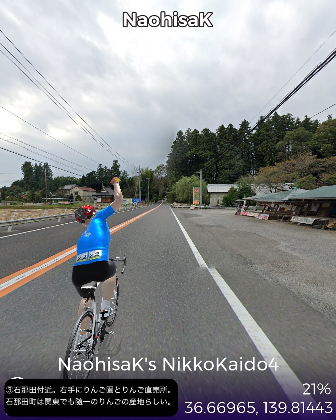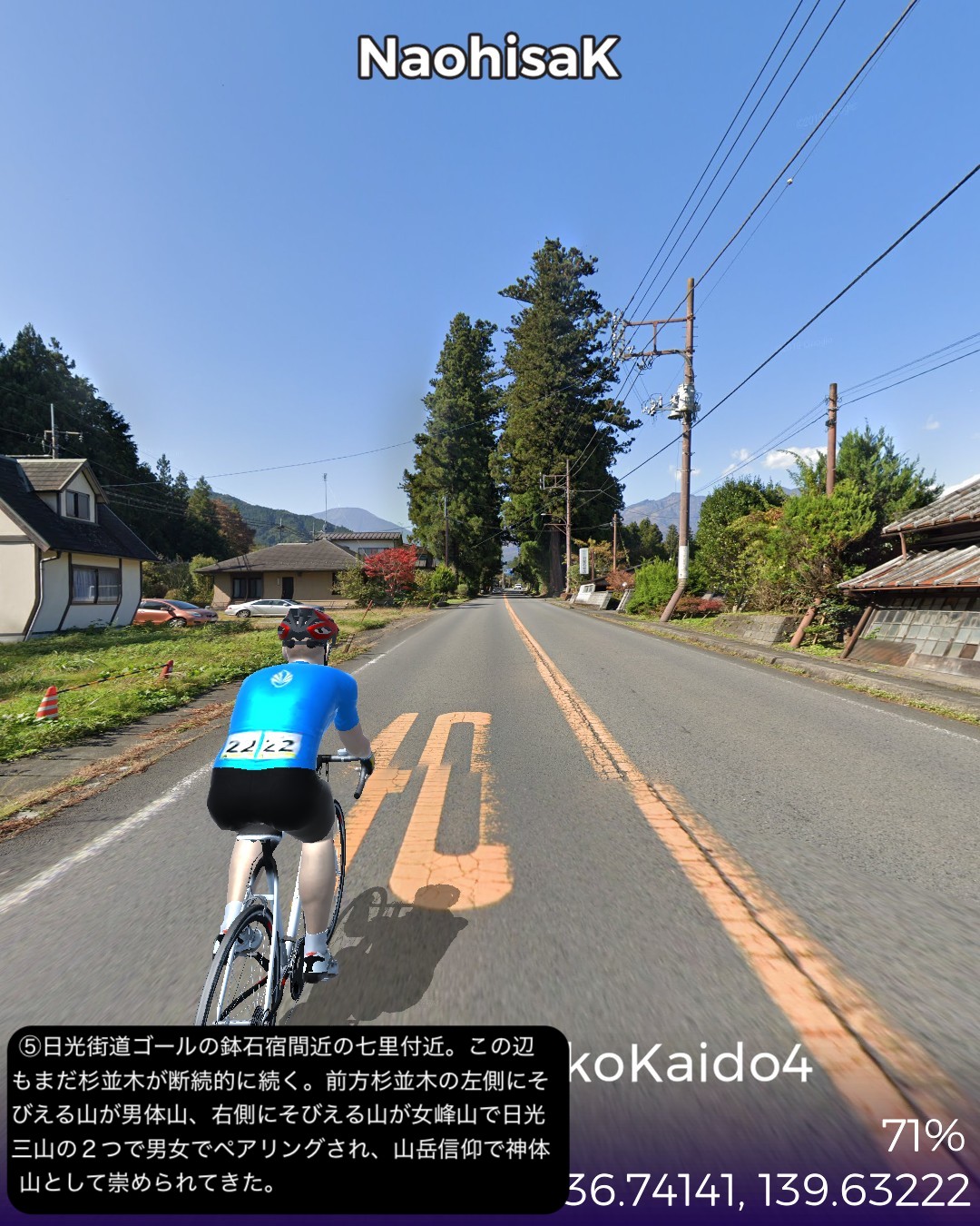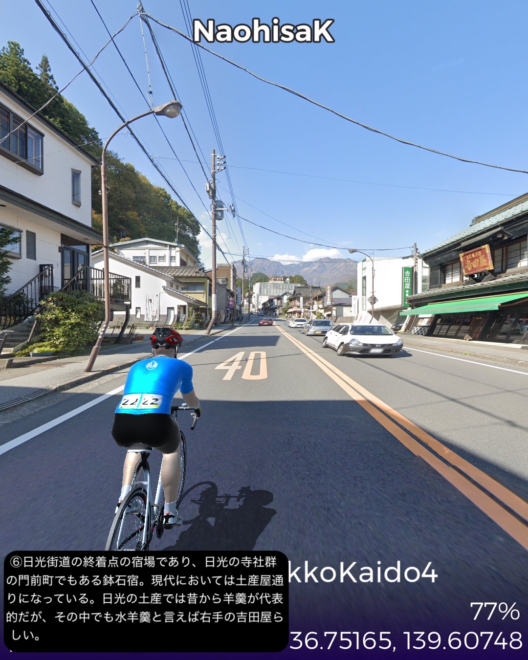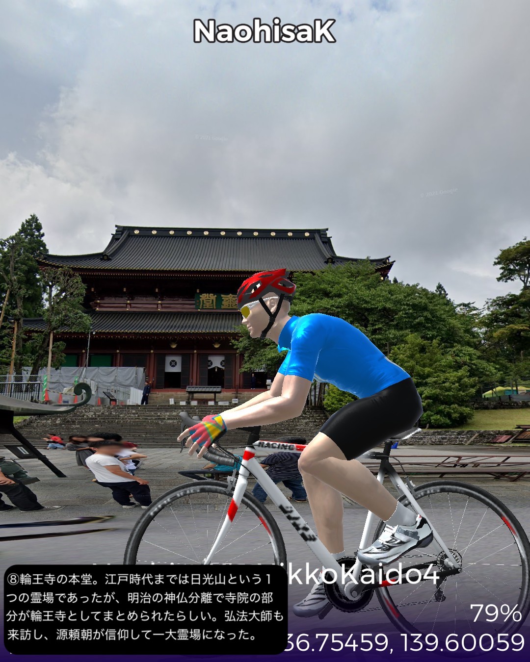 VRサイクリング 日光街道4日目。世界遺産日光山に到着しさらに進むの巻。前回大谷へ寄り道する時に日光街道から外れた宇都宮市野沢町付近を出発して、徳次郎宿、大沢宿、今市宿、そして街道終点の鉢石宿と進む。前半は断続する桜並木と田園の中、後半は主に荘厳な日光杉並木の中を進む。そして神橋から日光山へ入り、輪王寺、日光東照宮、日光二荒山神社を巡る。これで日光街道の旅は終了するが、そのまま先へ進みいろは坂下まで到達する42Kmの行程。日光街道の最終段は徳川家の威光をアピールする意図があるせいか他の街道とは異なった目的地へ向けての盛り上げが素晴らしい。前回も触れた桜並木が宇都宮から徳次郎宿付近まで断続的に続き、その先杉並木にスイッチするとそれがほぼ切れることなくずっと続くのだ。日光杉並木は国の特別天然記念物に指定され、世界一の長さとしてギネスブックに掲載されている。並木道を進むと荘厳で原始的なパワーが感じられる。日光山はリアルに数回訪れていてその都度どうしても豪華絢爛な日光東照宮に目がいってしまうが、輪王寺や日光二荒山神社は徳川家康以前の弘法大師や源頼朝も認める古くからの山岳信仰の聖地だったことを今回知った。さてその先だが、日光観光のゴールデンルートに従って、中禅寺湖から奥日光へ行ってみる。その先どこへ進むかはお楽しみ。