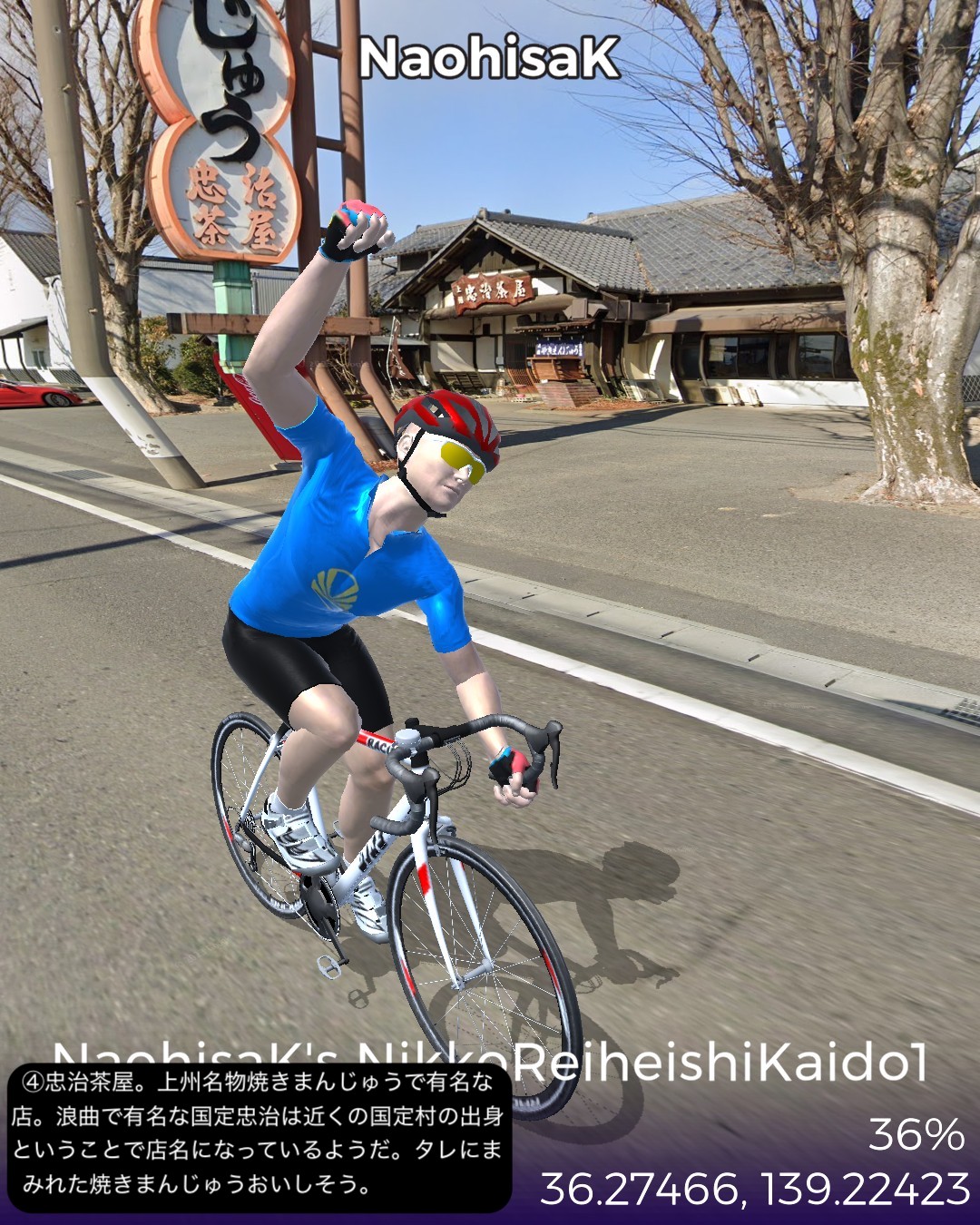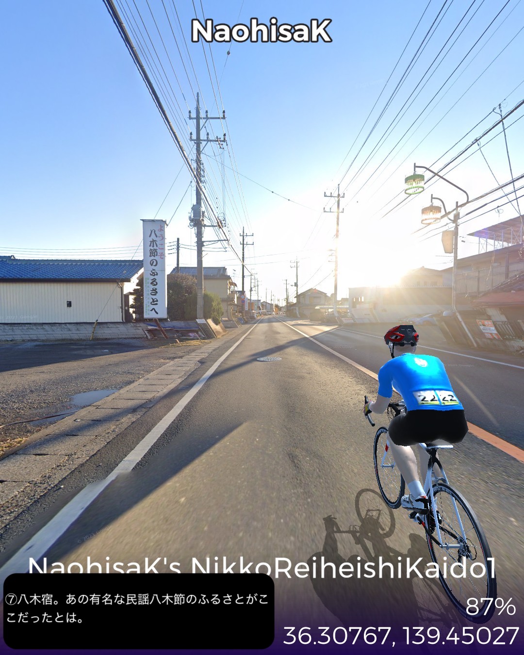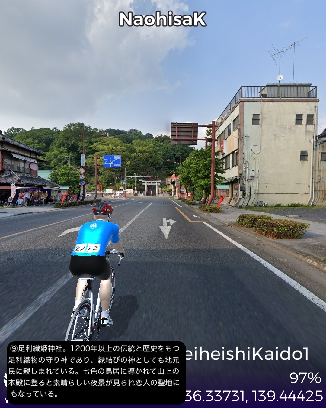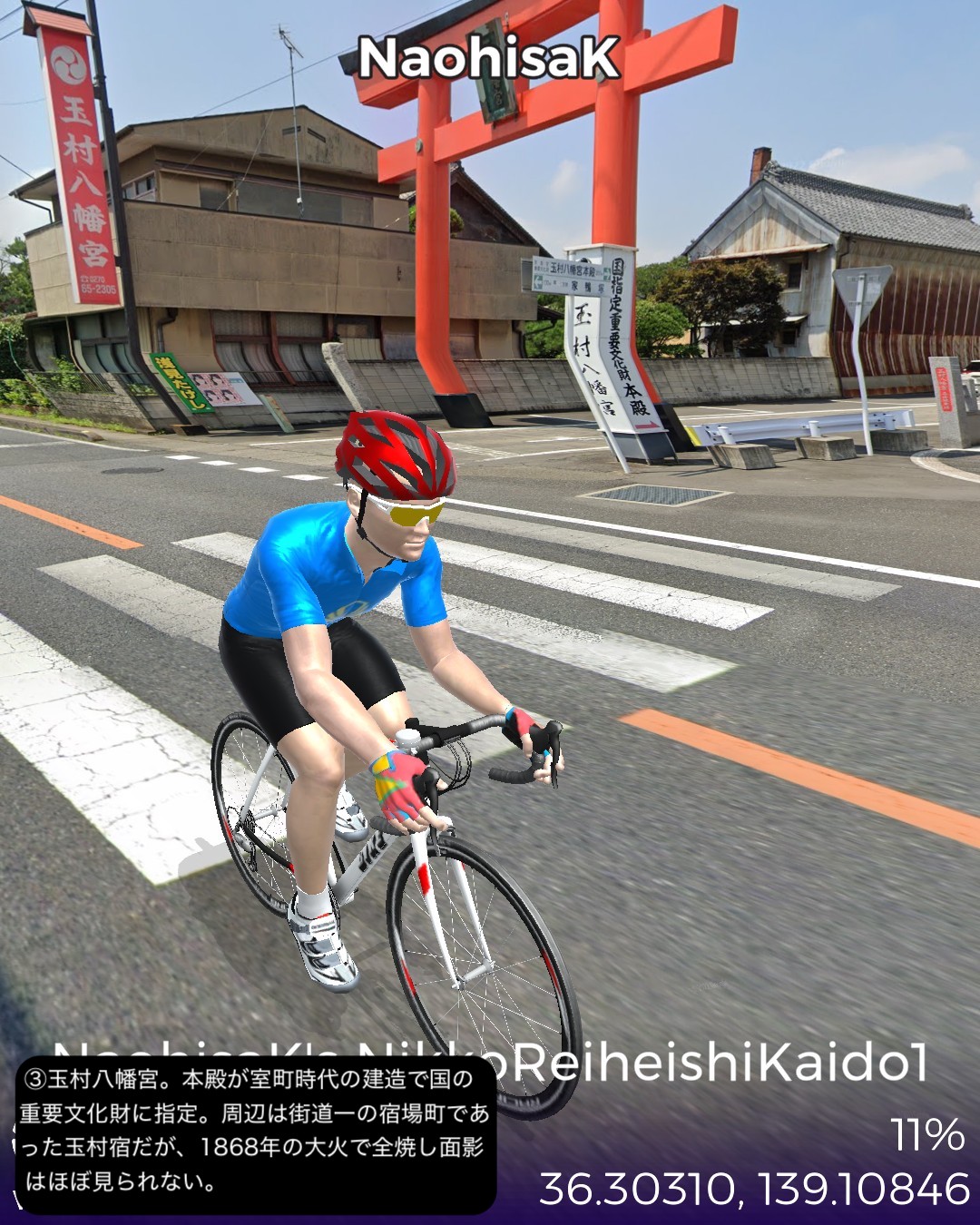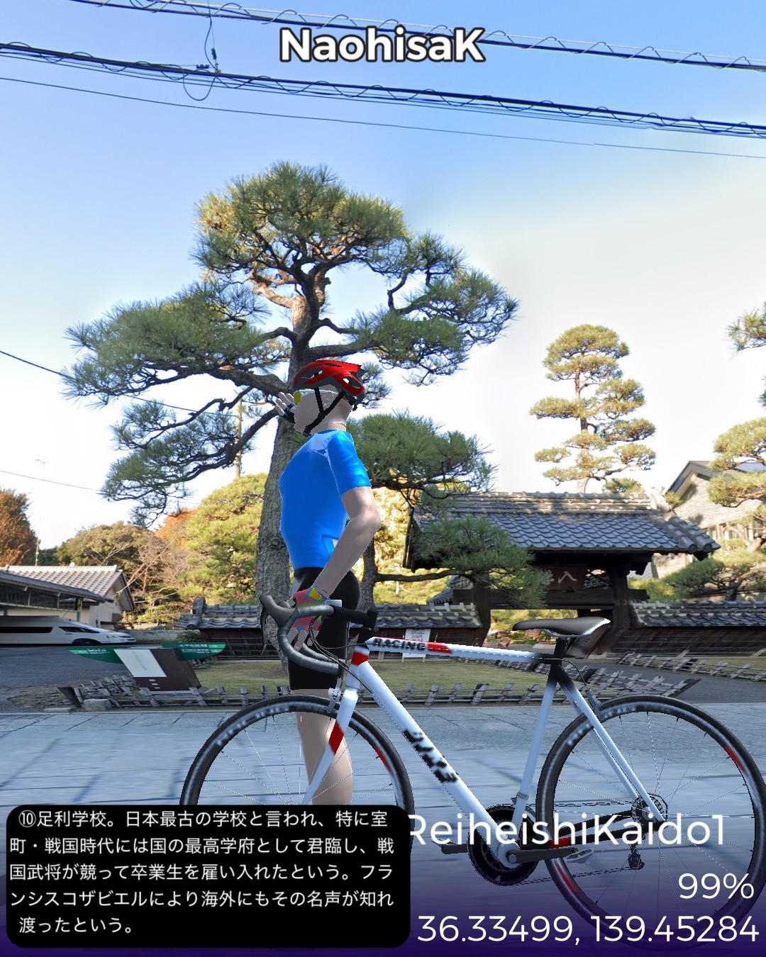 VRサイクリング 今回から北関東中央部を切り裂くように西から東へ横断してゆく。まずは日光例幣使街道 1日目。中山道倉賀野宿の追分をスタートして日光例幣使街道に入り関東平野の田園の中、あるいは家並の中を東へ進む。玉村宿、境宿を経てスバルの企業城下町太田の市街地へ入る。さらに田園地帯を進み八木節のふるさと八木宿で街道を左折して寄り道モードで、東の京都、北の鎌倉と呼ばれる史跡の町足利をぐるっと巡ってゴールとする47kmの行程。日光例幣使街道は、京の朝廷から日光東照宮の春の祭礼に派遣した例幣使が毎年通る道として整備された。京都を出て中山道を通って倉賀野から本街道に入るとほぼ最短距離で日光へ進む道筋となる。朝廷を代表する例幣使としては屈辱的な儀礼であったせいか、例幣使一行はゆすりたかりなどあらゆる手段で街道沿いの人々を苦しめたとある。「ゆすり」の語源は、一行が駕籠をわざとゆすって金をせびる所業からきているという。雅な方々とは到底思えないひどい話である。これも幕府が毎年の行列を手厚くサポートしたせいらしいが、その分街道筋は五街道と同等に整備され、それと共に沿道の産業も振興されていたことは感じ取れる。ゴールとした足利は先日ブラタモリでも取り上げていたが、鎌倉時代の有力武将で、室町幕府を興した足利氏の本拠地であり、多くの史跡がある。その中でも足利学校は日本の最初の学校と言われ、中世における最高学府と位置付けられ、戦国武将の知恵袋となる人材を育てあげた。フランシスコザビエルにより海外にもその名声は届いたという。