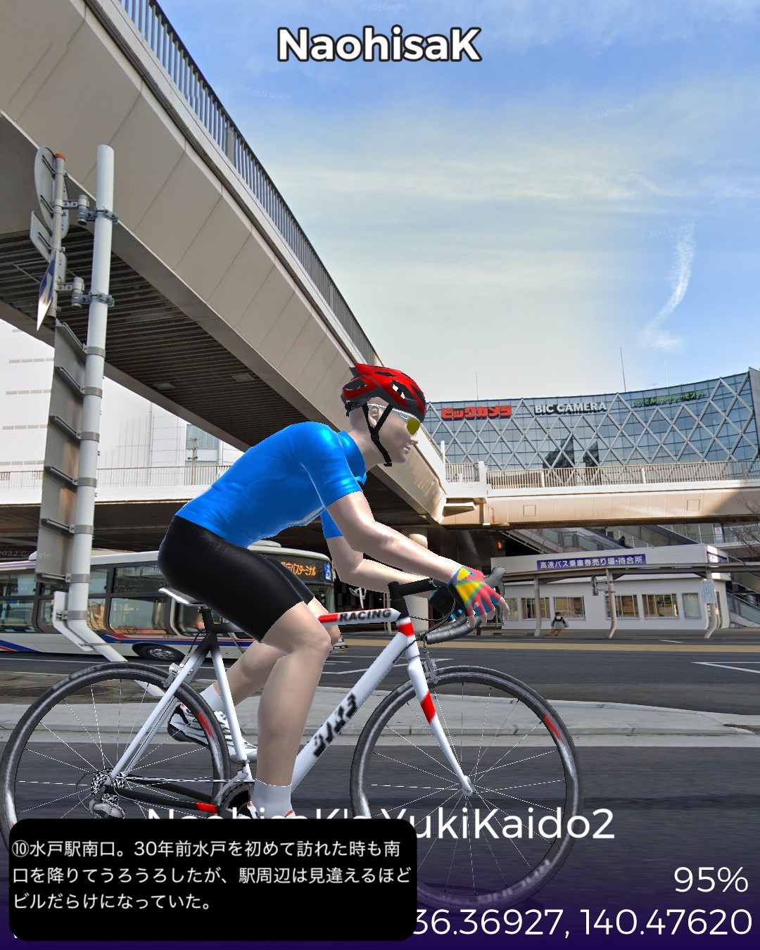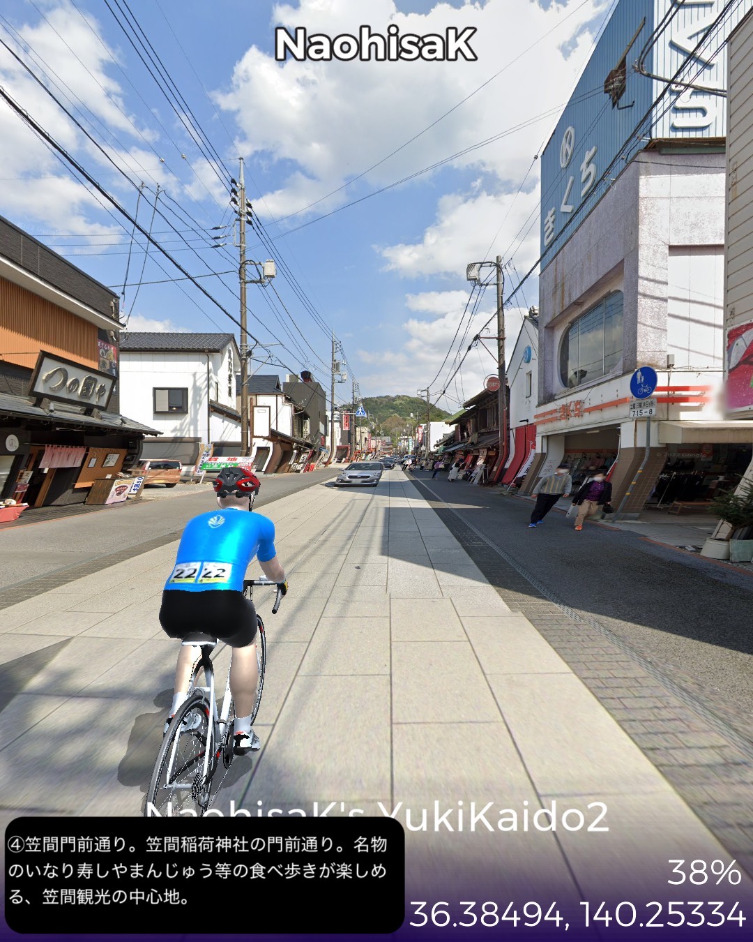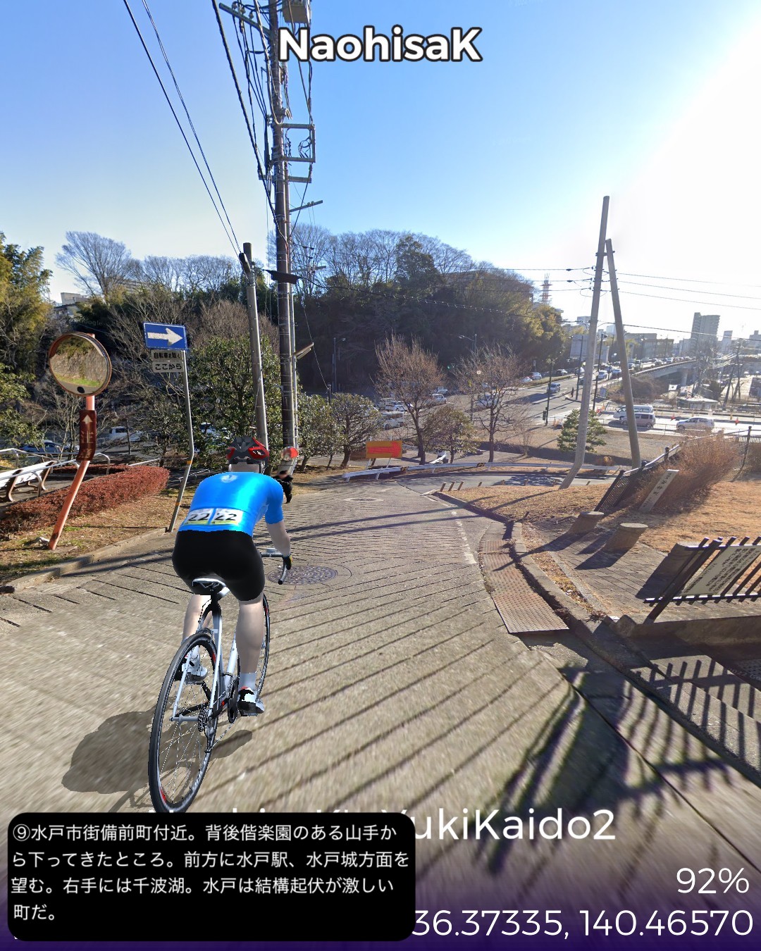 VRサイクリング、結城街道2日目。北関東横断完結編。水戸へ到着の巻。岩瀬を出発し、平地と山地の境を縫って進むと日本三大稲荷の1つ笠間稲荷神社のある城下町の笠間市街へ入ってゆく。笠間市街を抜けて田園地帯の広がりを感じるとしばらくして水戸市街へ入る。日本三名園の1つ(なんか今日は日本三XXが多いな)偕楽園をかすって水戸駅の南東の町外れにある旧水戸宿付近、結城街道、水戸街道、陸前浜街道の起点終点が集まる昔の交通の要所、本町の交差点をゴールとする42kmの行程。主に山里と田園を抜けてゆく地味なルートであるが、やはり笠間と水戸が今日のポイントだな。途中の笠間は訪れたことがなかったが、高名な笠間稲荷神社があり、人気のある陶磁器笠間焼があり、また春のつつじと秋の菊で人を集めたりイベントも多いなかなか戦略的な観光都市だとわかった。御三家の1つ(やはり三XXが多い)水戸徳川家の城下町で県庁所在地の水戸は過去数回訪れてその都度偕楽園にも足を運んだたのを思い出す。やはり水戸といえば偕楽園と梅と納豆ですな。結構坂道が多い地形が複雑な町だというのは今回初めて認識した。次回は水戸から再度江戸へ向けて水戸街道をのぼる。
