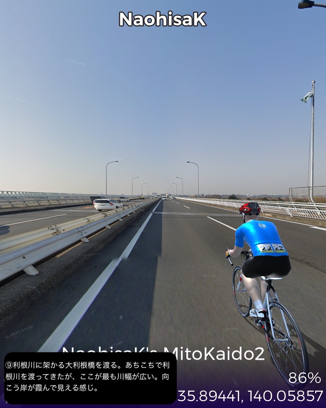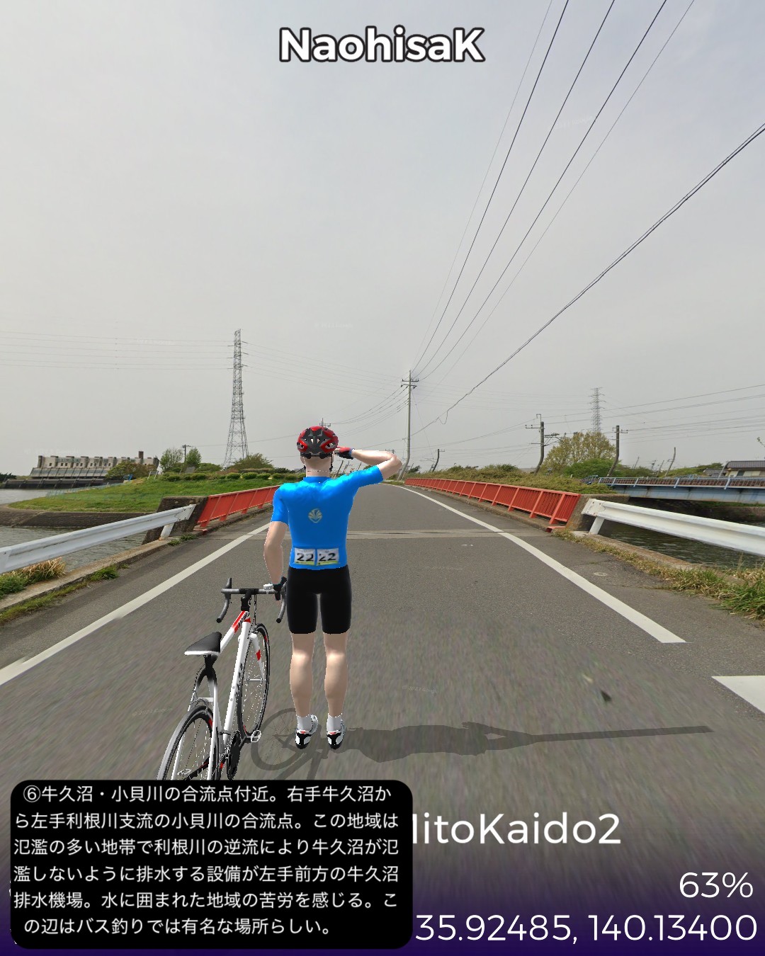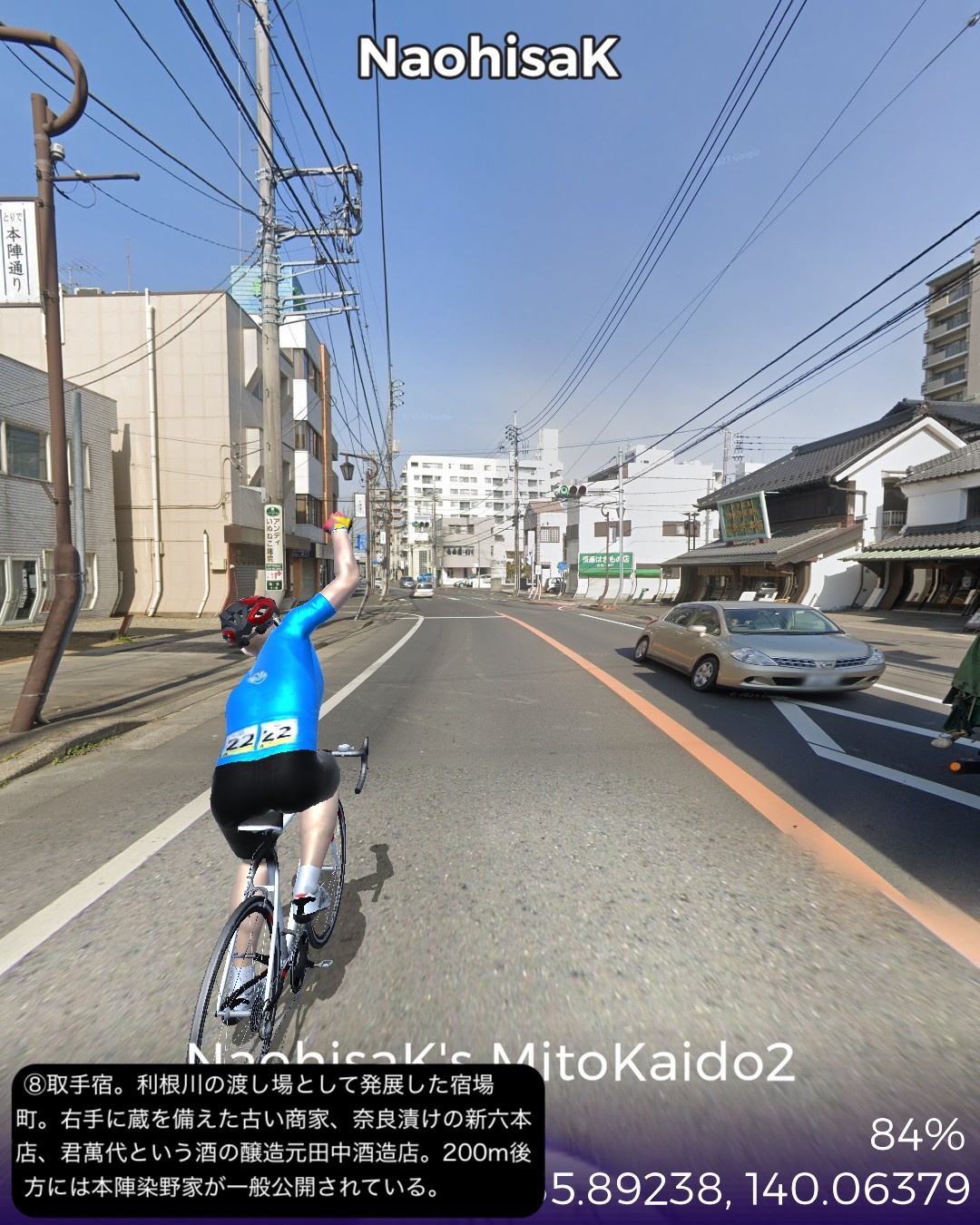 VRサイクリング 水戸街道2日目。河川の氾濫が頻繁に起きそうな地域を進む。前回つくば学園都市へ寄り道するために街道から外れた土浦近郊をスタートし、牛久宿で二箇所ほど寄り道して先へ進む。立派な旧家の屋敷が建ち並ぶ若柴宿、さらに藤代宿を経て田園の中を進むと利根川の辺取手宿に着く。利根川の長大な橋を渡り千葉県に入るとまもなくゴール我孫子宿に至る44kmの行程。牛久では日本初の本格的ワイン醸造所で国の重要文化財、日本遺産に輝く牛久シャトーの優美な館を愛で、絶景が広がっているわけではないがビオトープ な自然環境がしみじみ美しい牛久沼の周辺を巡ってみた。それにしても牛久沼から利根川水系をはさんで手賀沼のあるゴールの我孫子までの低地、(ひょっとしたらさらに江戸川、荒川のある江戸下町まで)は、街道を走っていても河川氾濫の脅威を感じる地域でもある。次回は水戸街道終点、もう何度目になるかわからないが江戸東京へ戻る。
