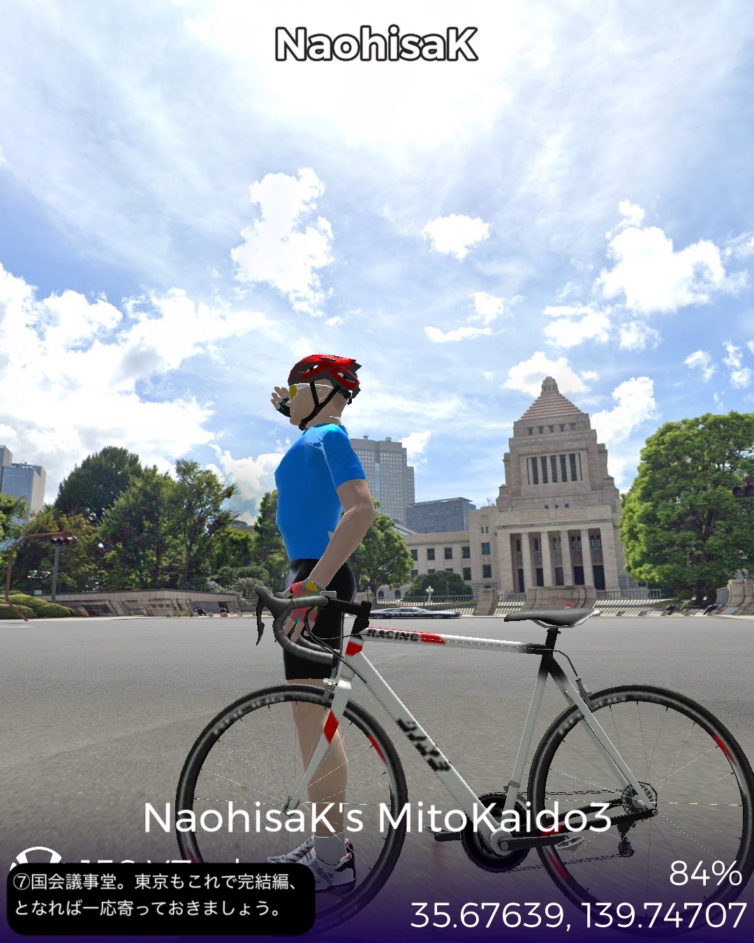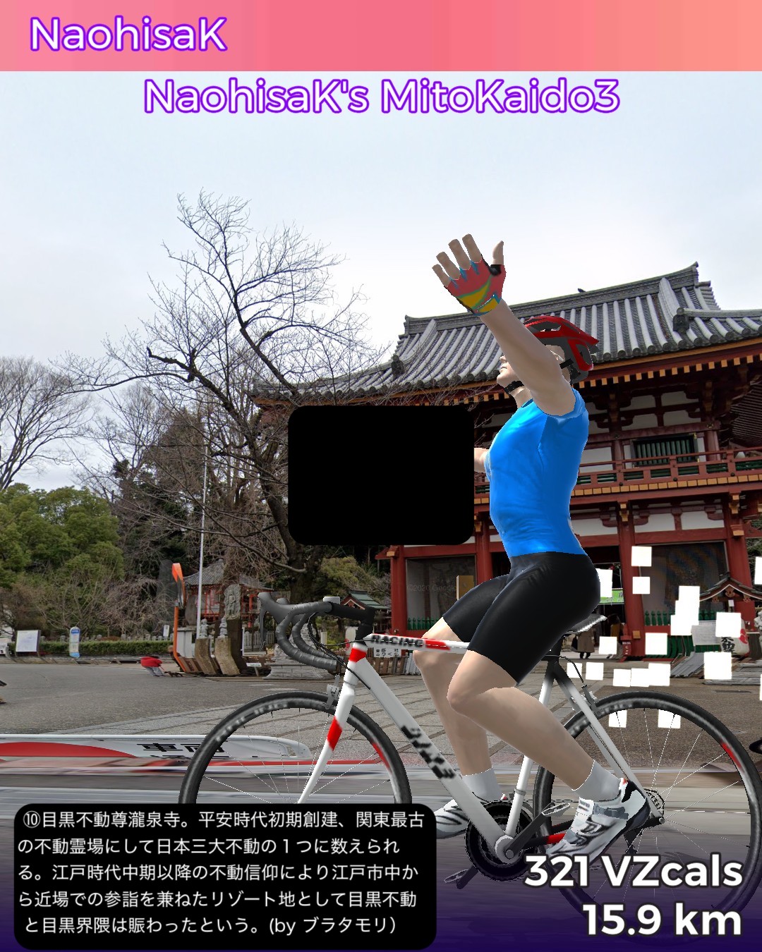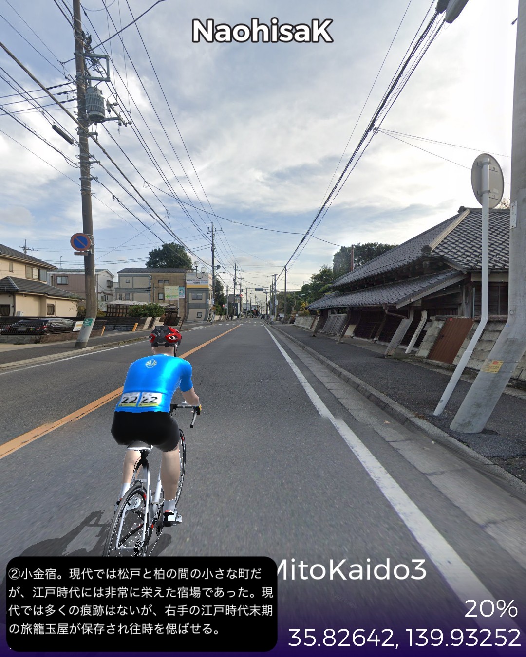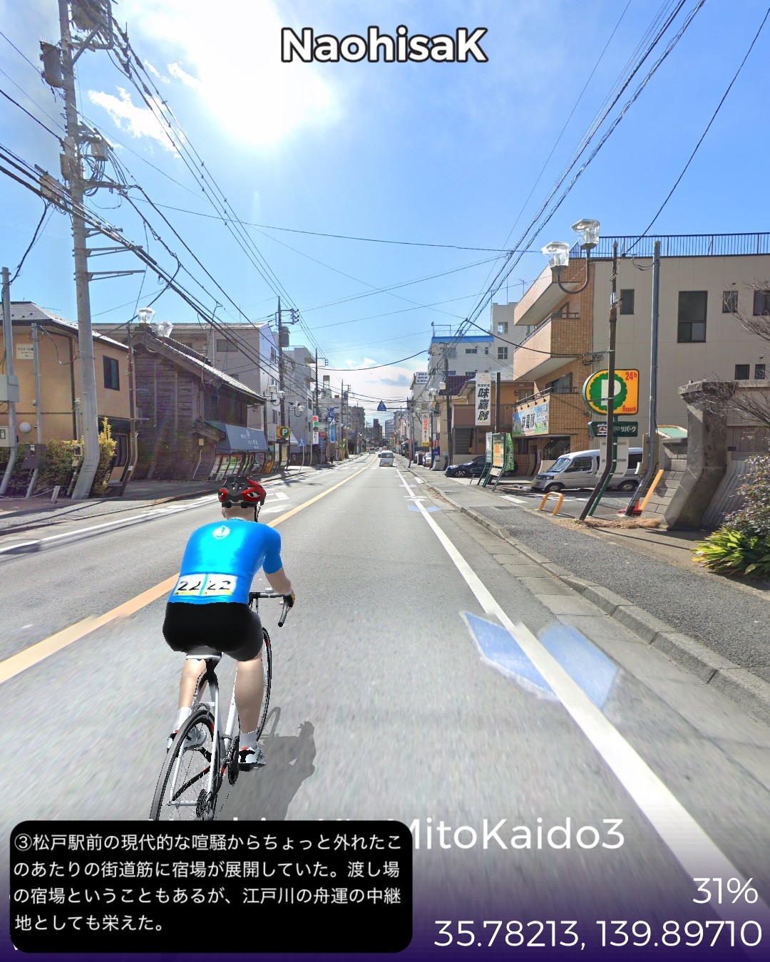 VRサイクリング 水戸街道3日目 江戸・東京への帰還の巻。手賀沼のほとり我孫子宿をスタートし、宿場ではない柏の雑踏を過ぎ、今は寂れているが昔は栄えていた宿場小金宿、今も昔も江戸・東京から江戸川を越えたゲートシティ松戸宿と常磐線に沿って走り、江戸川・荒川を越えて水戸街道の終点、日光街道からの追分のある千住宿へ到達。ここから先は例によって寄り道モードで江戸・東京で今まで巡っていない地点を結んで走る。いわゆる谷根千をぐるっと巡って上野、飯田橋・九段を抜け国会議事堂から赤坂、六本木、広尾と来て最後は目黒は目黒不動瀧泉寺をゴールとする55kmの行程。水戸街道の終盤、柏、松戸あたりは近郊にも関わらずリアルには今まで一歩も足を踏み入れたことのないエリア。そもそも子供の頃から東京に住んでいて四方八方飛び回ってきたのになぜか常磐線沿線だけは友人・親戚もいないし仕事や私用のネタもなく自分にとって唯一の未開の地だった。今回VRで走ってみて今まで漠と想像していたのと違う点は思ったよりずっと河川や沼に囲まれた地域であるな、というところかな。いずれにしても近郊を走っているのに離れた異郷に迷い込んだようなエキゾチズムがあってある意味興味深かった。そして今まで幾たびも通り抜けてきた江戸・東京であるが今回をもって最期とし、多分二度と戻ることはないと思う。よって、今まで通ってこなかった地区を繋げて、ゴールは昔の江戸市民の近場のリゾート地であった目黒としてみた。次回から新たな旅へスタートするまでしばらくバーチャルには江戸・東京で一休みの予定。(リアルにはどこかへ旅をしているのかもしれないが)