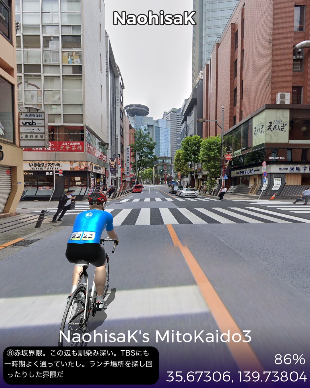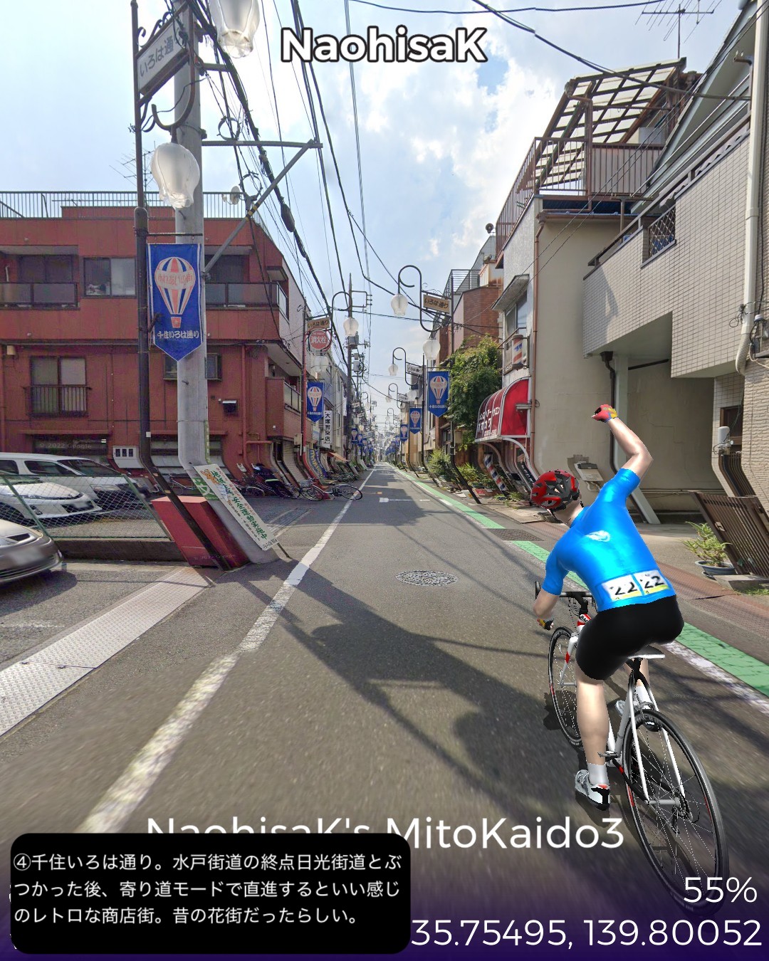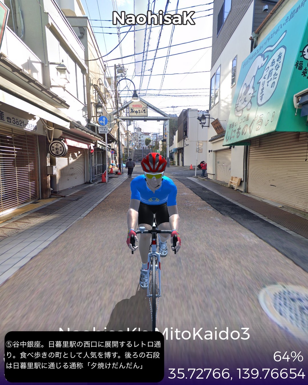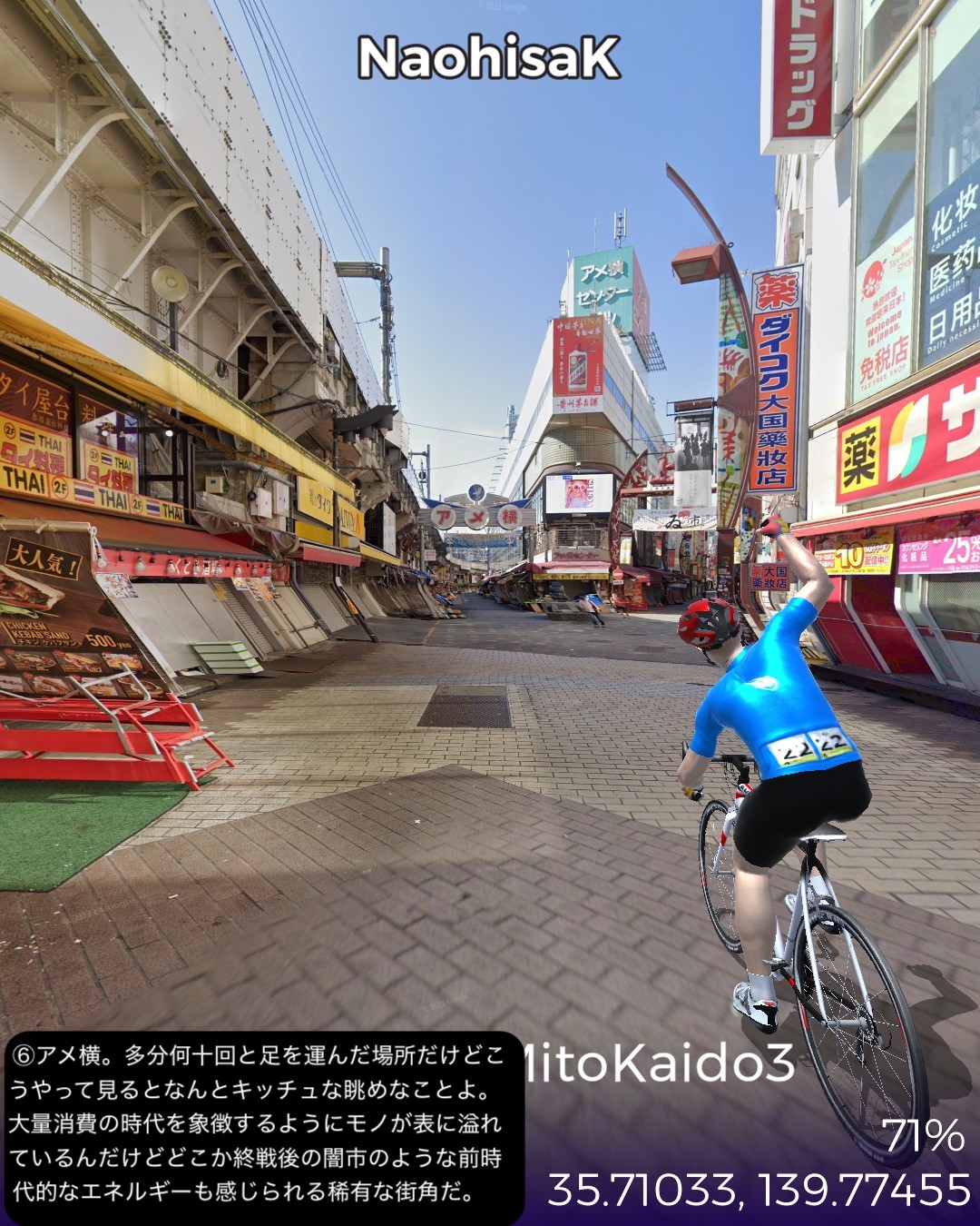 VRサイクリング 水戸街道3日目 江戸・東京への帰還の巻。手賀沼のほとり我孫子宿をスタートし、宿場ではない柏の雑踏を過ぎ、今は寂れているが昔は栄えていた宿場小金宿、今も昔も江戸・東京から江戸川を越えたゲートシティ松戸宿と常磐線に沿って走り、江戸川・荒川を越えて水戸街道の終点、日光街道からの追分のある千住宿へ到達。ここから先は例によって寄り道モードで江戸・東京で今まで巡っていない地点を結んで走る。いわゆる谷根千をぐるっと巡って上野、飯田橋・九段を抜け国会議事堂から赤坂、六本木、広尾と来て最後は目黒は目黒不動瀧泉寺をゴールとする55kmの行程。水戸街道の終盤、柏、松戸あたりは近郊にも関わらずリアルには今まで一歩も足を踏み入れたことのないエリア。そもそも子供の頃から東京に住んでいて四方八方飛び回ってきたのになぜか常磐線沿線だけは友人・親戚もいないし仕事や私用のネタもなく自分にとって唯一の未開の地だった。今回VRで走ってみて今まで漠と想像していたのと違う点は思ったよりずっと河川や沼に囲まれた地域であるな、というところかな。いずれにしても近郊を走っているのに離れた異郷に迷い込んだようなエキゾチズムがあってある意味興味深かった。そして今まで幾たびも通り抜けてきた江戸・東京であるが今回をもって最期とし、多分二度と戻ることはないと思う。よって、今まで通ってこなかった地区を繋げて、ゴールは昔の江戸市民の近場のリゾート地であった目黒としてみた。次回から新たな旅へスタートするまでしばらくバーチャルには江戸・東京で一休みの予定。(リアルにはどこかへ旅をしているのかもしれないが)
